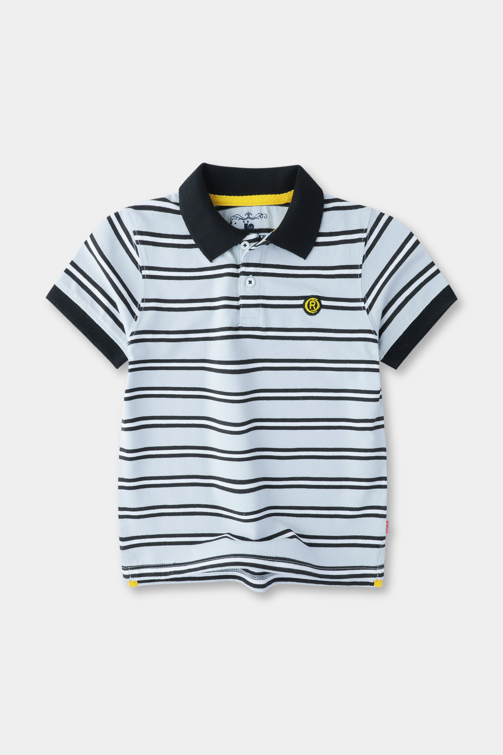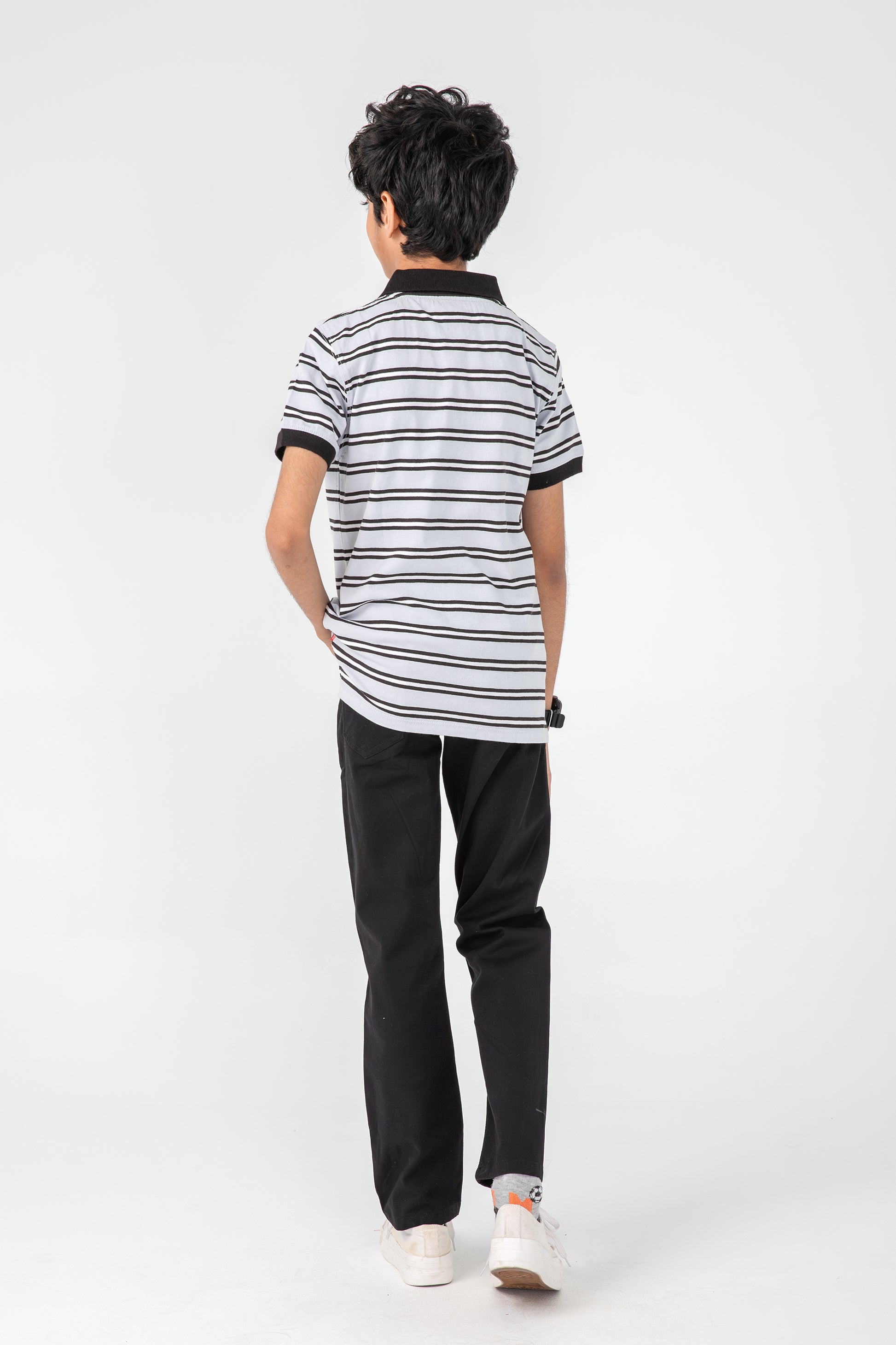 Effortless style: Our white & black yarn dyed jersey little boys' polo, featuring a rollover logo on the front, exudes casual sophistication.