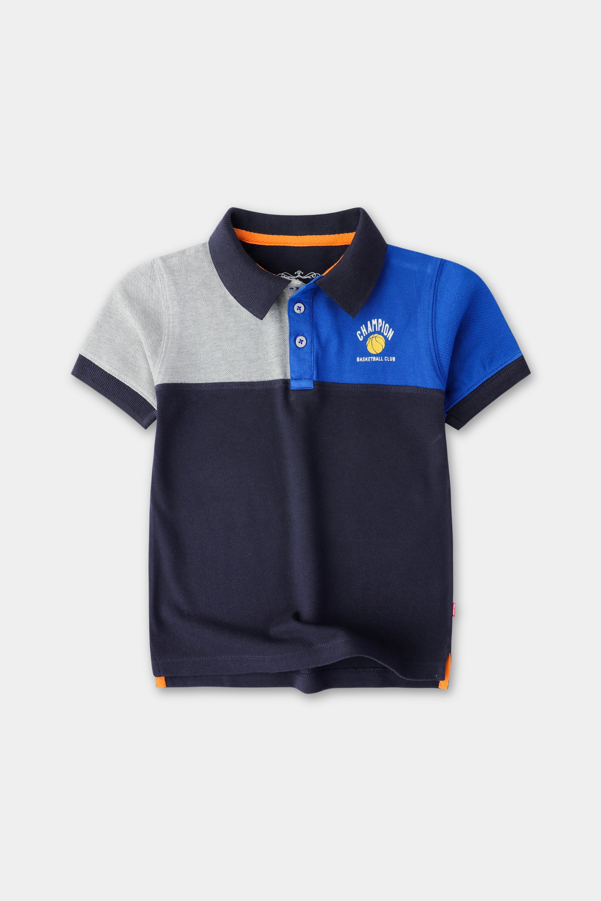 This polo shirt in navy blue pique features dynamic color-blocking with grey and royal blue panels. A bold yellow basketball emblem and "Champion" lettering add athletic flair. The structured collar, contrast buttons, and ribbed sleeves complete the look, a perfect for active days with a touch of cool confidence.