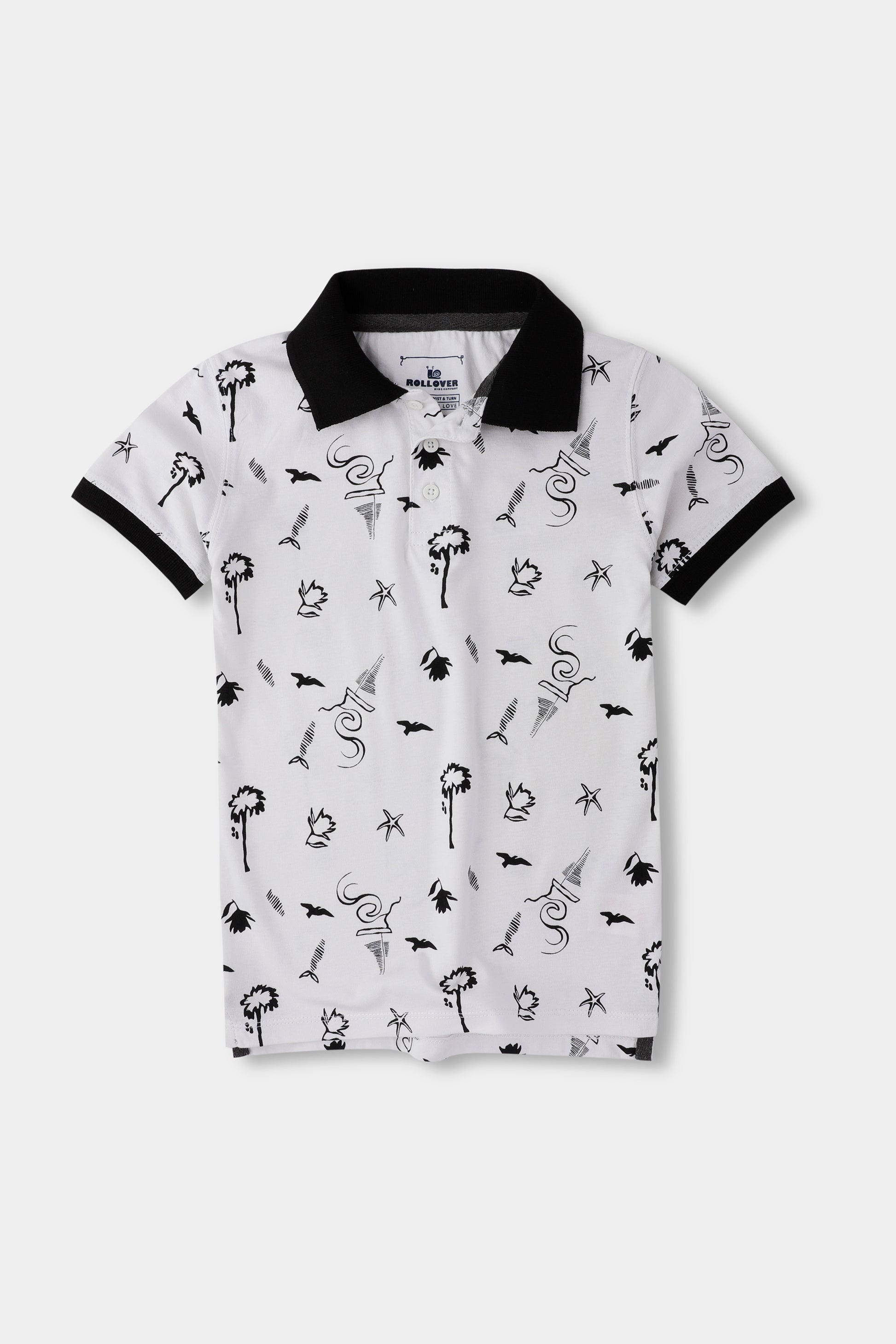 Elevate his casual style with this crisp white polo, featuring a playful black tropical print. Crafted from soft jersey fabric, it ensures all-day comfort, while the contrasting black collar and sleeve trims add a sophisticated touch. Perfect for outings, playdates, or casual gatherings, this polo blends style and ease.