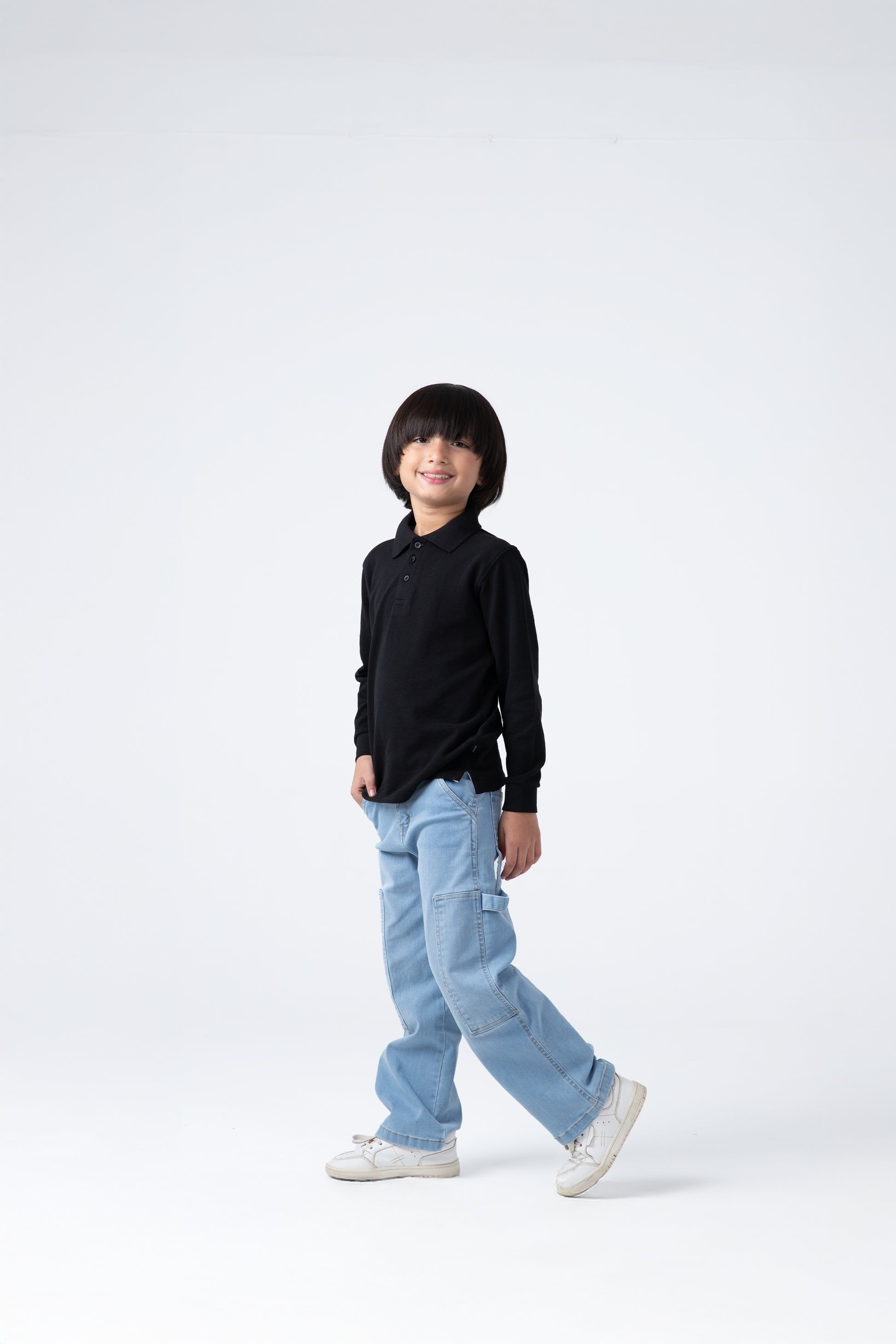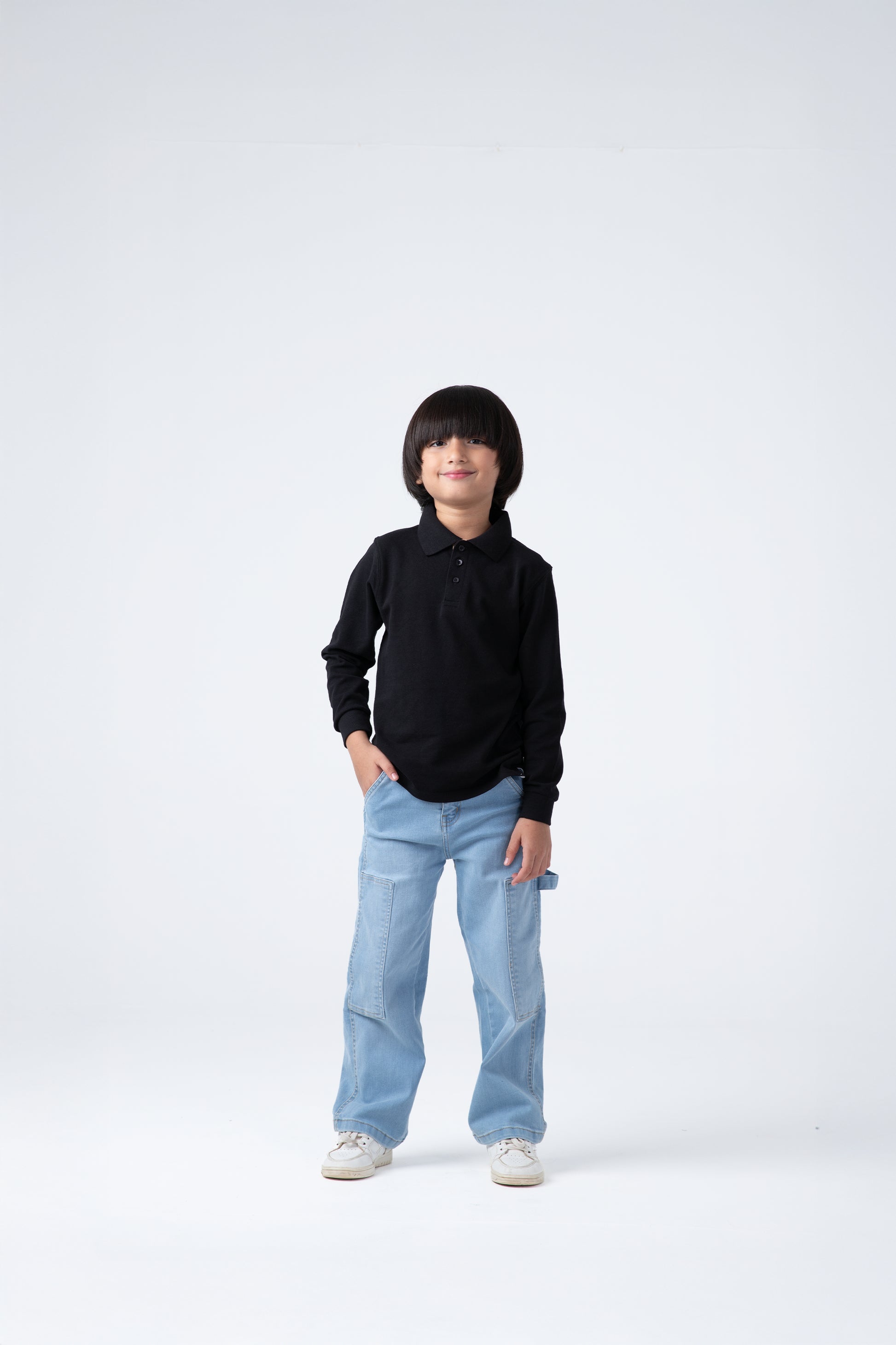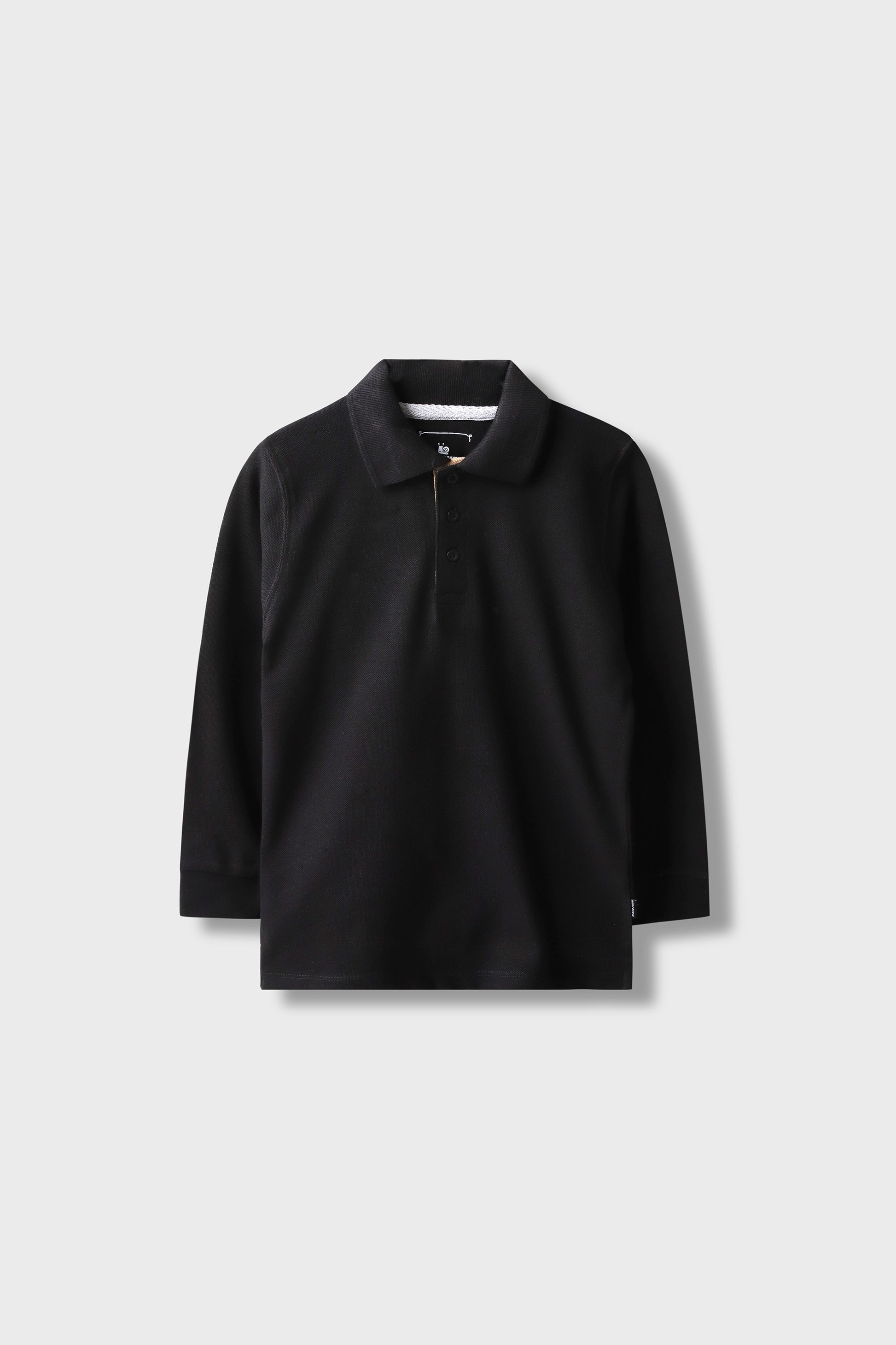 This black full-sleeve polo is tailored in breathable pique fabric for all-day comfort. Featuring a structured collar and button placket, it offers a polished look with a casual feel. Ideal for school days or smart outings, it blends everyday ease with a refined finish that every young boy deserves.
