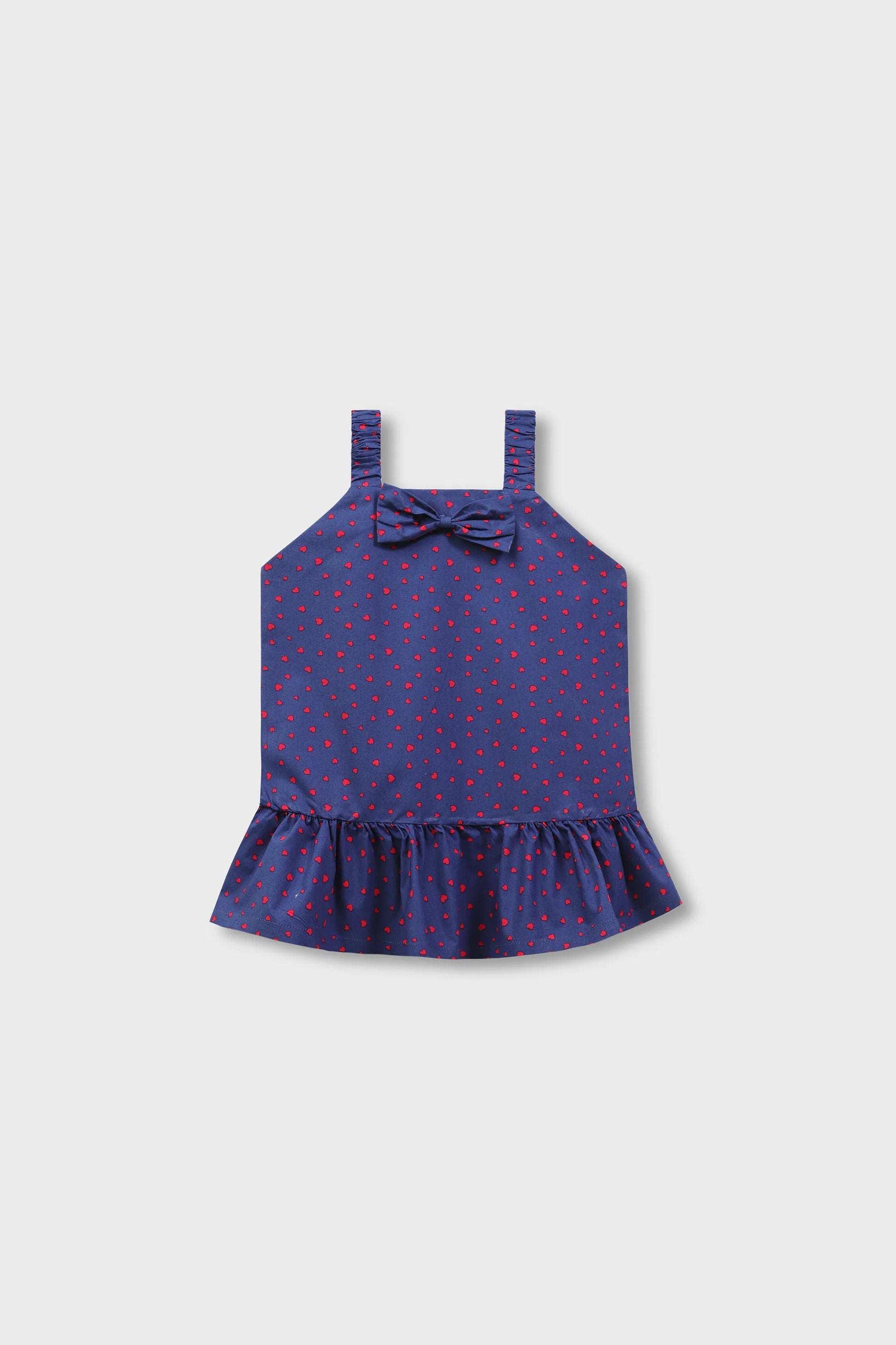 This sleeveless navy cotton dress features a charming red heart print and a playful flared hem. The bow detail at the neckline adds a cute touch, while the soft cotton fabric ensures comfort and breathability. Perfect for casual days or weekend outings with a cheerful twist.