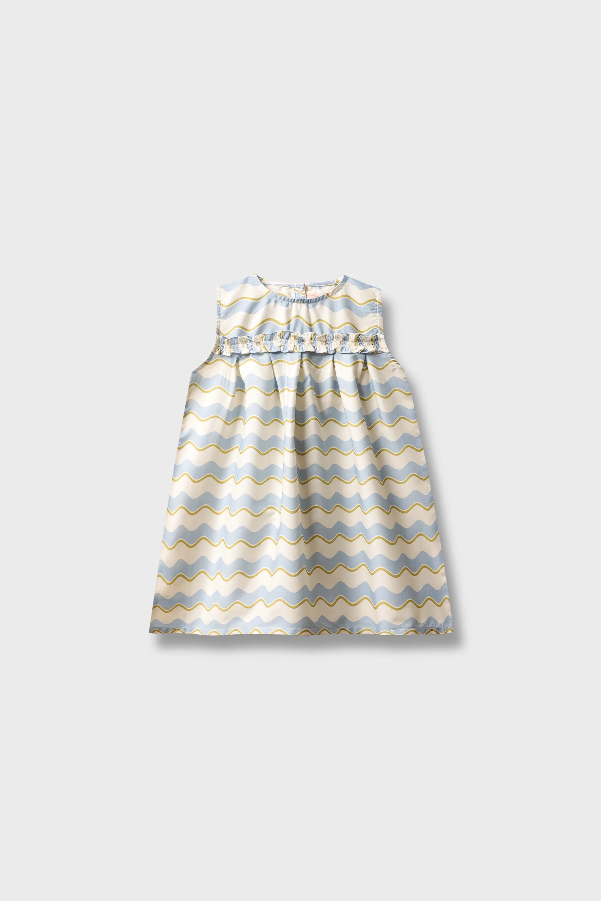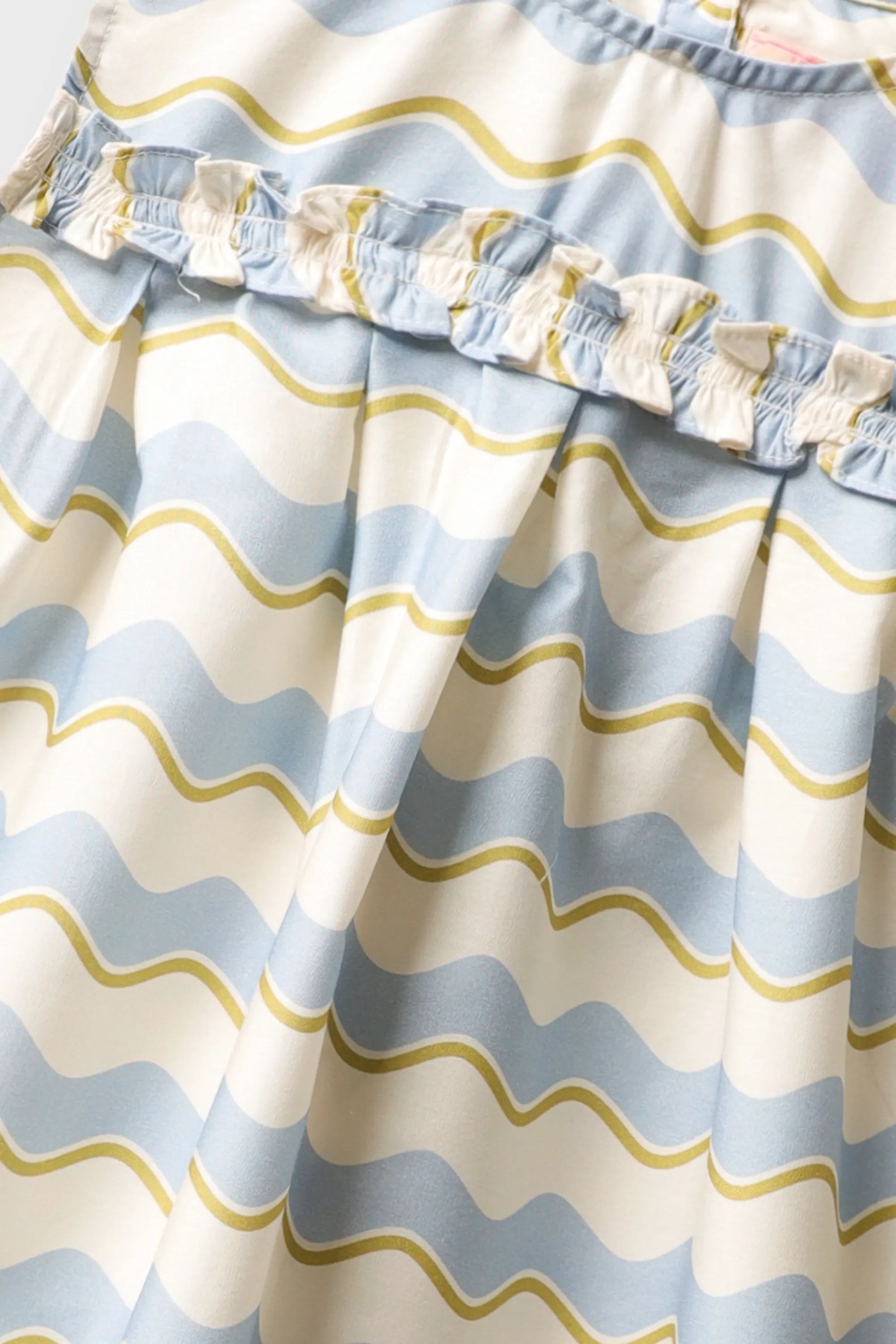 Whimsical waves meet everyday style in this ultra-soft cotton dress. The pastel blue and olive-green print dances across a full-bodied skirt and sleeveless bodice, making it a cheerful pick for bright mornings and afternoon adventures. Light, lively, and effortlessly cute — fashion for little free spirits on the move.