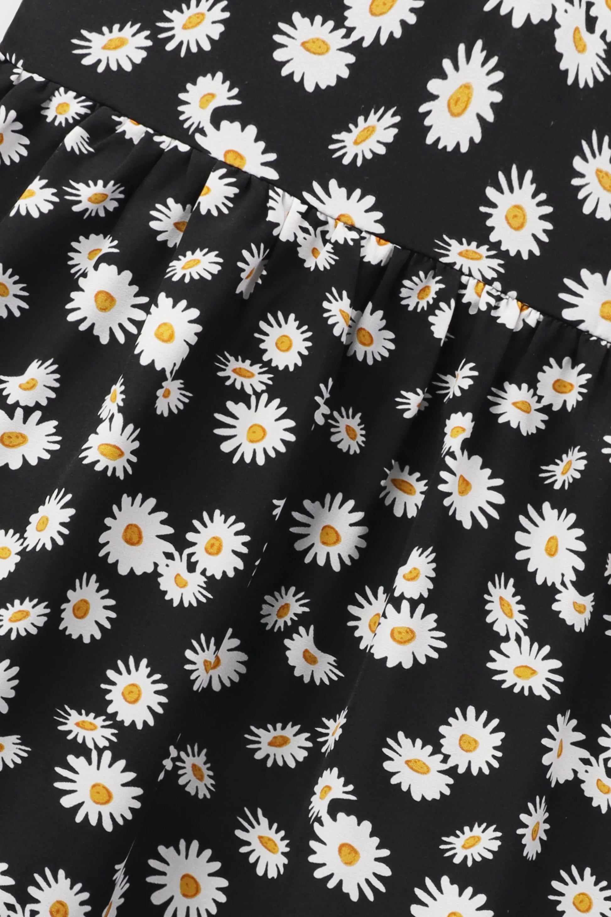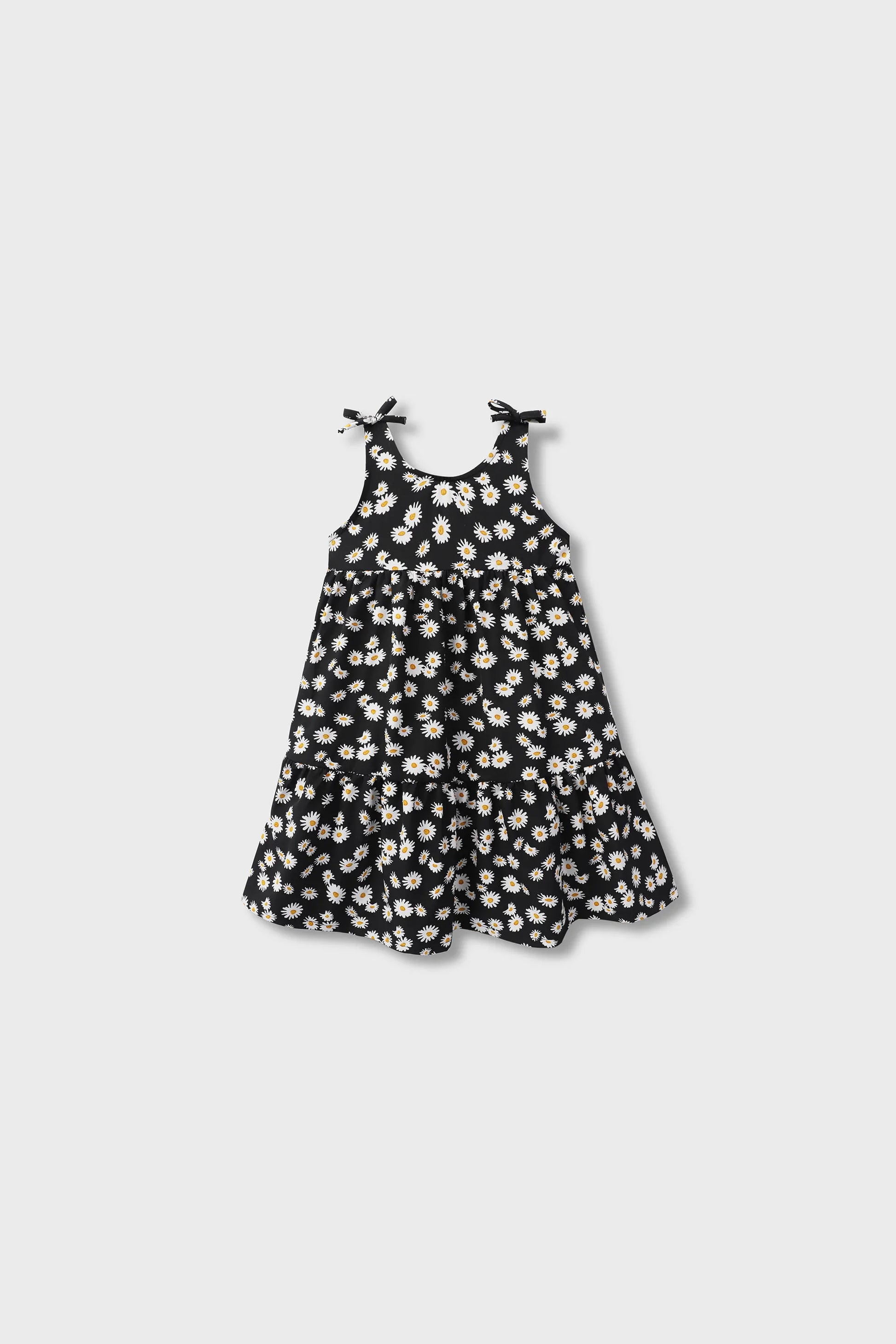 This charming daisy-printed cotton dress is designed for everyday comfort and cuteness. The soft black fabric features bright white and yellow daisies that stand out beautifully. Shoulder tie straps add adjustability, while the gathered skirt offers a lovely flare. Lightweight, breathable, and perfect for summer outings and casual wear.