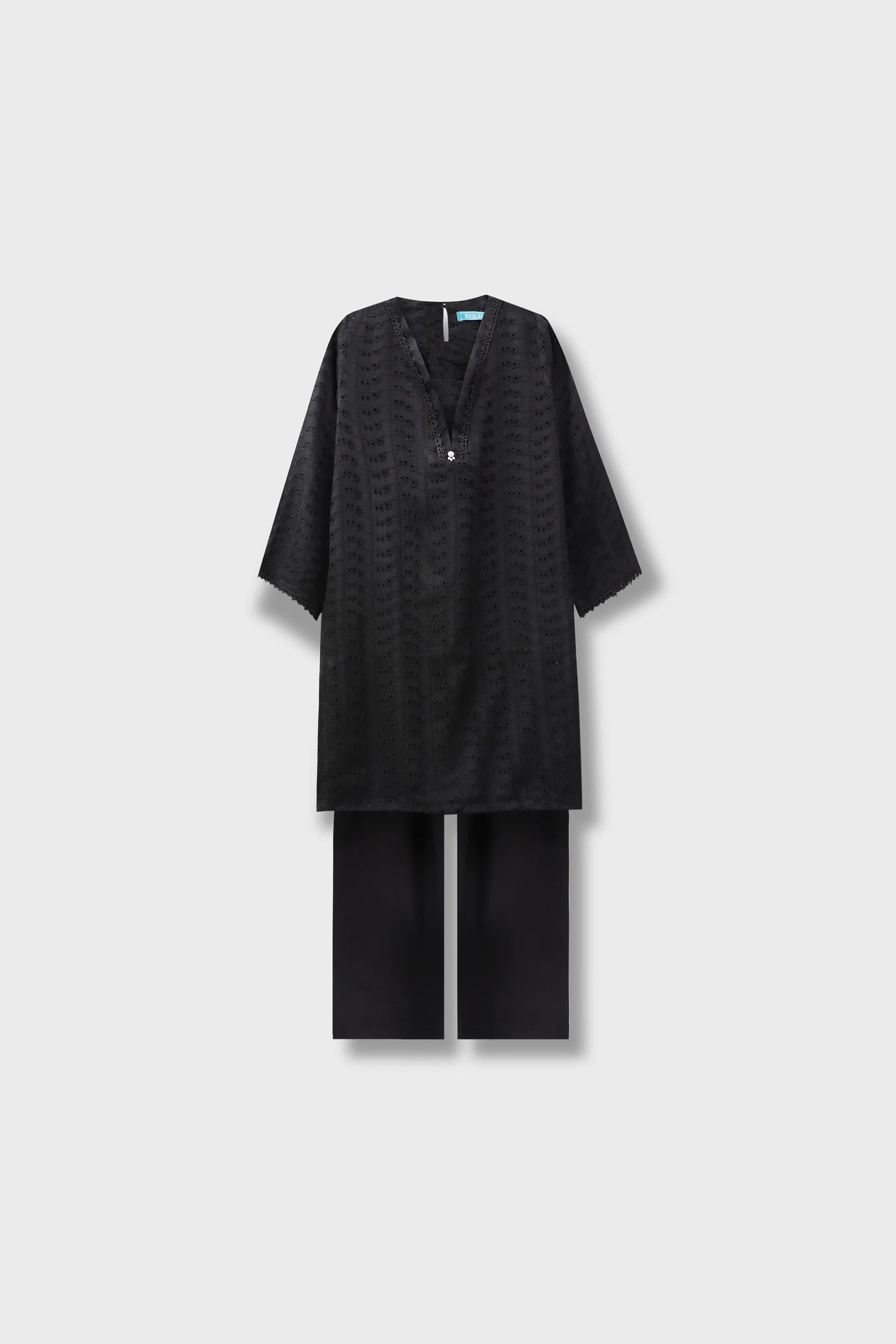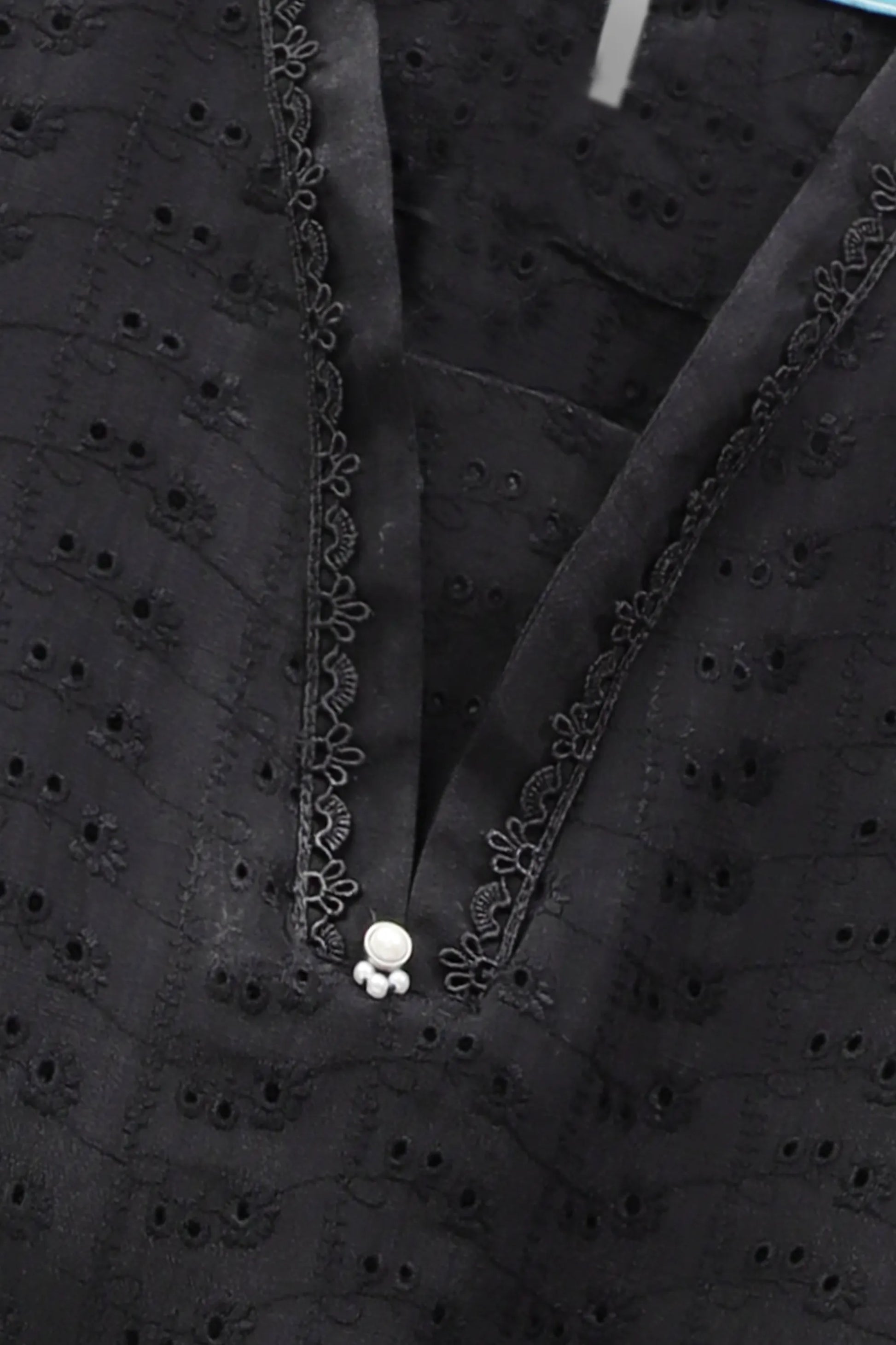 A timeless 3-piece set in elegant black. The kurta features bell sleeves in malai chikankari with delicate lace trims and pearl detailing at the neckline. Paired with a strappy attal inner and flared cambric trousers, this look balances traditional grace with modern ease — perfect for casual chic moments.