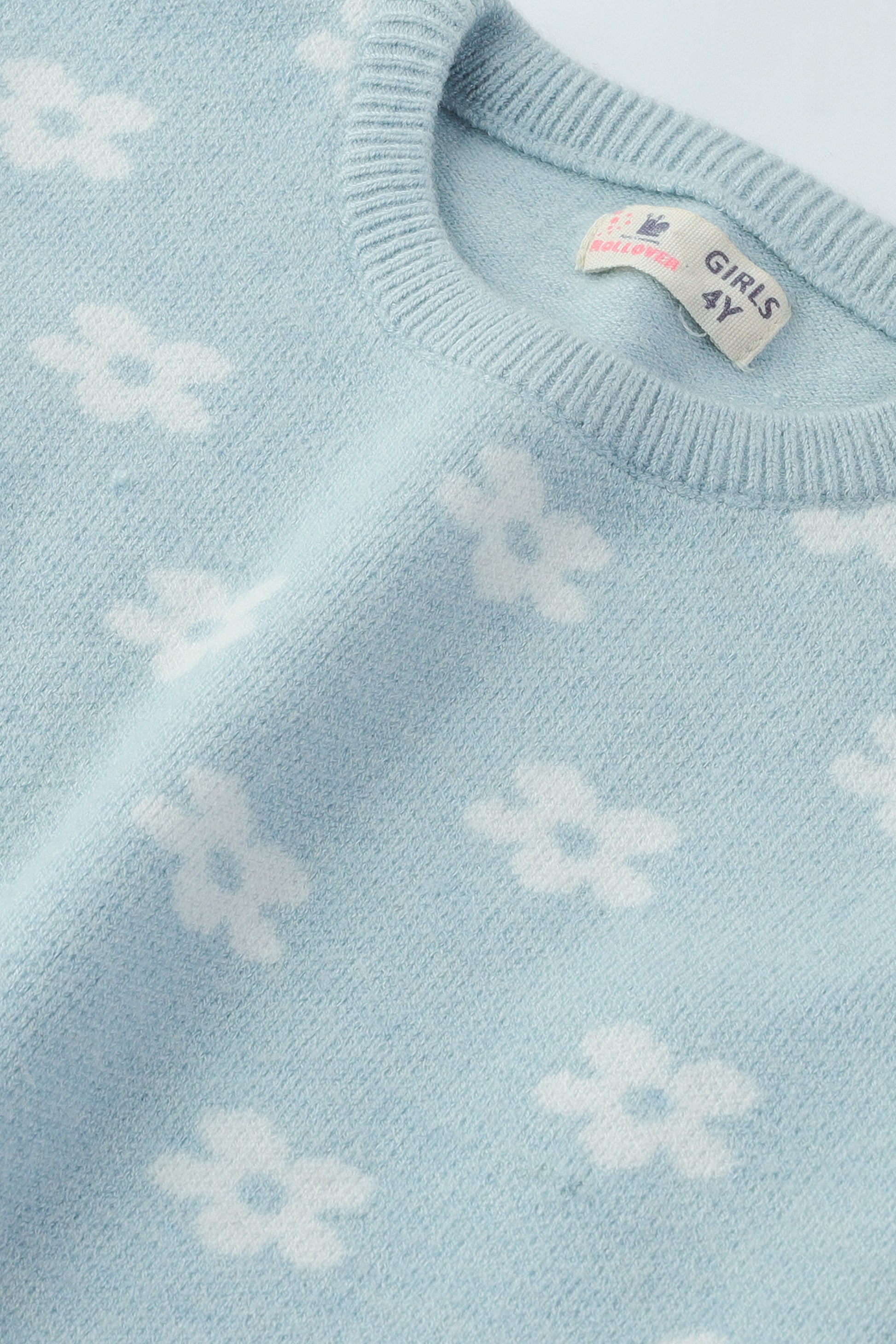 This charming girls' wool sweater in soft sky blue brings warmth and style with an all-over floral print. Crafted from cozy wool, it's perfect for chilly days while adding a playful touch with its delicate blossoms. The sweater features a comfortable round neck and ribbed cuffs for a snug fit. Ideal for pairing with jeans or skirts.