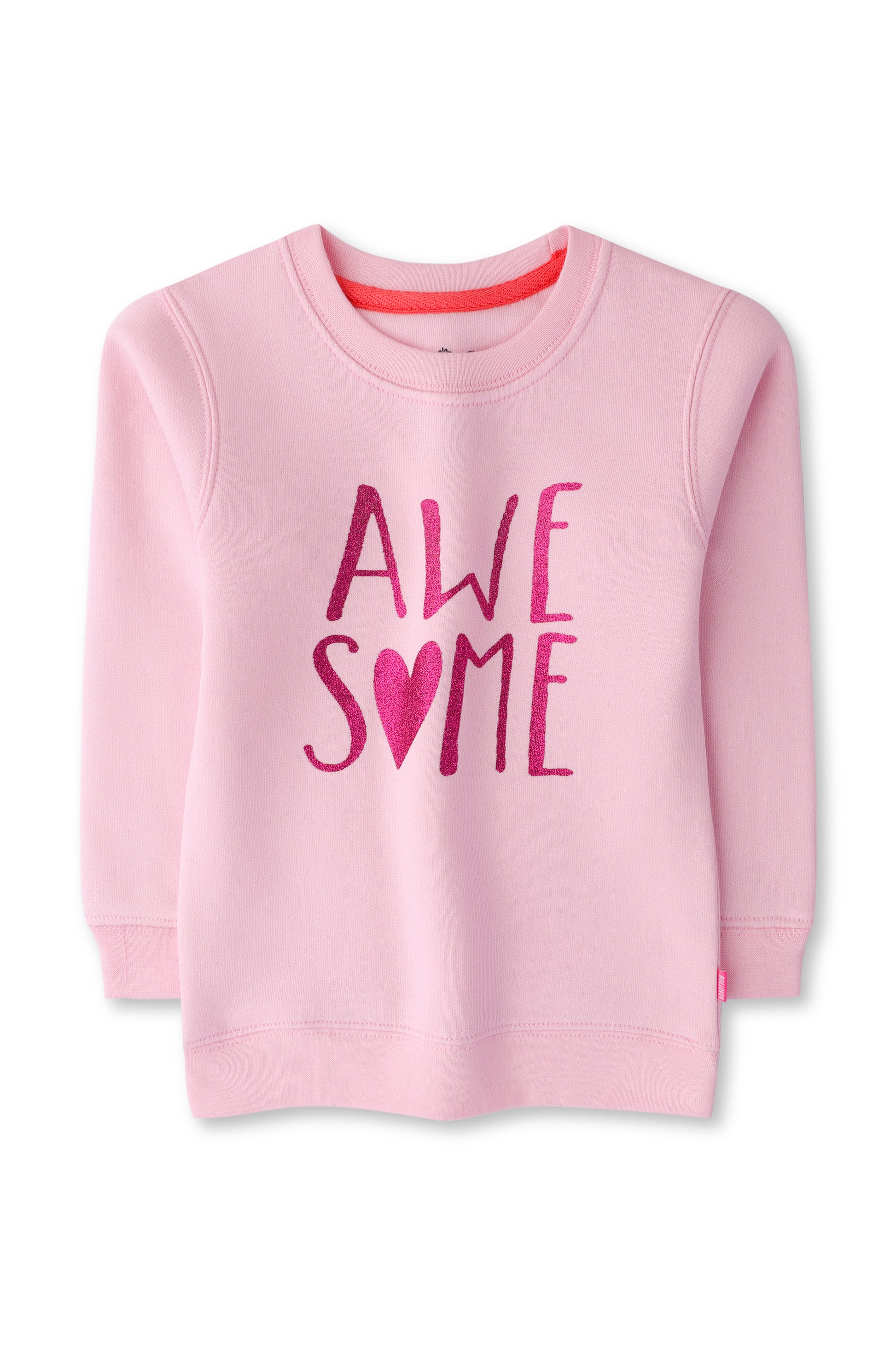 Girls Glitter Pink Fleece Sweatshirt - Stay cool and comfy in this light pink sweatshirt. It features crew ribbed neck, sleeves cuffs and straight hem. Glitter print of glitter text in fushcia pink 'Awesome' on the front body.