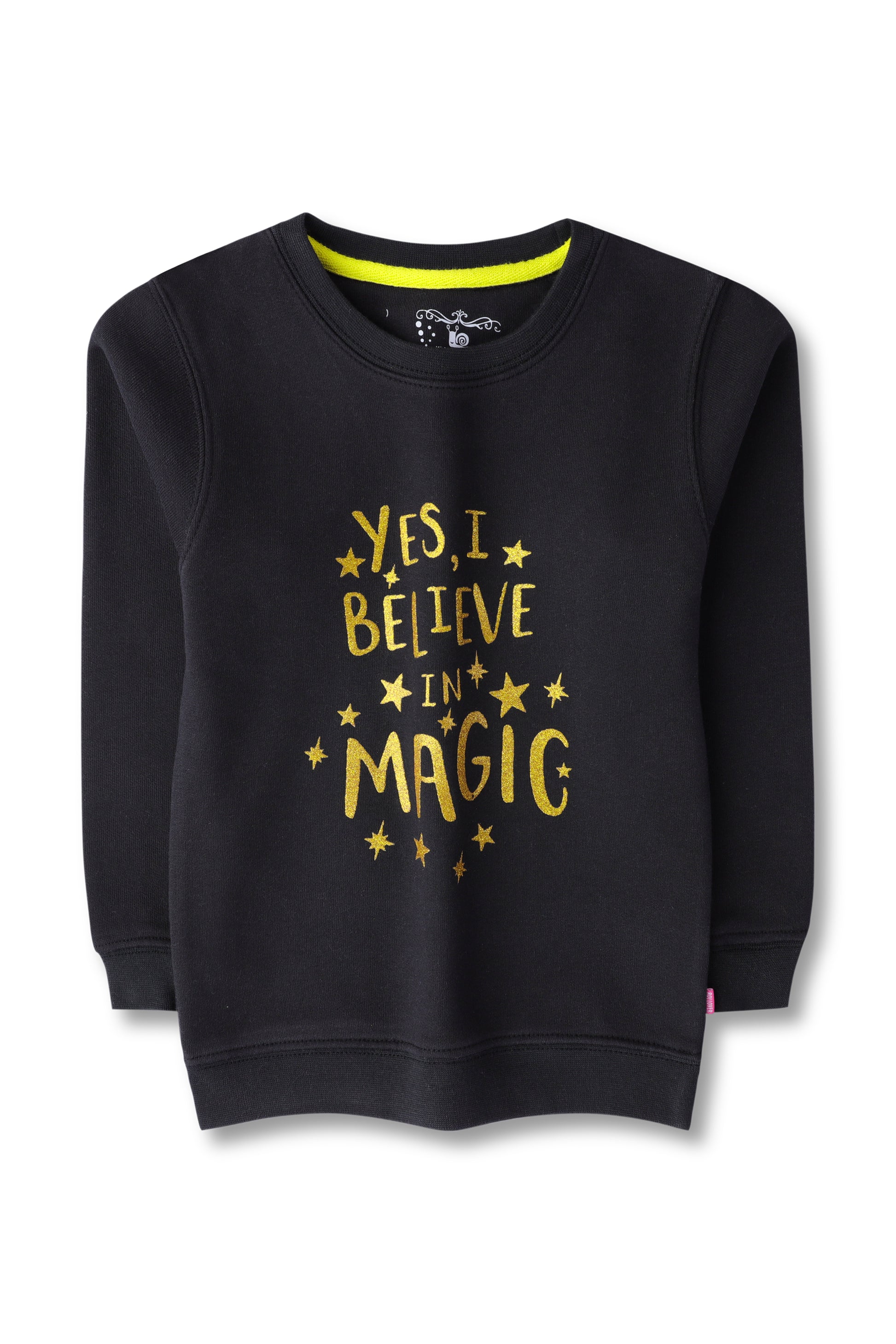 Girls Black Terry Sweatshirt: Keep your little one warm and stylish with this black sweatshirt made from cozy terry fabric. It has round crew ribbed neck, straight ribbed hem, and ribbed cuffs on full sleeves. The graphic text 'Yes, I Believe in Magic' in gold.