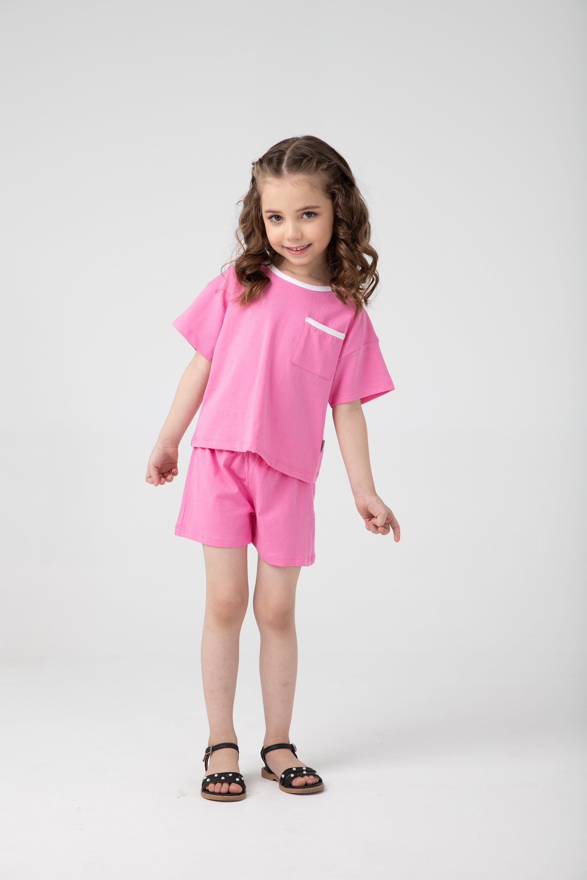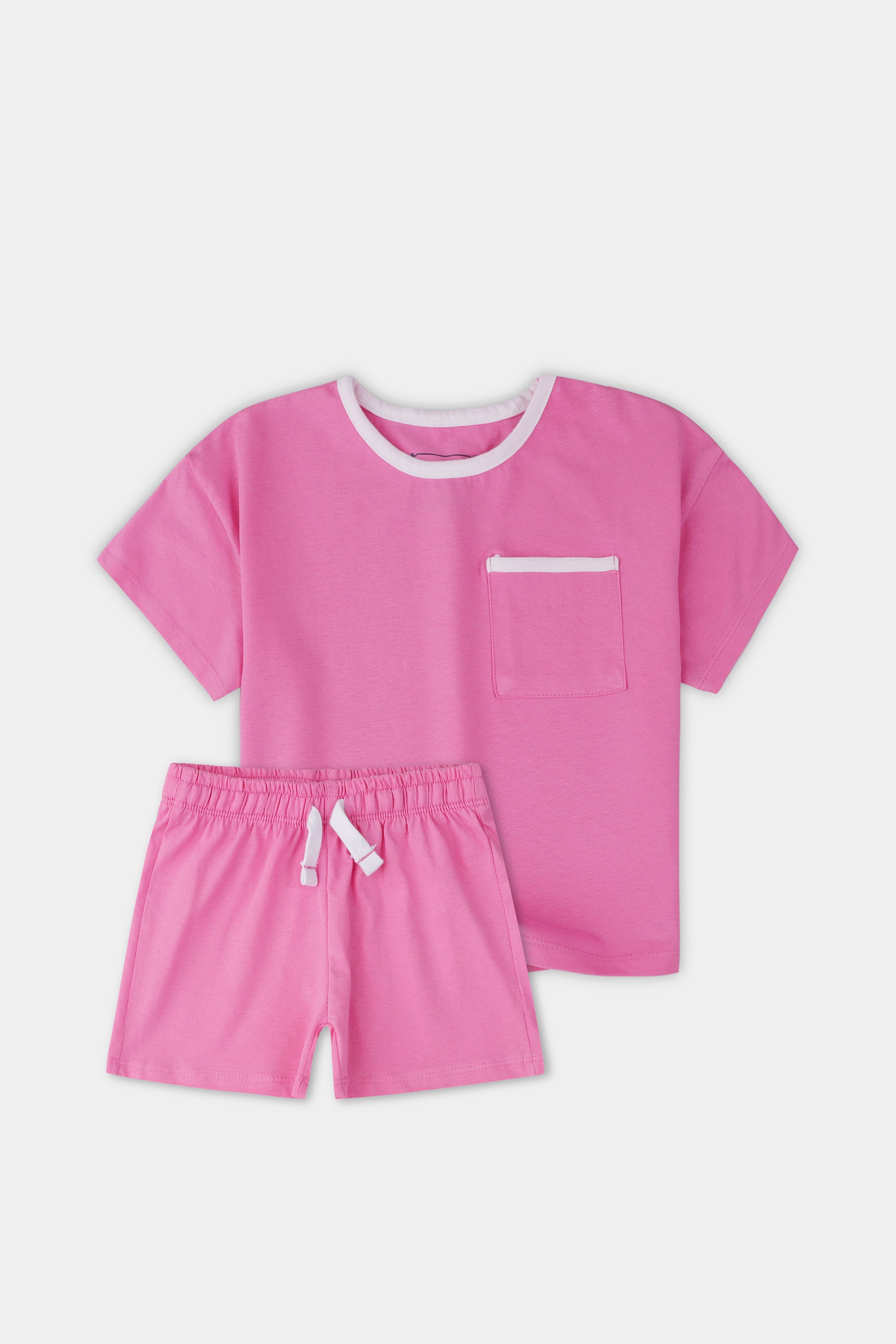 Brighten up her casual days with this adorable pink co-ord set. Featuring a boxy-fit tee with white contrast neckline and chest pocket piping, and matching drawstring shorts with a comfy elastic waist. Soft jersey fabric makes it perfect for sunny strolls and indoor lounging.