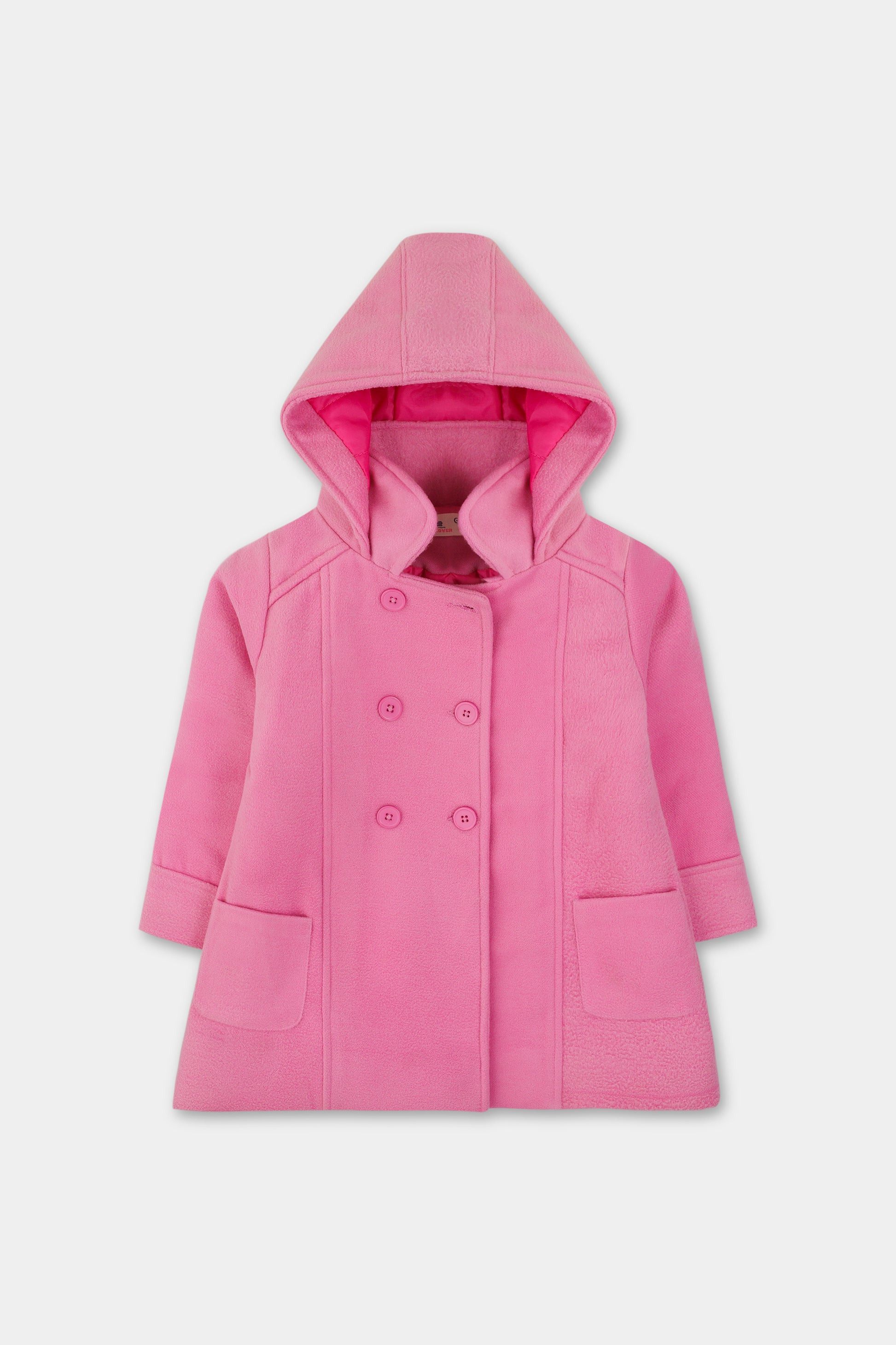 This charming girl's coat is crafted from soft pink felt fabric featuring a functional hood, classic collar, and a double-button placket, it’s designed for both comfort and style. Full sleeves and a straight hem ensure a clean, modern silhouette. Cut-and-sew side panels add structure, while the convenient pockets make it perfect for everyday wear.