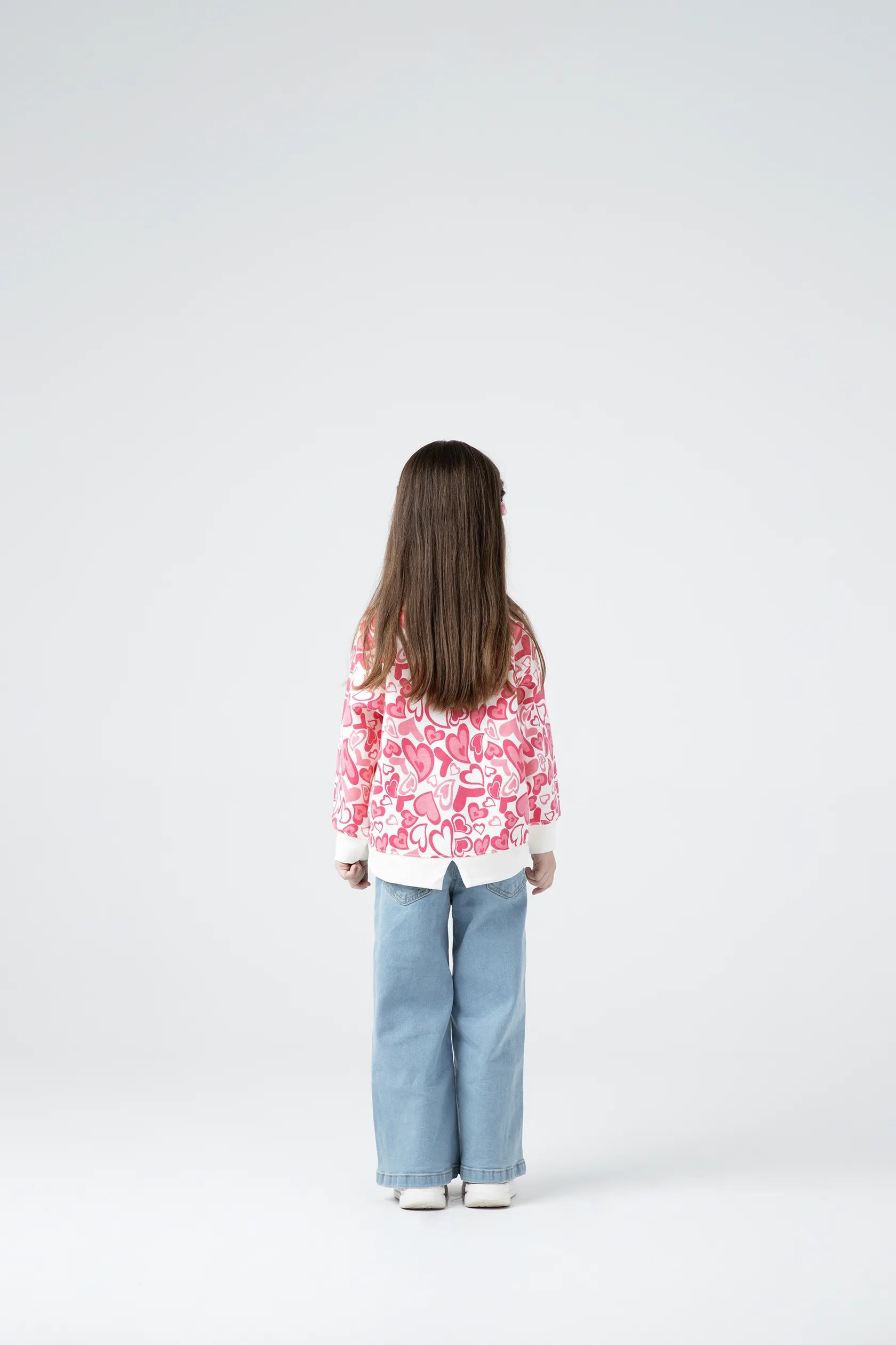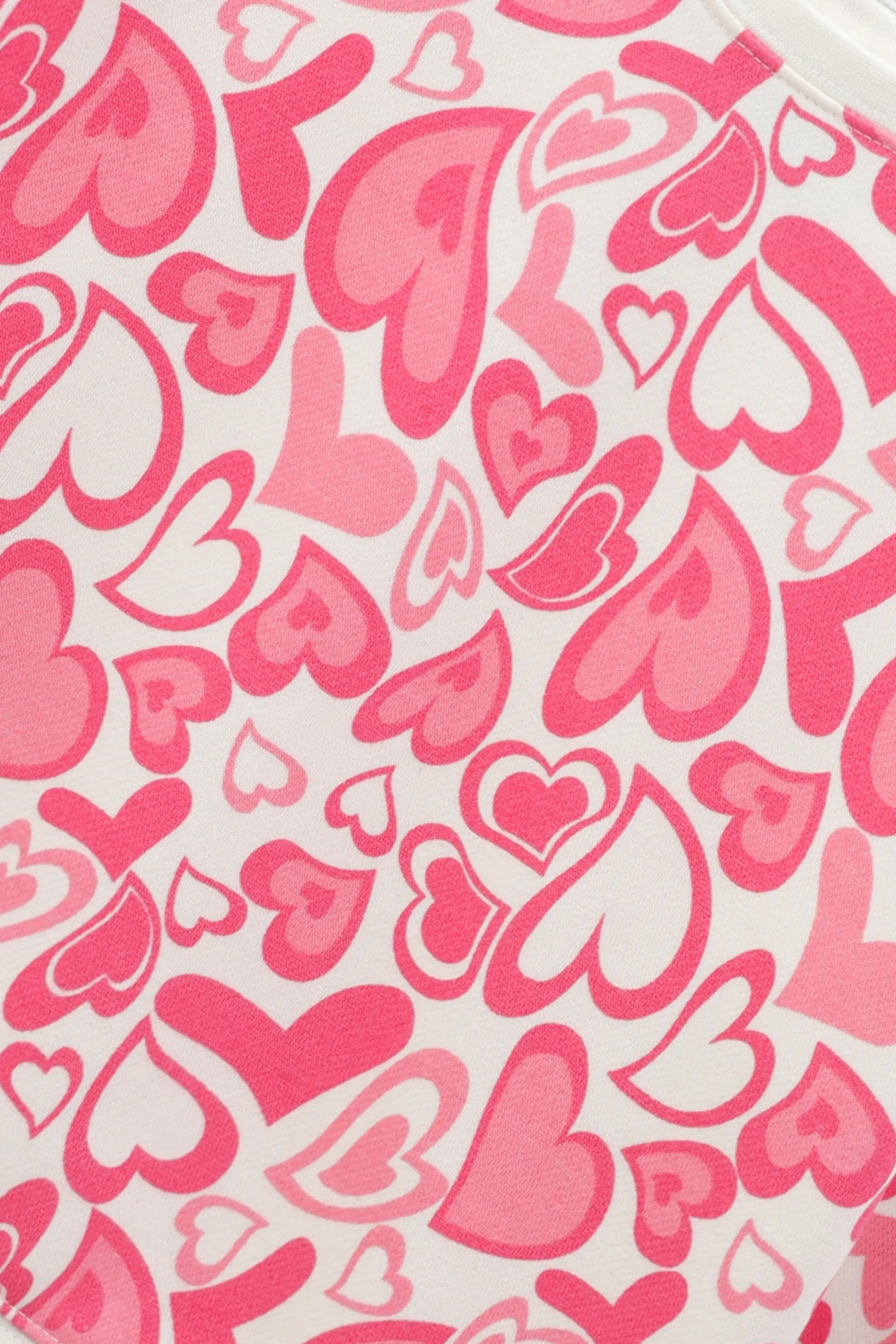Wrap her in warmth and whimsy with this heart-print fleece sweatshirt. The high-low hem with a stylish back slit adds a playful twist. Designed in a cozy off-white base with pops of pink, it's perfect for cool days, layering, or just spreading love with every step she takes.