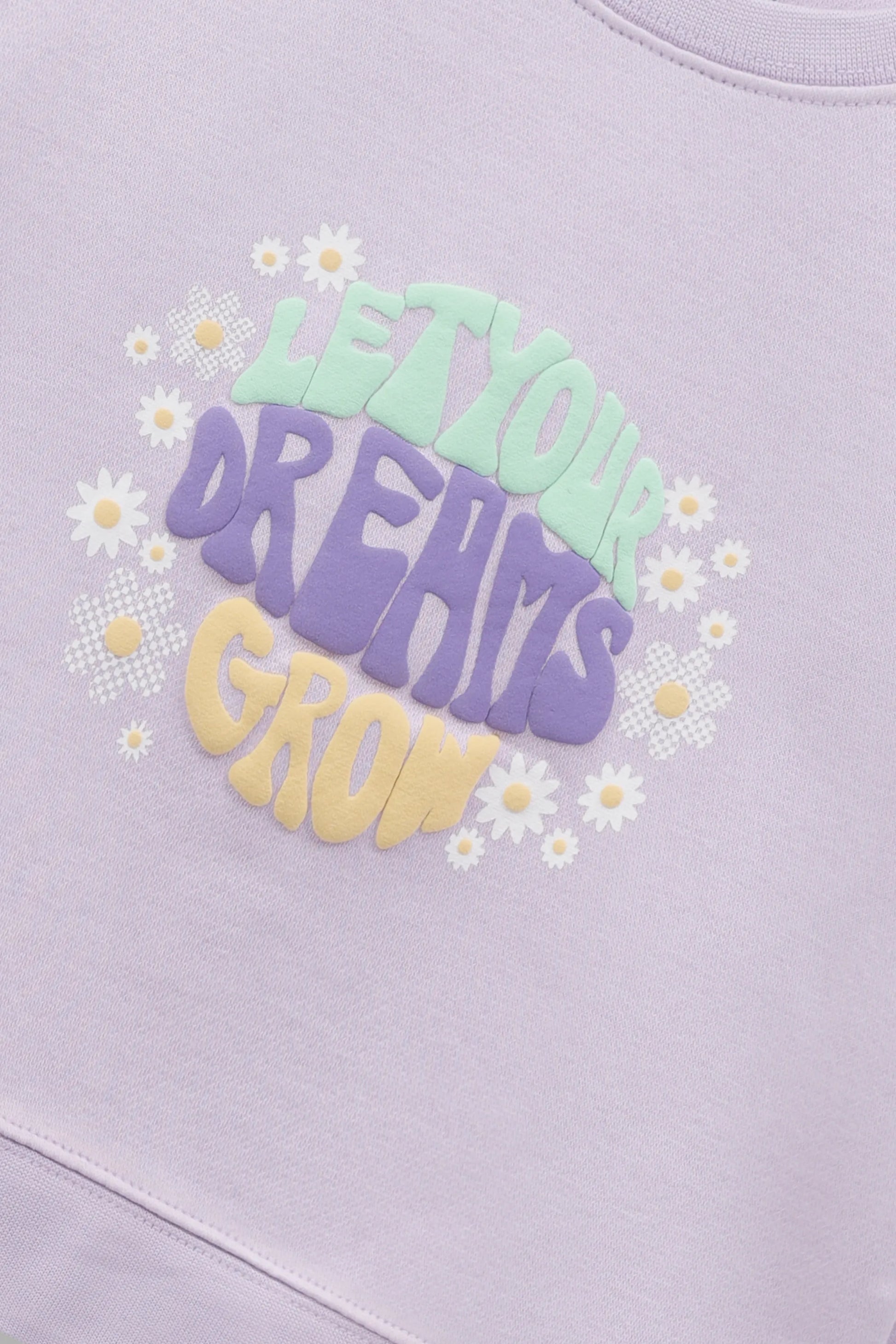 Stay cozy and cool in this lilac cropped sweatshirt, crafted from plush fleece for all-day comfort. The drop shoulders give it a relaxed fit, while the playful graphic print adds a dose of charm. A dreamy layer for little fashionistas who love to mix comfort with cheerful energy.