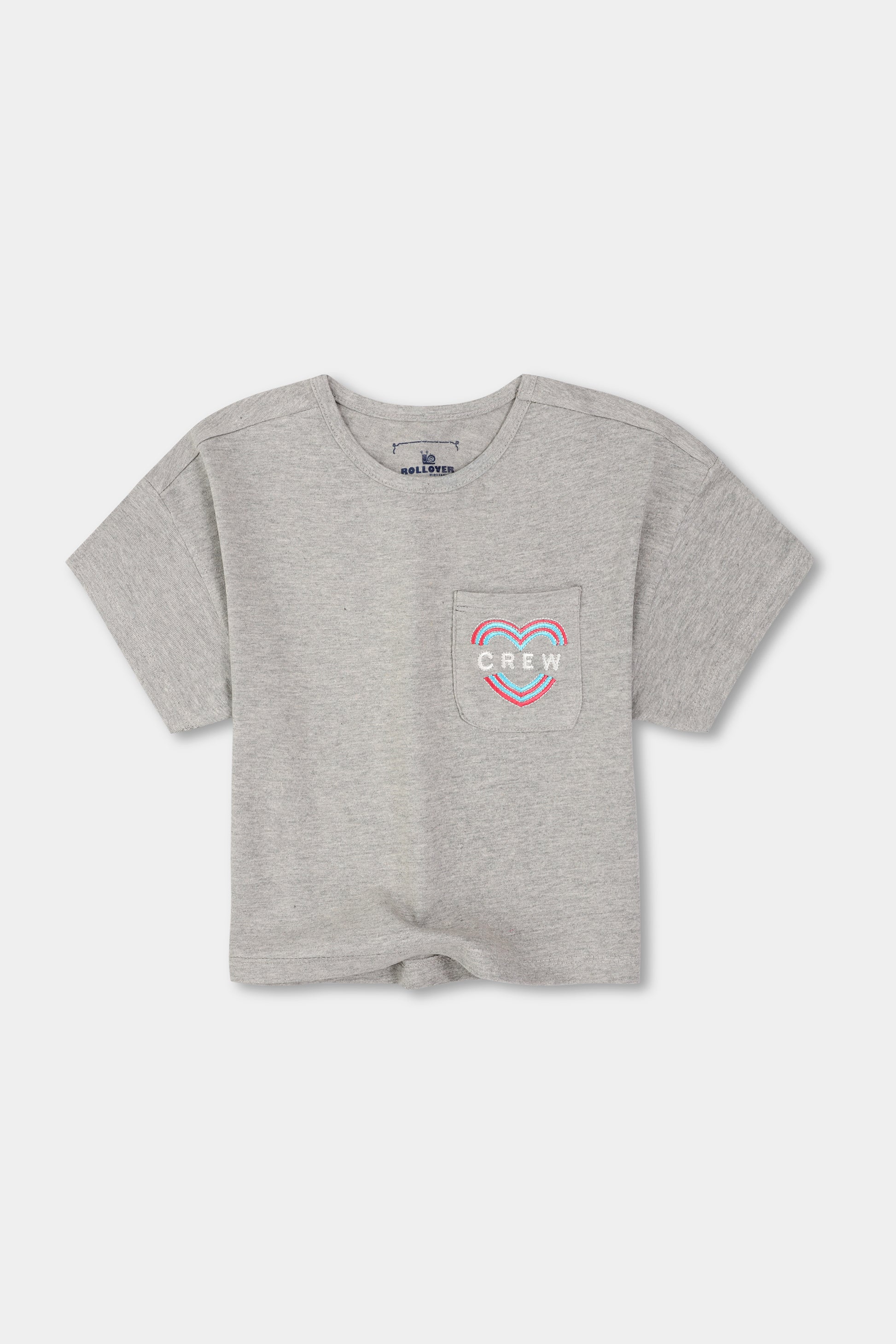 Effortlessly stylish, this grey drop-shoulder T-shirt is all about comfort and charm. The embroidered heart and "CREW" detail on the pocket add a trendy touch. Made from soft jersey fabric, it's perfect for everyday wear, whether lounging at home or hanging out with friends.