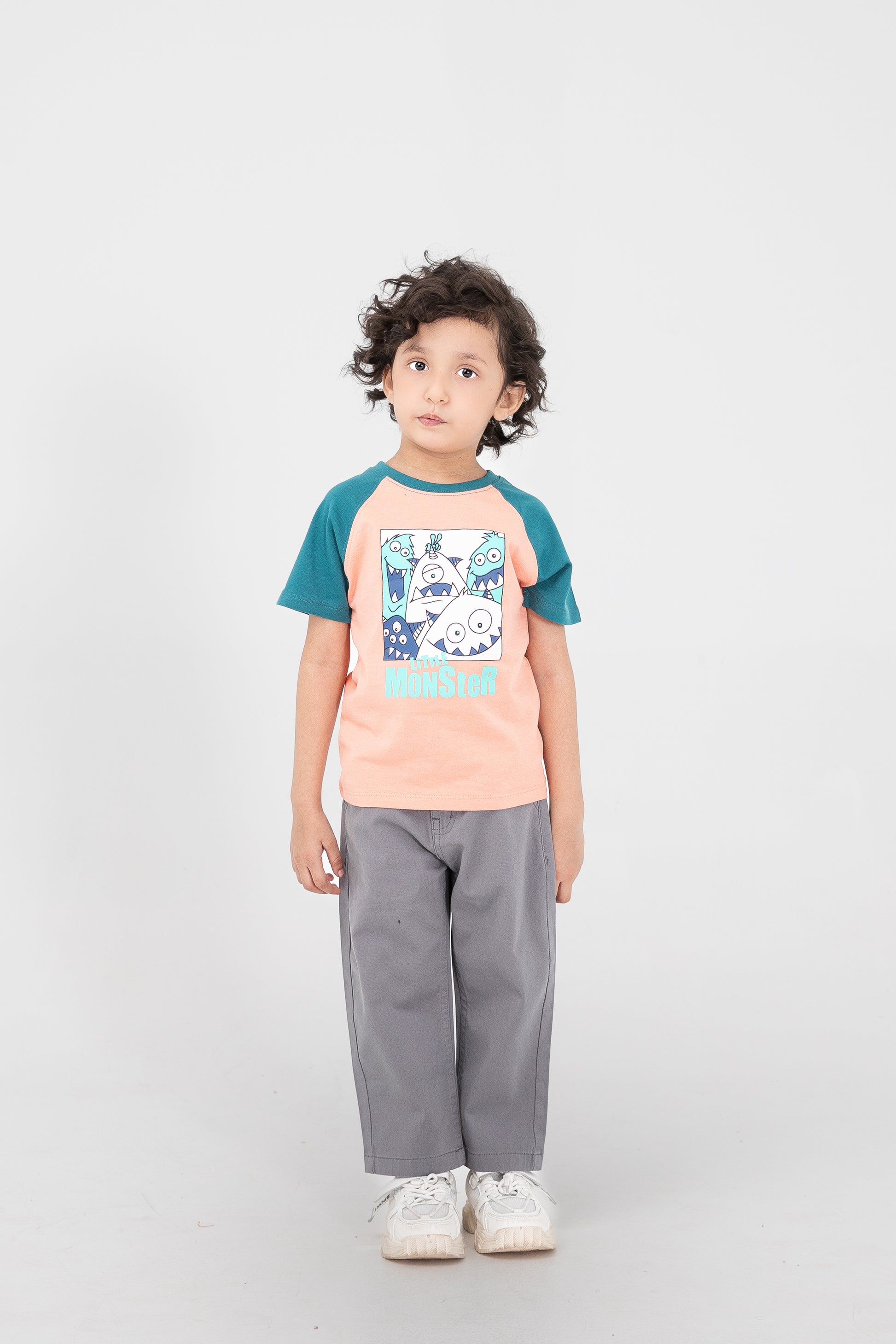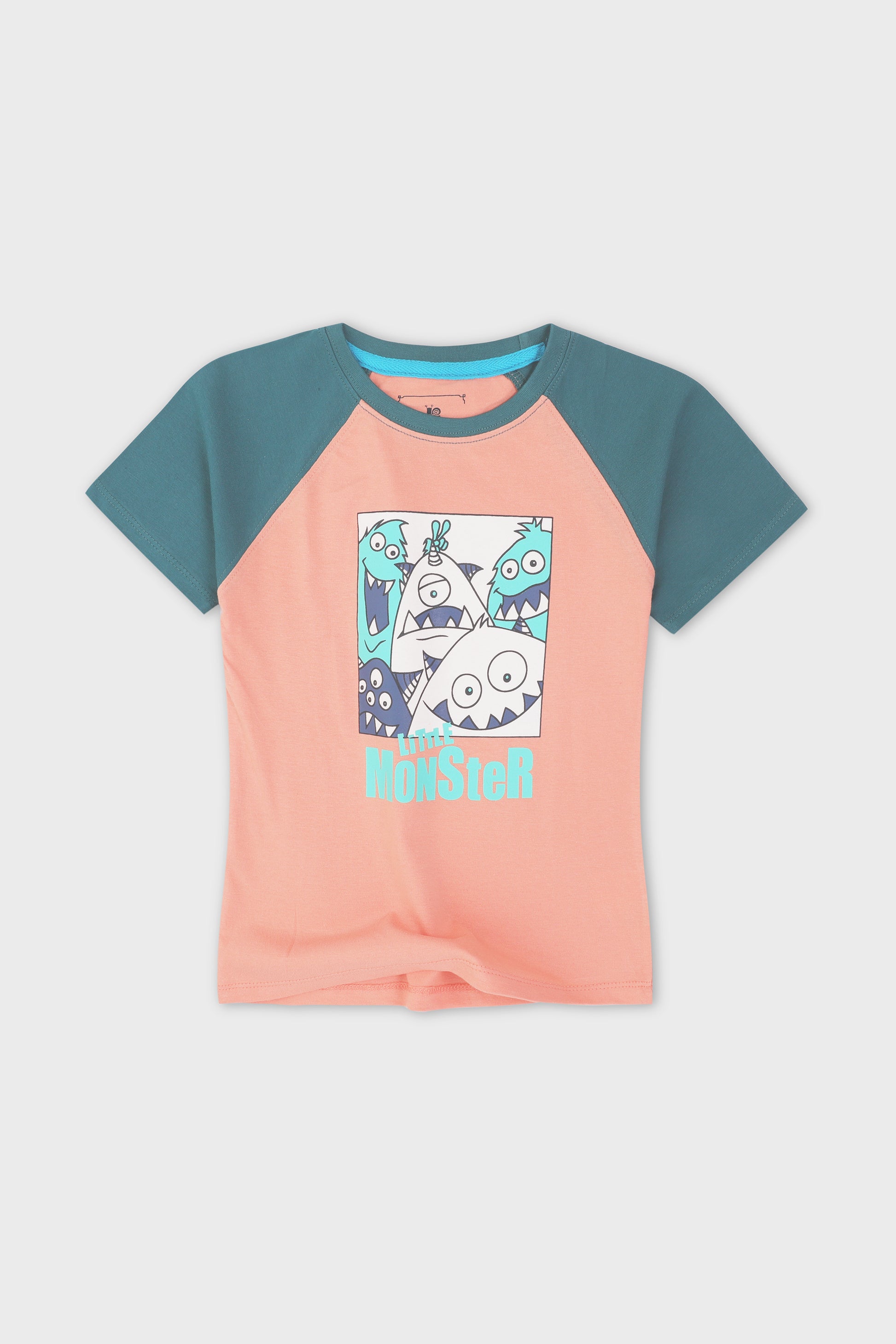 Make every day an adventure with this vibrant coral T-shirt! Designed with bold monster graphics and contrast raglan sleeves, it’s perfect for active kids. Made from soft jersey fabric, it’s lightweight and breathable for all-day comfort. Pair it with joggers or denim for a cool and playful look.