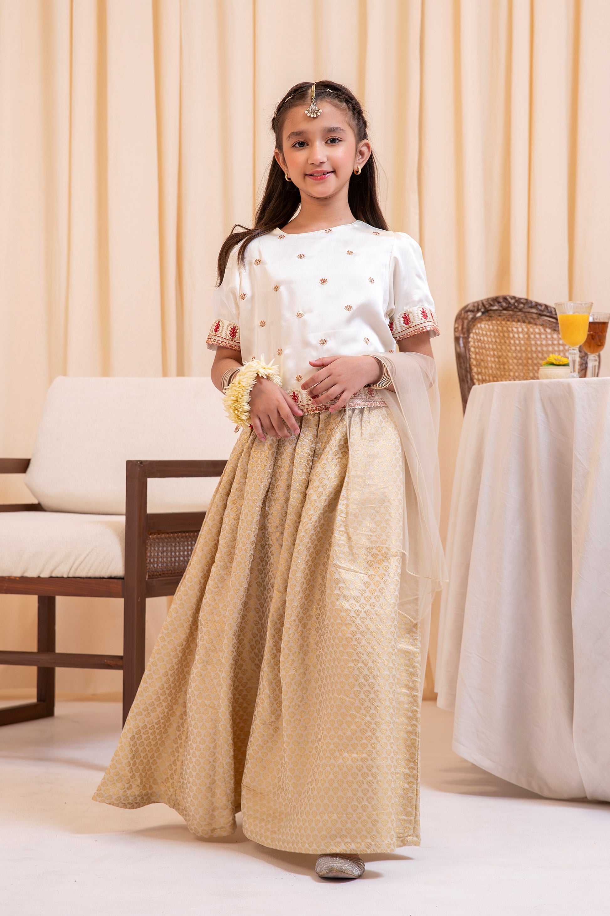 Dress your little one in this exquisite off-white silk kurti paired with a golden jamawar lehenga. The kurti features delicate tilla embroidery and fancy lace on the sleeves, adding a regal touch. Completed with a net dupatta, this ensemble is perfect for festive occasions and weddings.