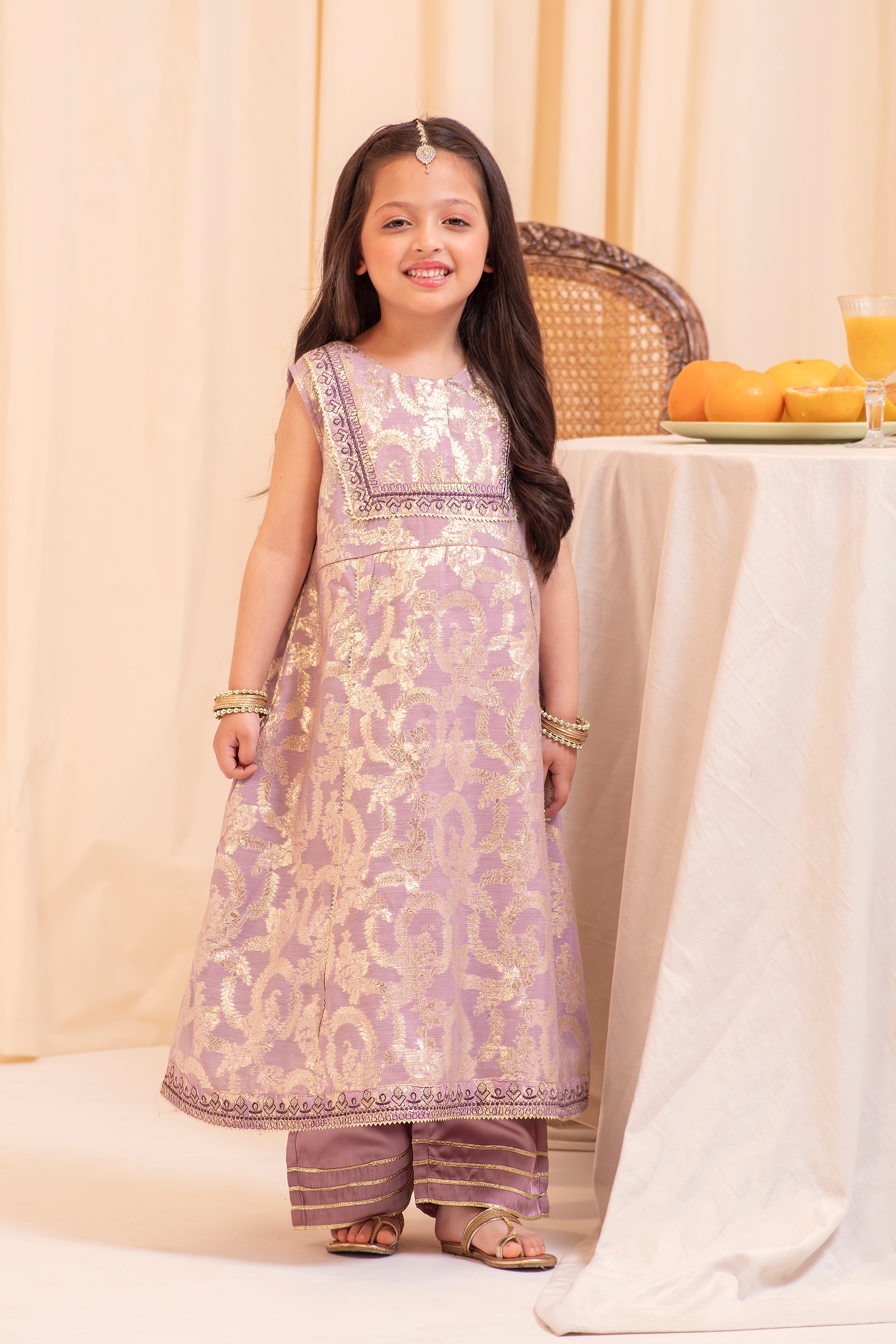 Drape your little one in elegance and charm with this luxurious 3-piece suit. The lilac Lorex jacquard shirt is adorned with intricate embroidery and fancy lace, perfectly complemented by a shamooz silk trouser. A dark purple chiffon dupatta adds a regal touch, making it ideal for festive occasions.