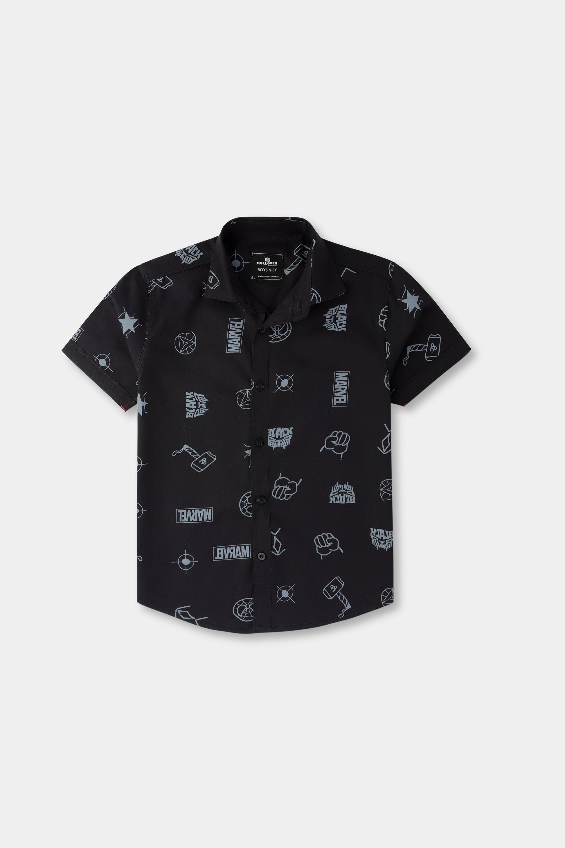 Let him showcase his love for superheroes with this trendy black cotton shirt. Featuring iconic Marvel logos and superhero symbols, this short-sleeve button-up is perfect for young fans. Crafted from soft, breathable fabric, it ensures all-day comfort while keeping him stylish on any casual occasion.