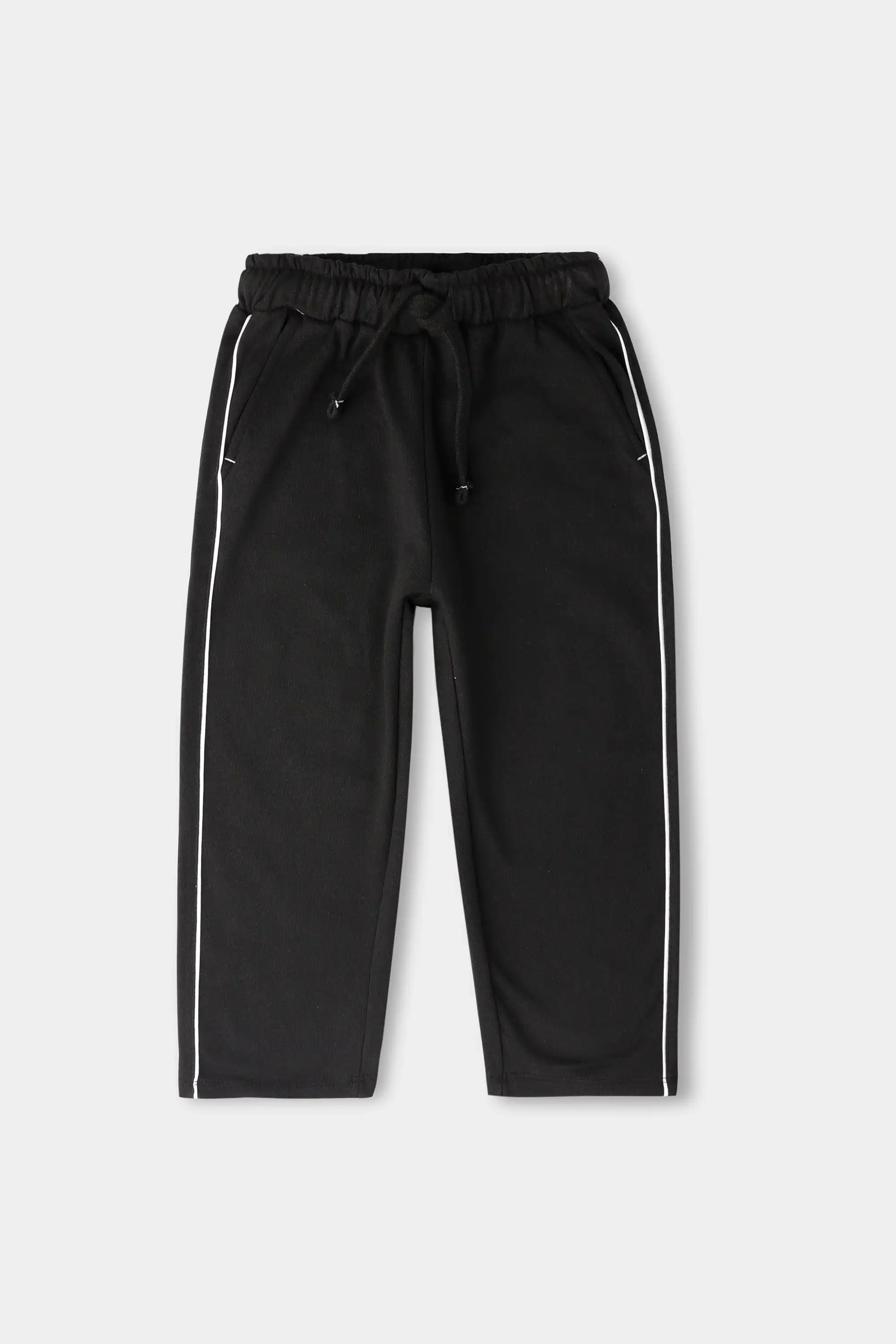 Crafted from soft terry fabric, these black trousers combine comfort with style. Featuring clean side piping that adds a sporty edge, they offer a relaxed yet tapered fit. Ideal for active days or lounging in style, the elastic waistband ensures a snug, flexible wear all day.