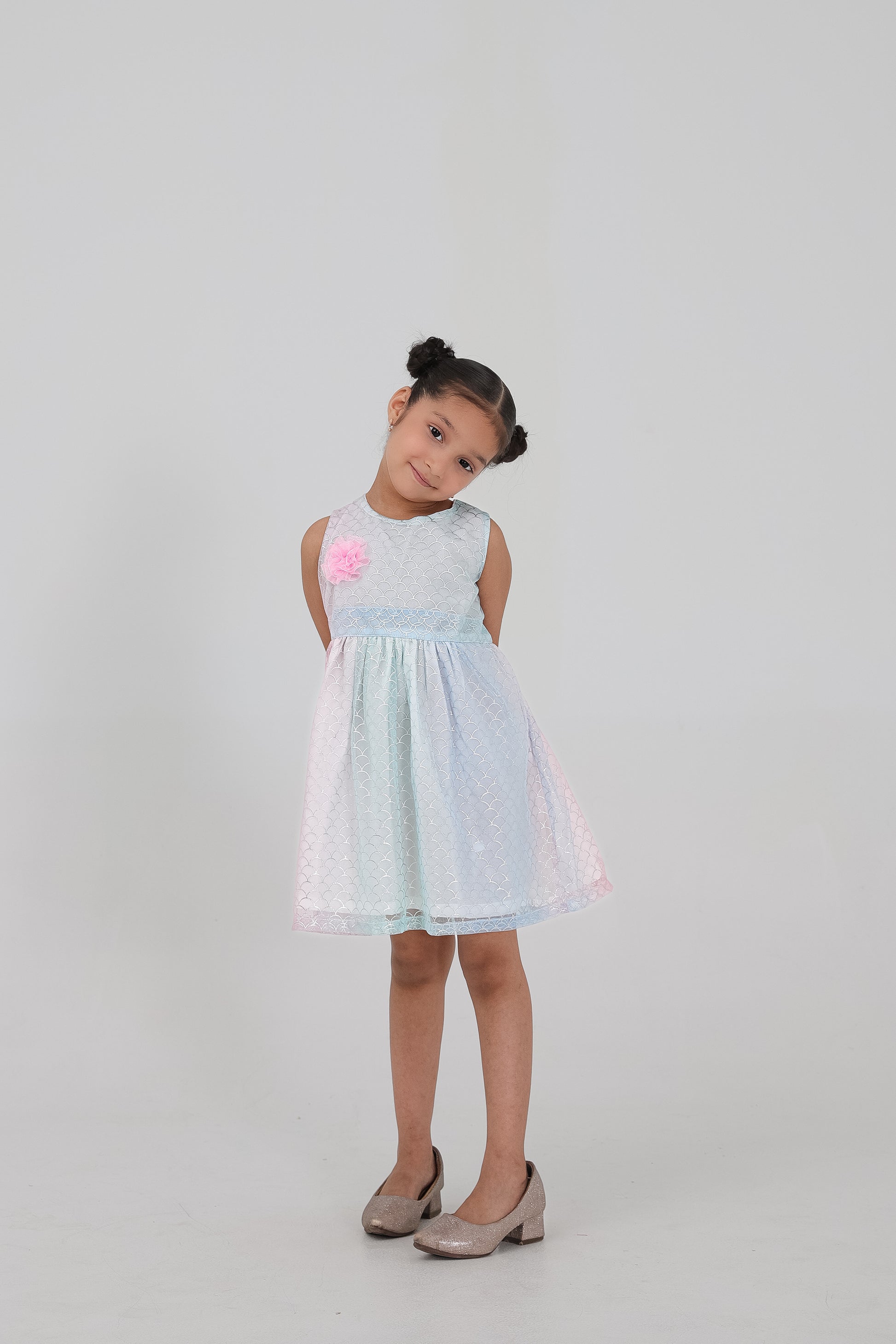 Let her twirl into a fairytale with this Mermaid Dreamy Dress. Featuring a multicolor shimmery net fabric with a delicate fish-scale pattern, it radiates magical charm. Ideal for birthdays or parties, this lightweight frock brings sparkle, comfort, and a splash of fantasy to her wardrobe.