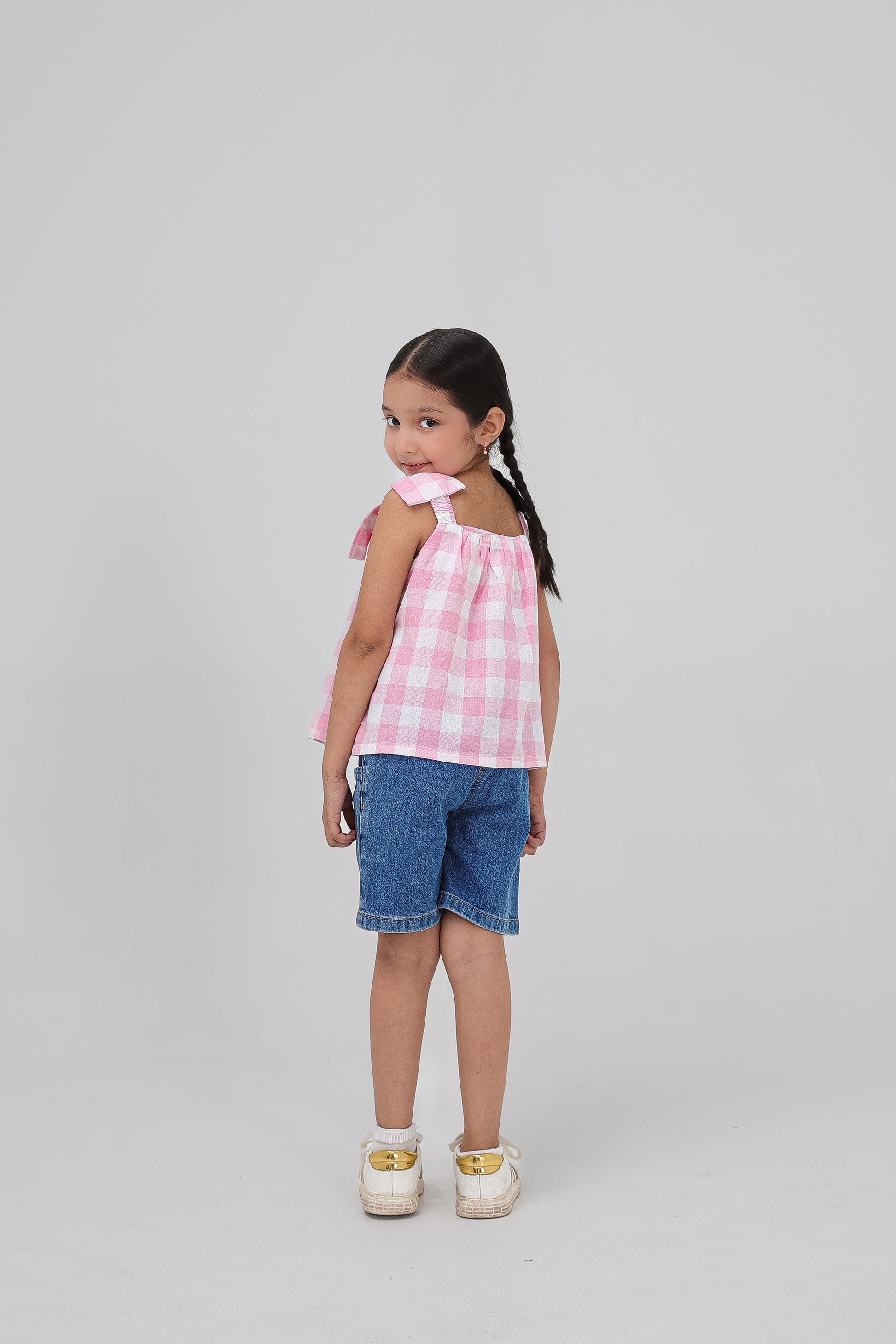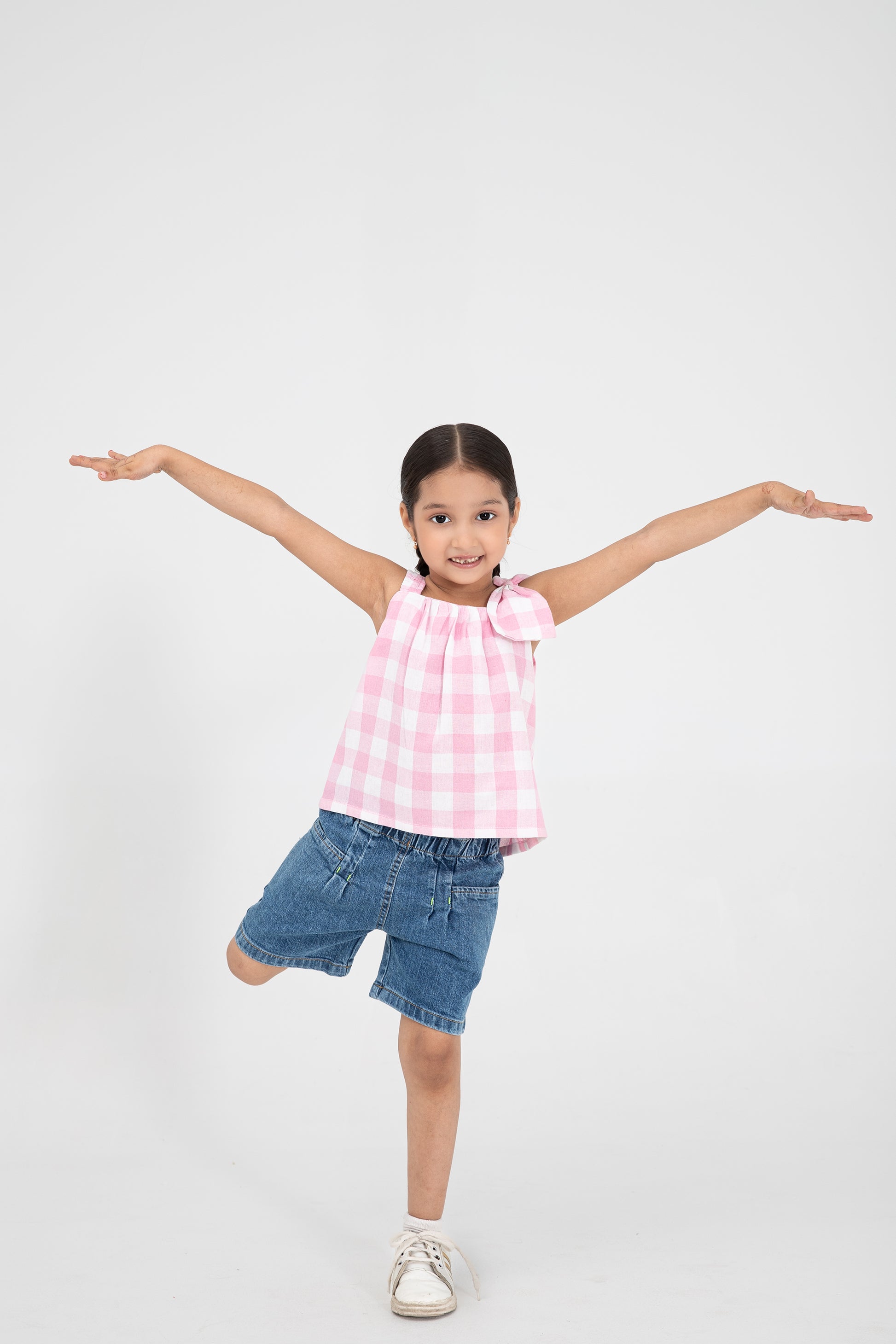 This pastel pink checkered top is as delightful as cotton candy! Crafted from premium cotton, it is designed for both comfort and style. The charming bow accent on one strap adds a trendy, playful touch, making it a perfect choice for sunny days, beach vacations, and fun outings.