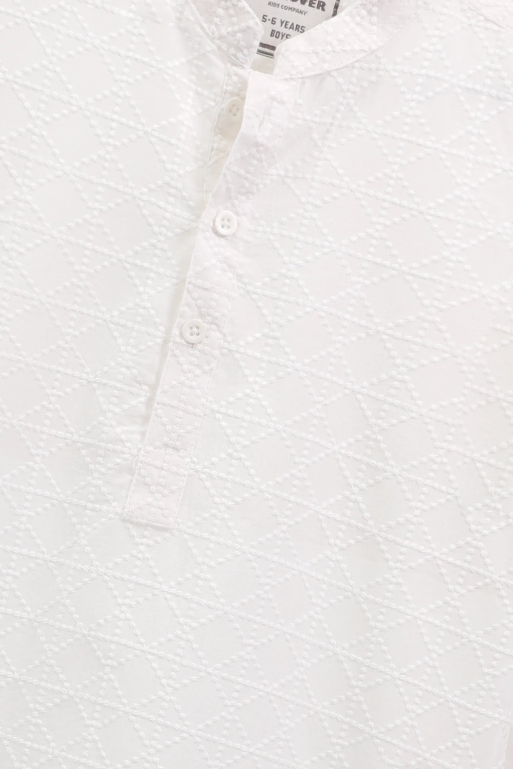 Designed in breathable cotton jacquard, this white kurta provides a refined traditional look with modern comfort. It features a woven textured pattern, band collar, and front placket for easy wear. Ideal for cultural events, festive days, and formal gatherings, it ensures style and ease throughout the day.