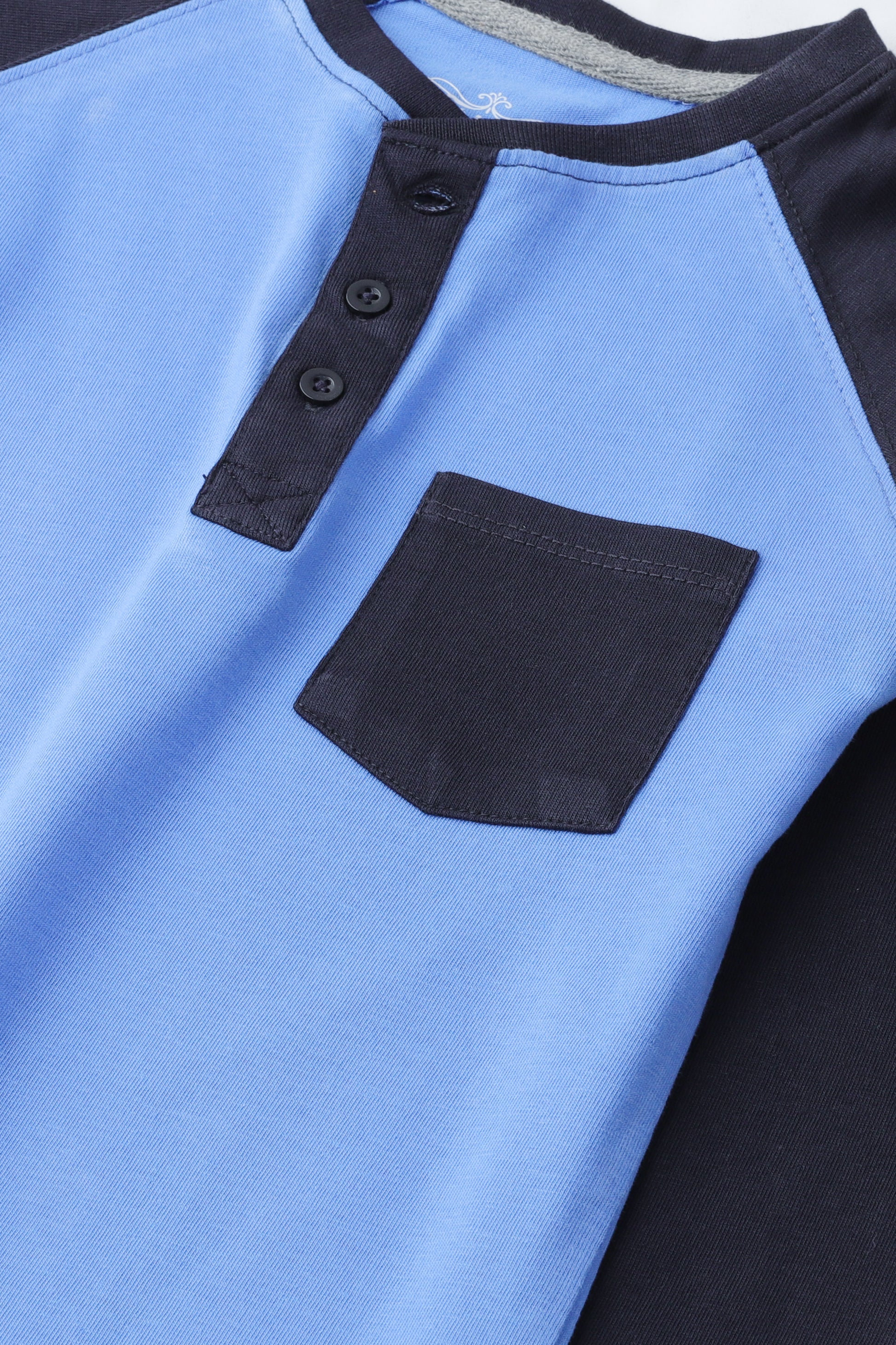 Let your little one shine in this Indigo & Navy raglan t-shirt. Made from heavy jersey fabric, the long sleeves and navy chest pocket adds a dash of personality, making this t-shirt not just stylish but fun to wear whether paired with his favorite jeans or layered under a jacket, this versatile tee will keep up with his active lifestyle.
