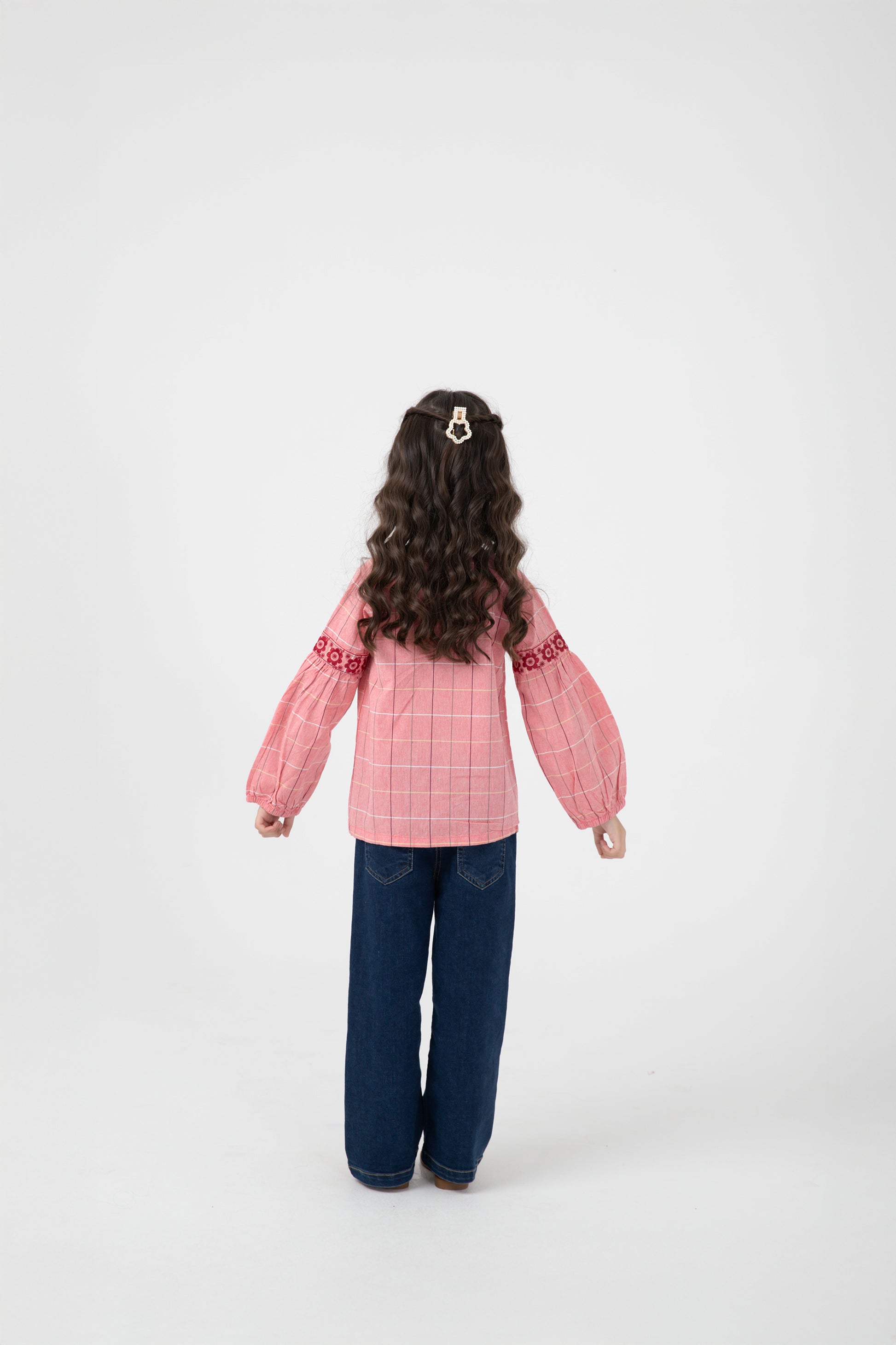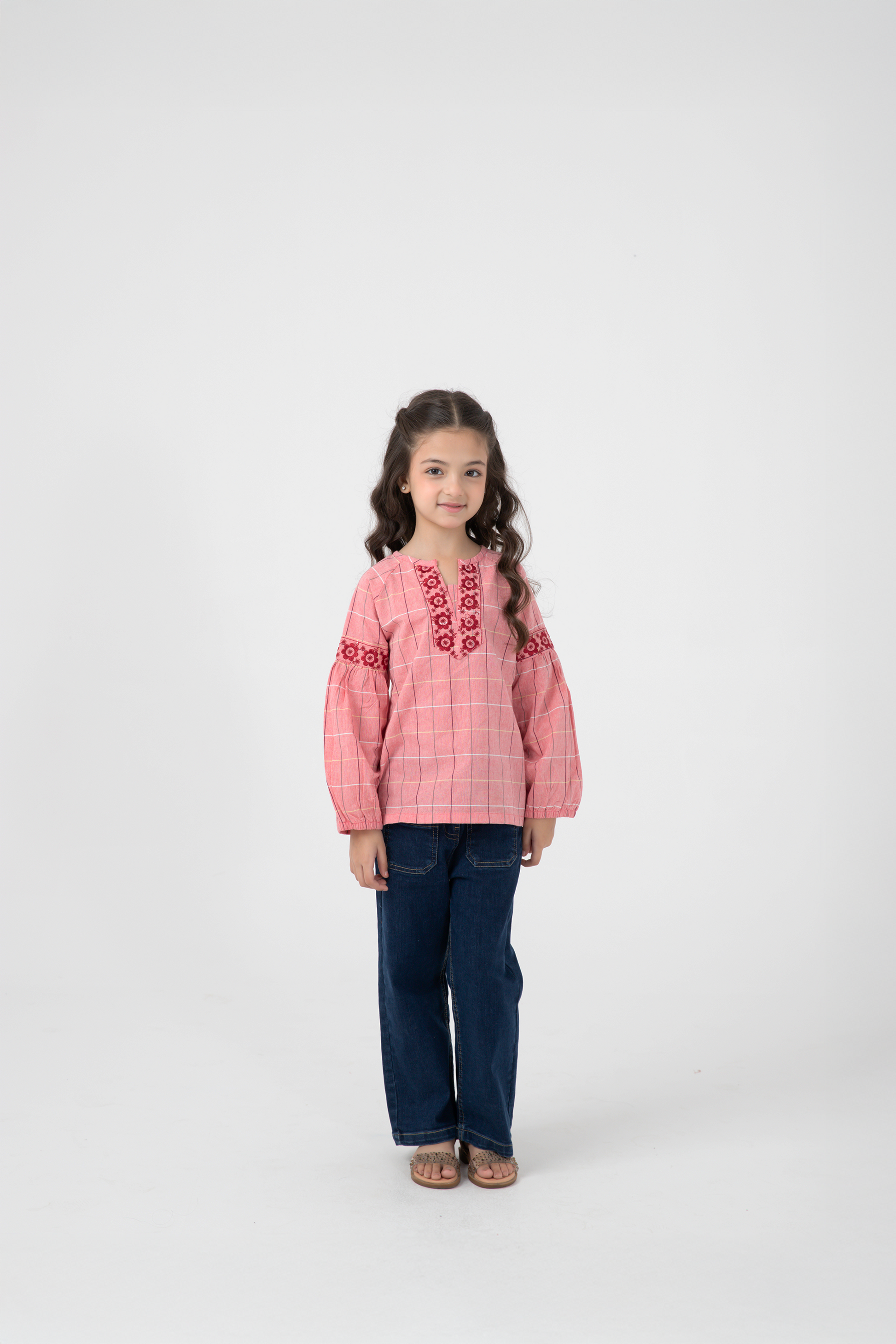 Let your little one shine in this adorable peach woven top! Featuring a round neck with a dainty V-slit and delicate embroidery, it’s full of charm. The gathered sleeves with embroidered patti and binding add a whimsical touch, while the straight bottom ensures comfort for playdates and adventures.