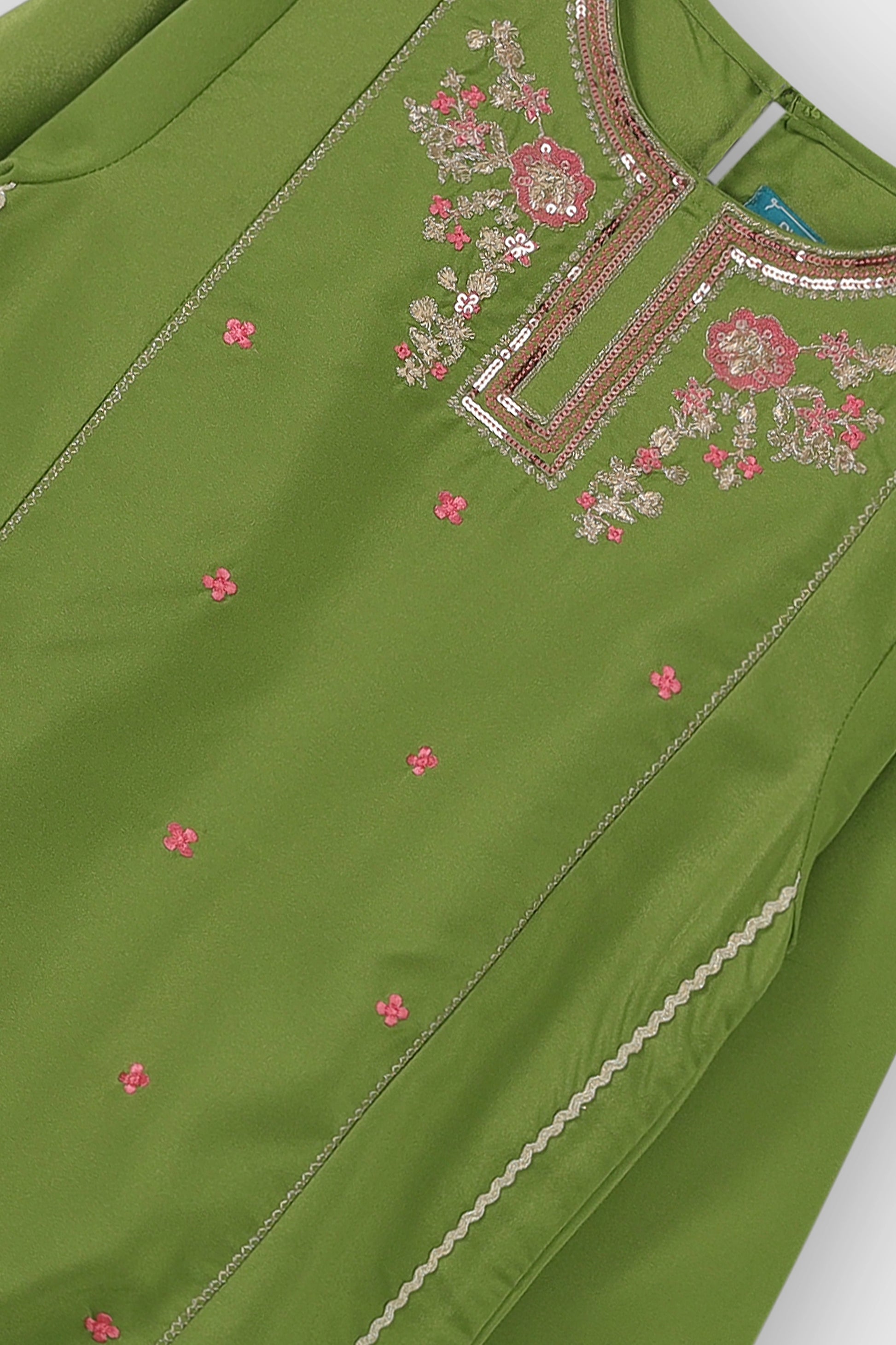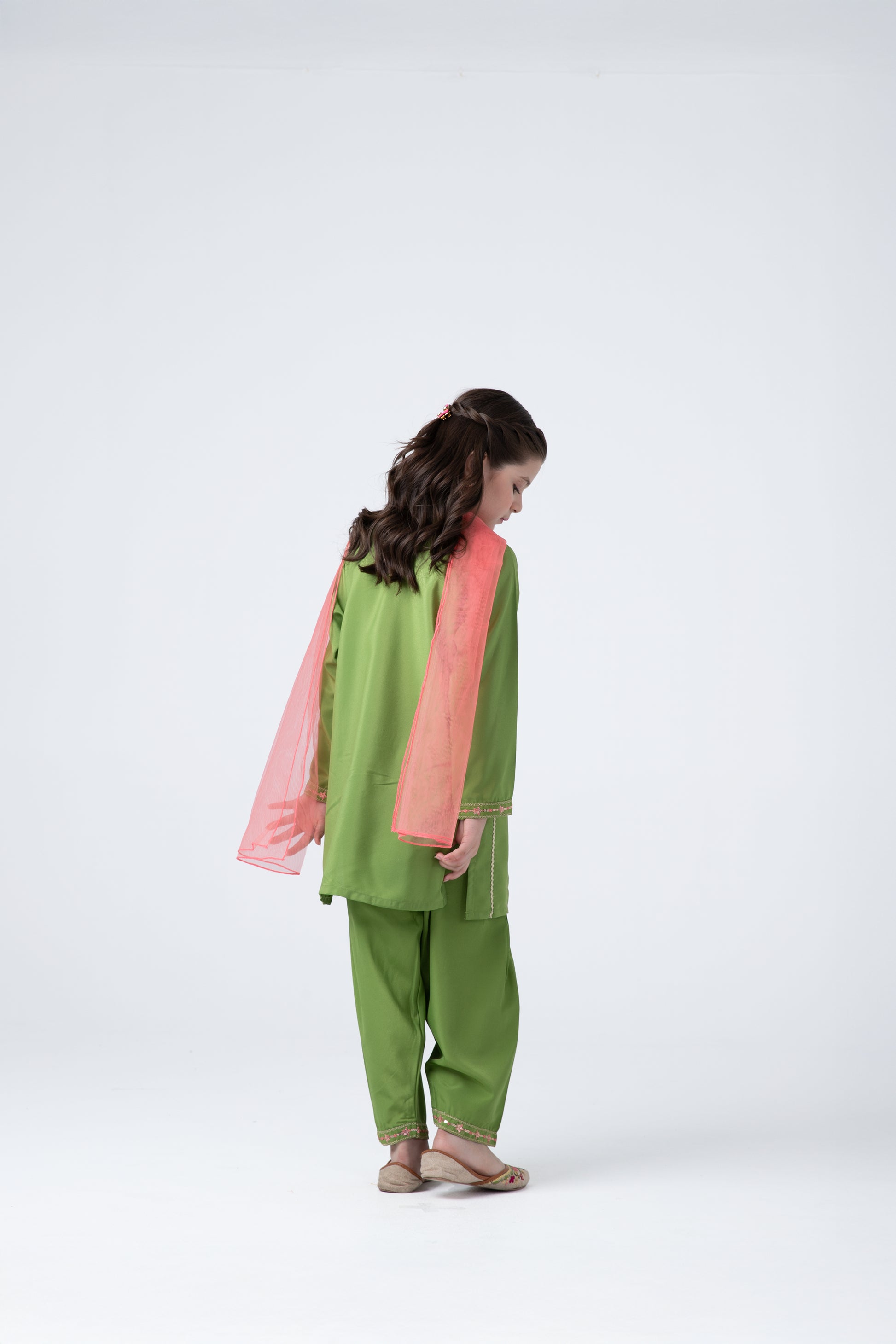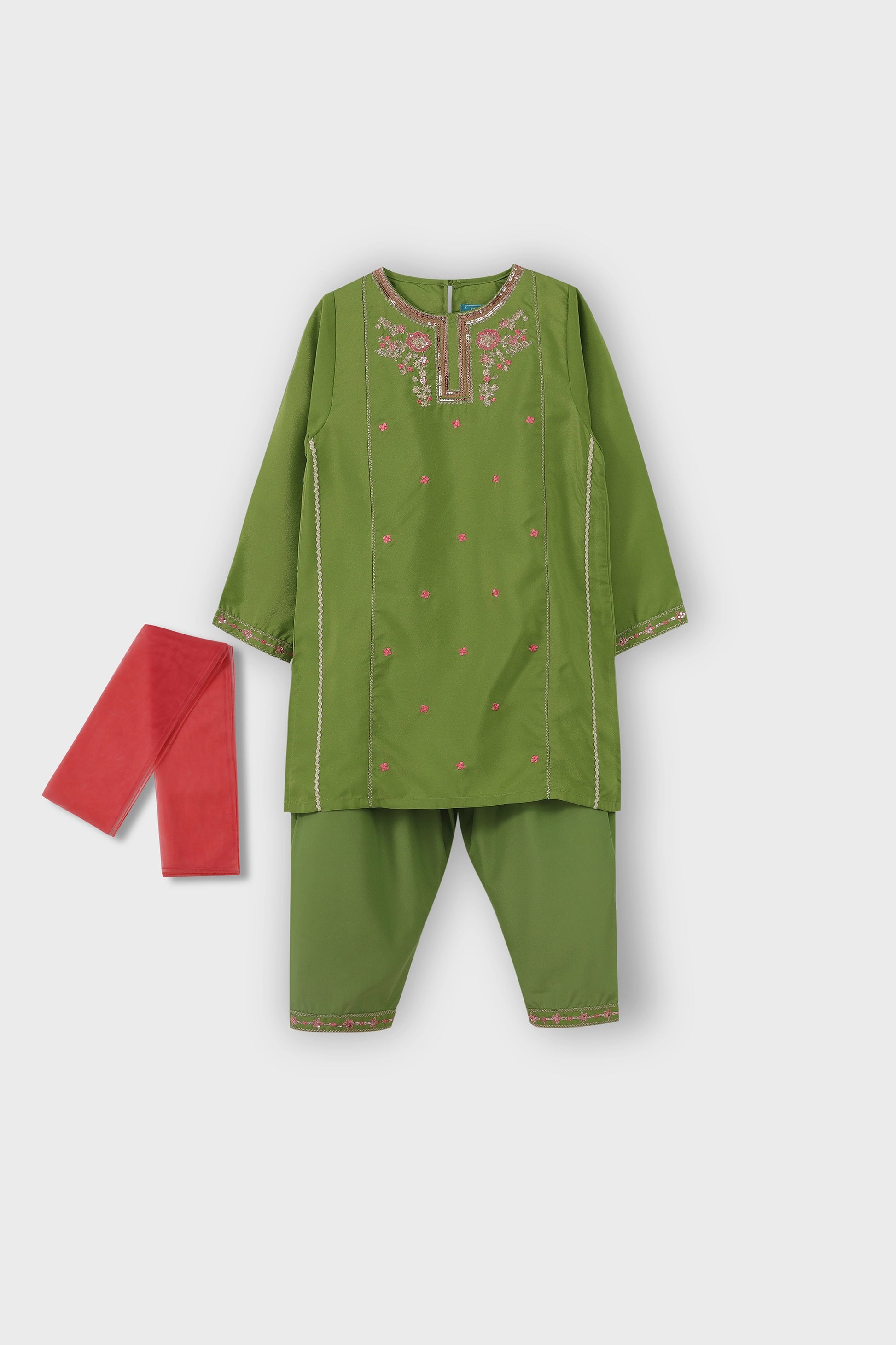Add a festive charm to her wardrobe with this elegant green silk set. The kurta features delicate floral embroidery on the neckline and front, paired with matching embroidered shalwar. A light pink net dupatta adds contrast and softness, making it ideal for celebratory occasions and dressy events.