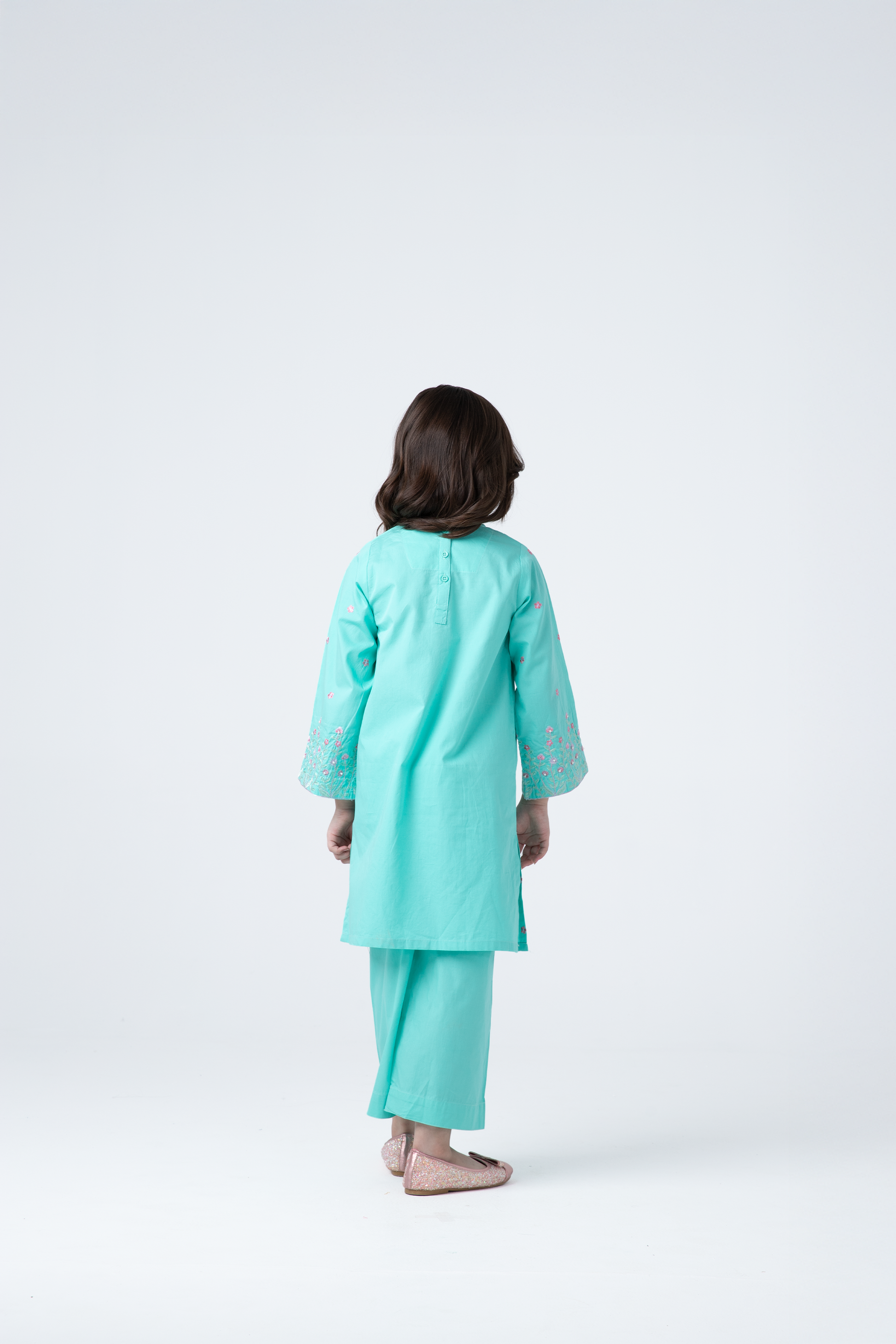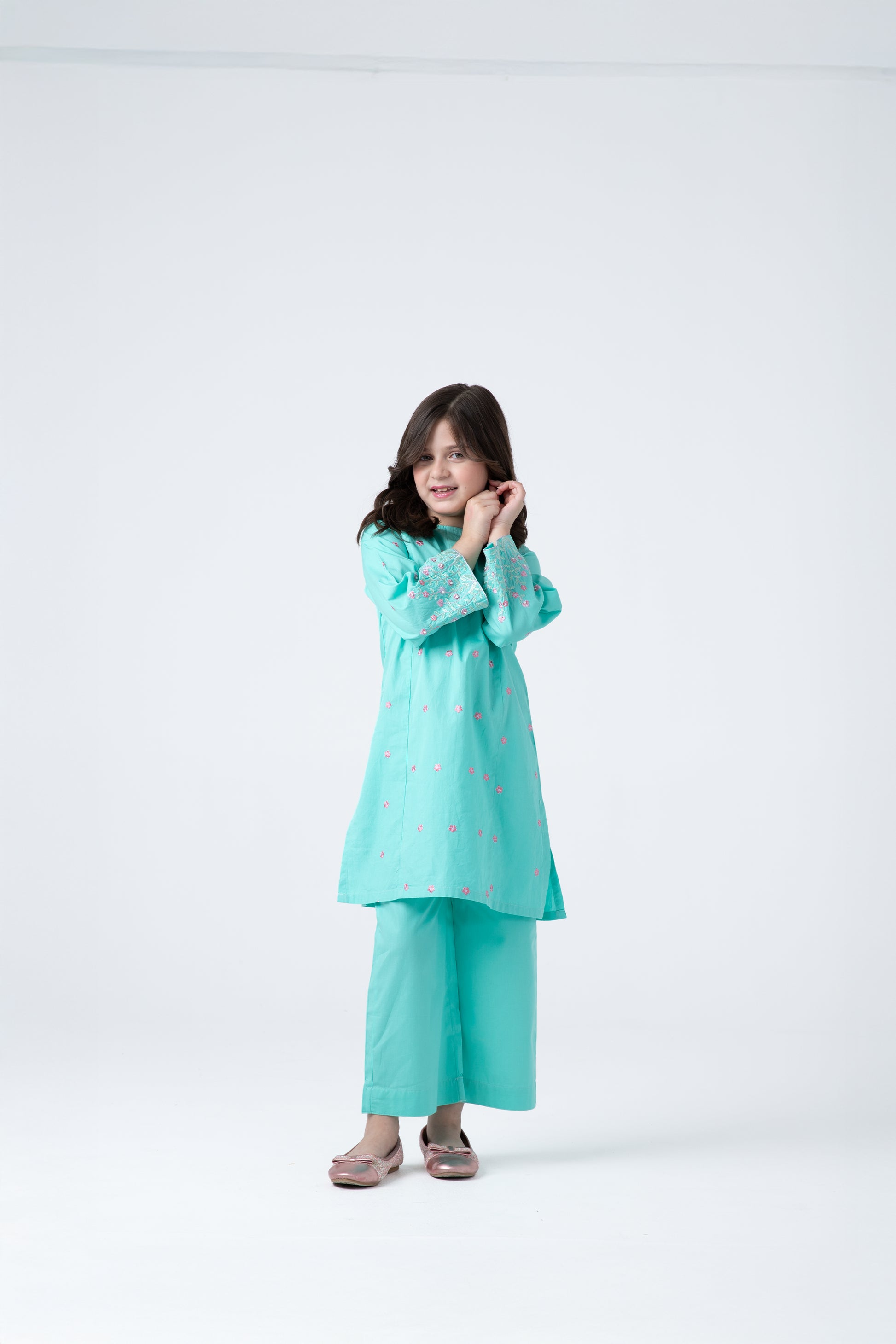 This light green cotton 2-piece set includes a straight cut kurta adorned with delicate floral embroidery scattered across the front and ornate embroidery on the sleeves. Paired with plain straight trousers featuring an elastic waist. A graceful and comfortable choice for festive and casual wear.