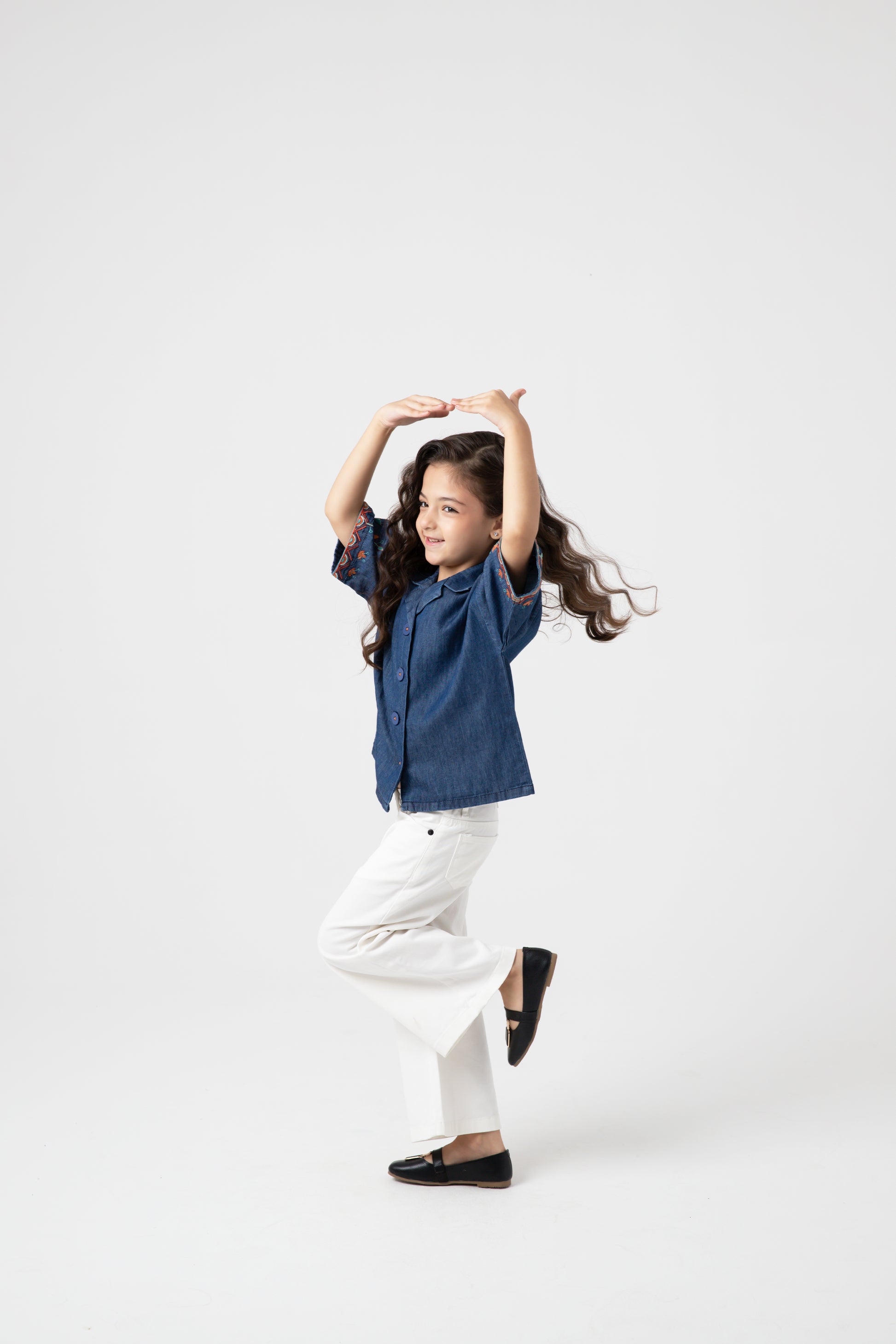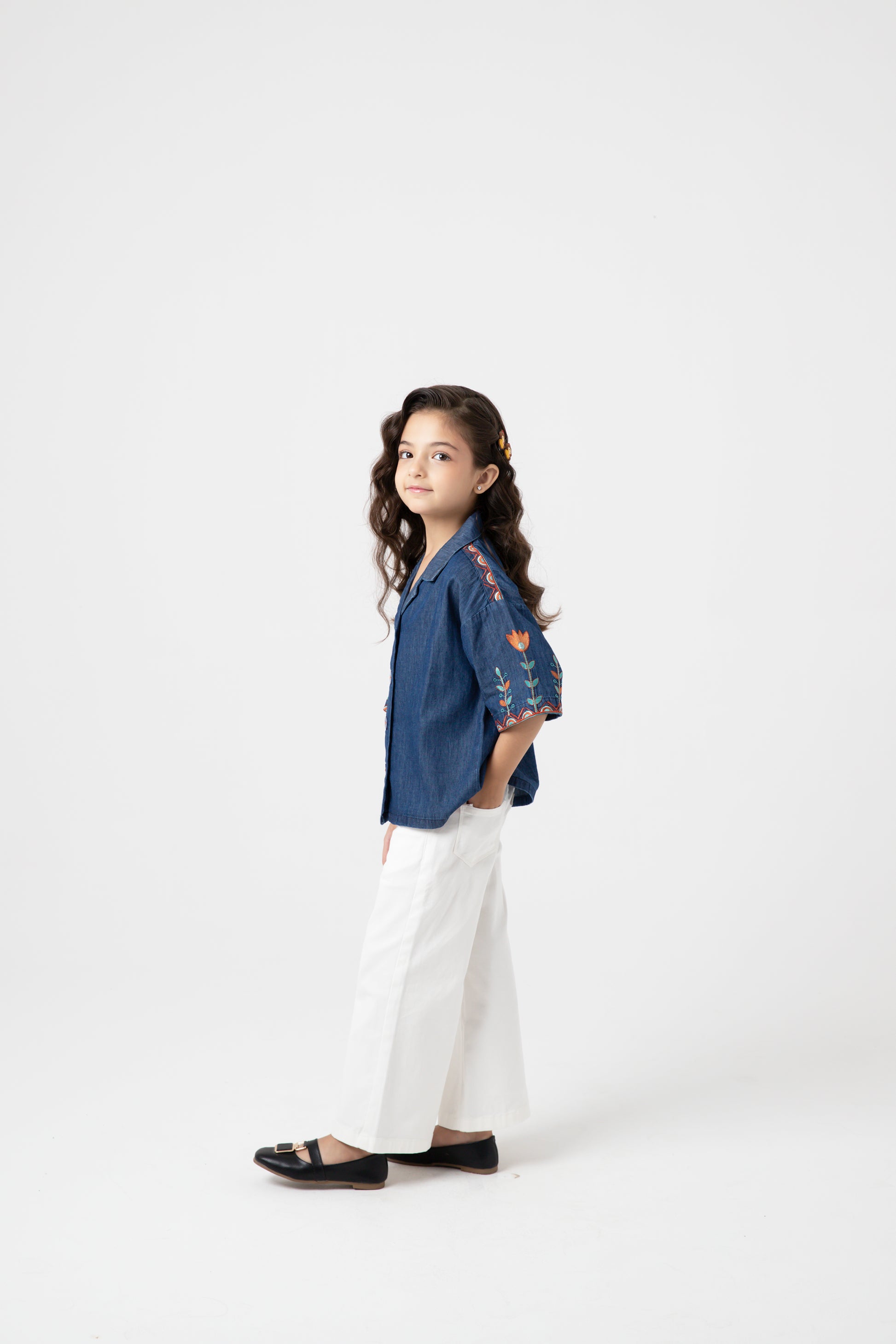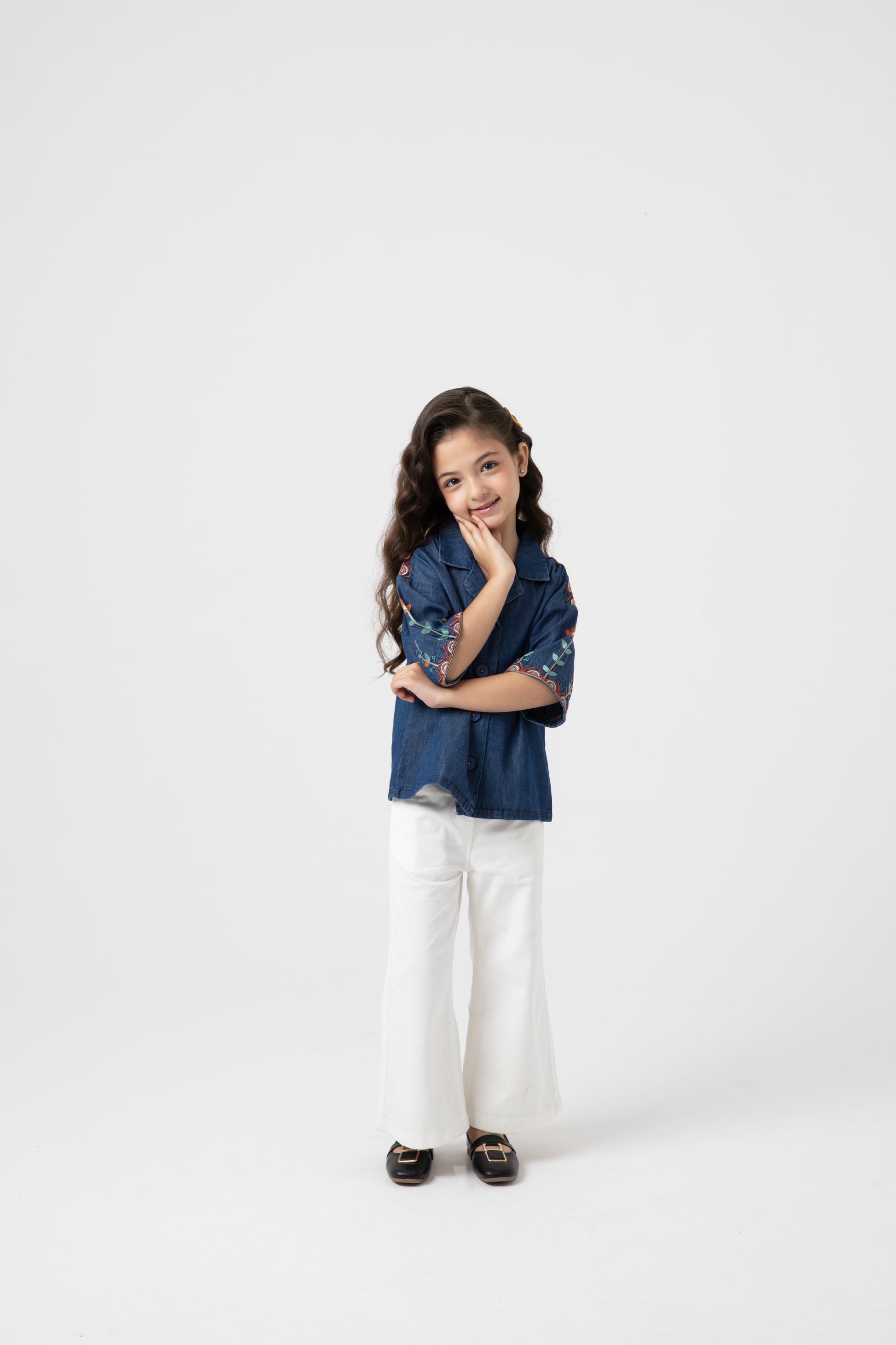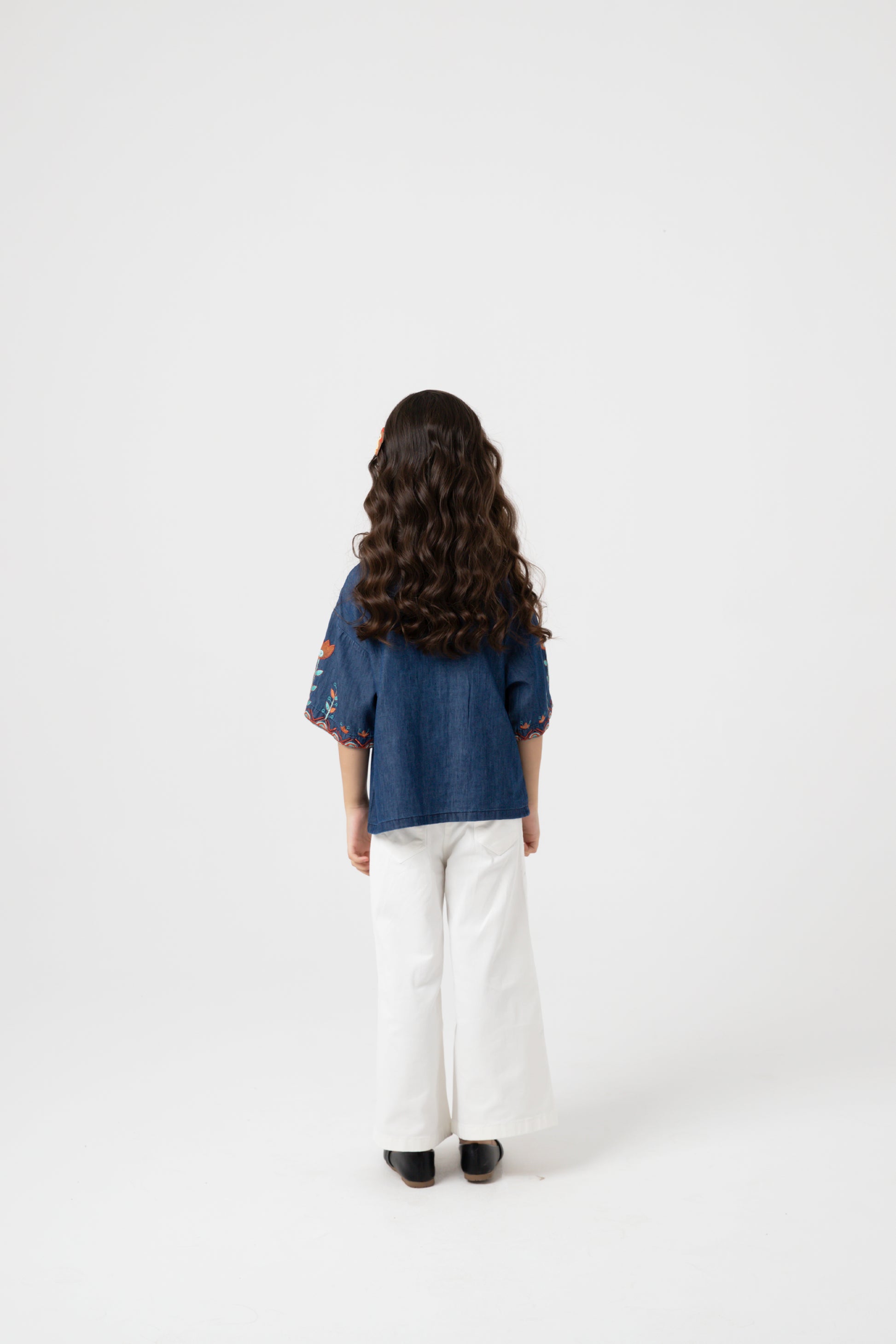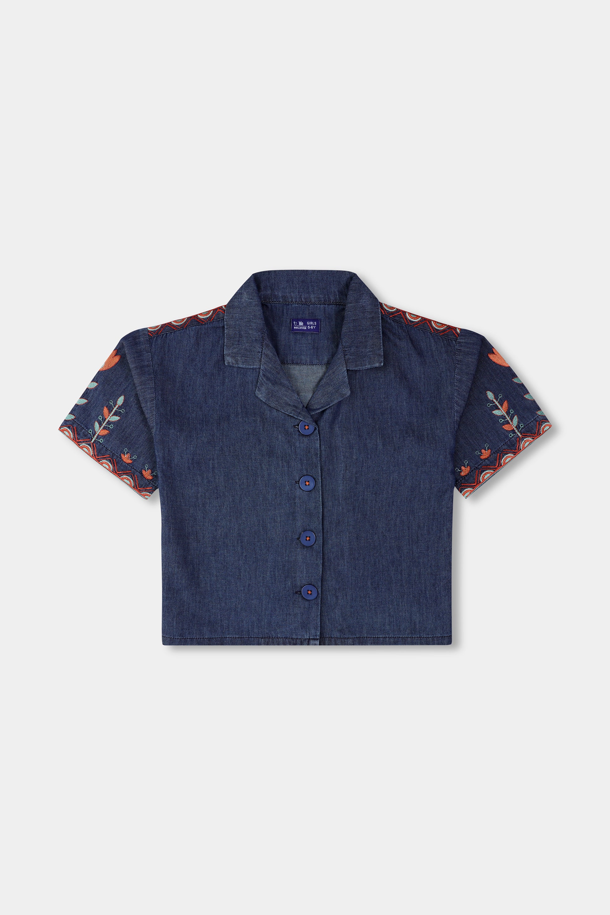 A wardrobe favorite with a twist, the Denim Crop Top is crafted in lightweight cotton denim. The dark blue base is elevated with intricate orange and rust embroidery along the sleeves. With its relaxed cut and shirt-style collar, this top is ideal for playful days and casual occasions.