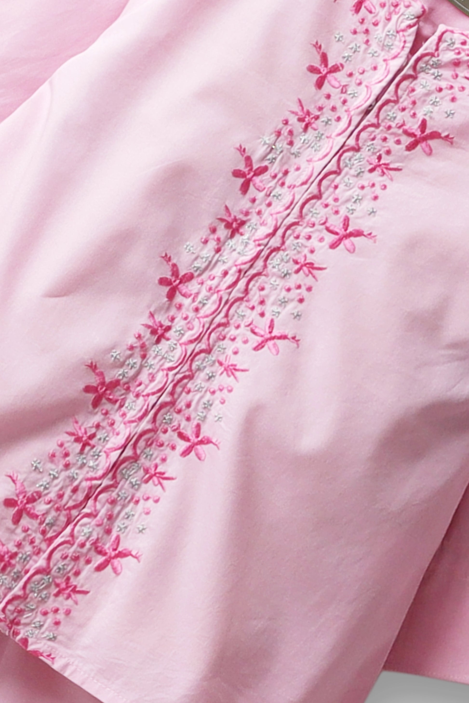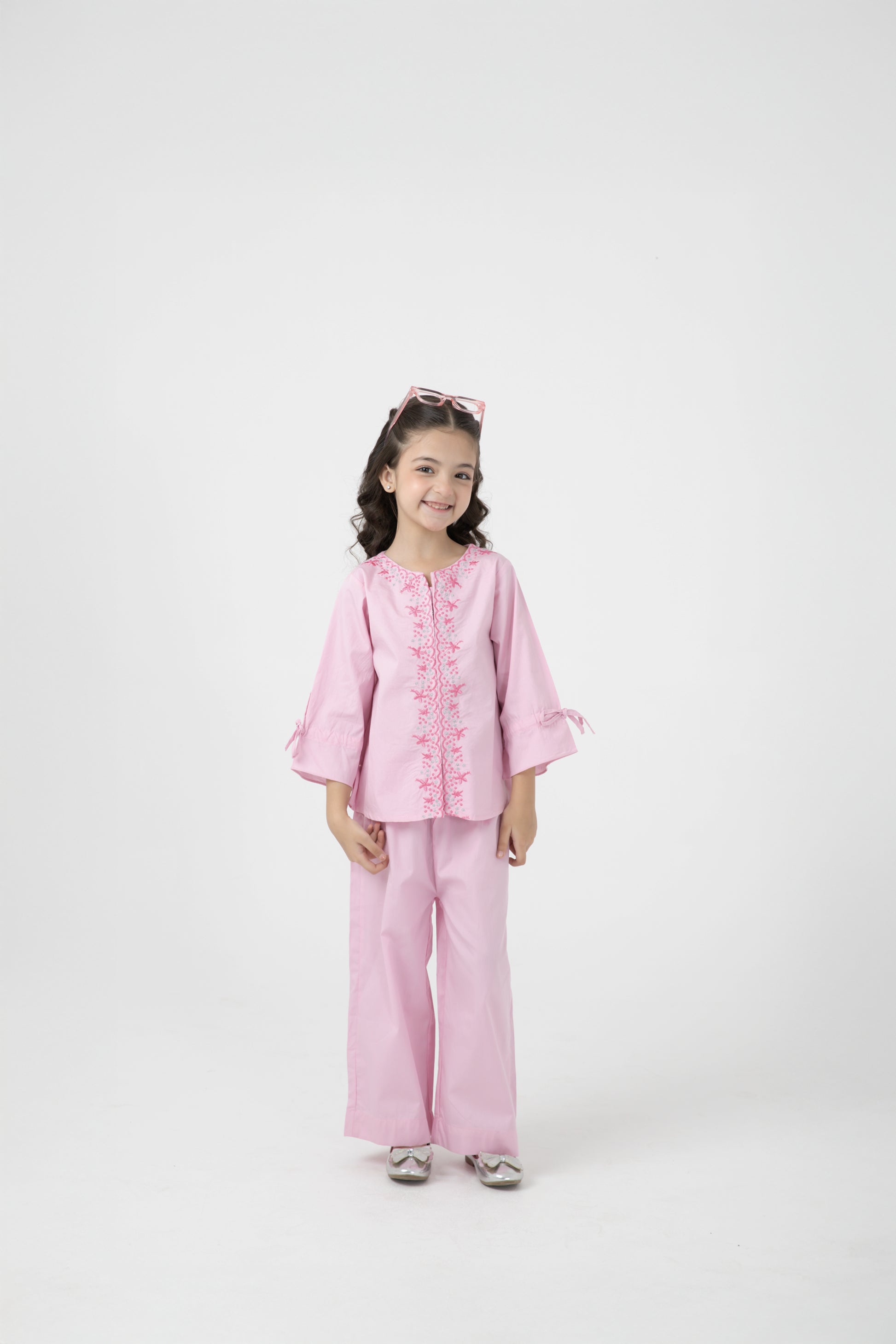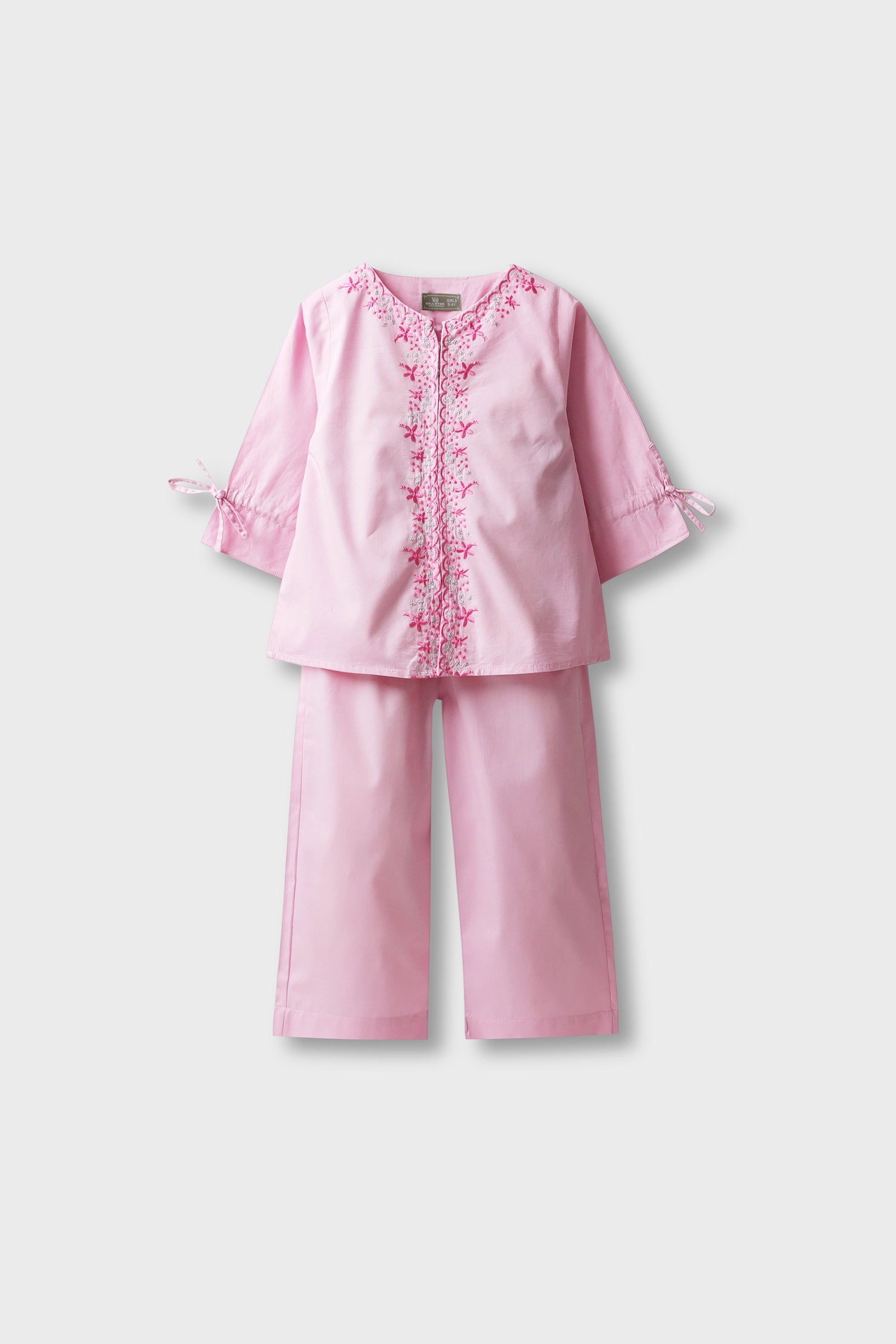 Brighten her day with this blush pink co-ord set crafted in soft cotton. Delicate floral embroidery decorates the neckline and front, paired with a matching trouser for comfort and charm. Perfect for festive gatherings or casual outings, this outfit blends style and ease for confident little trendsetters.