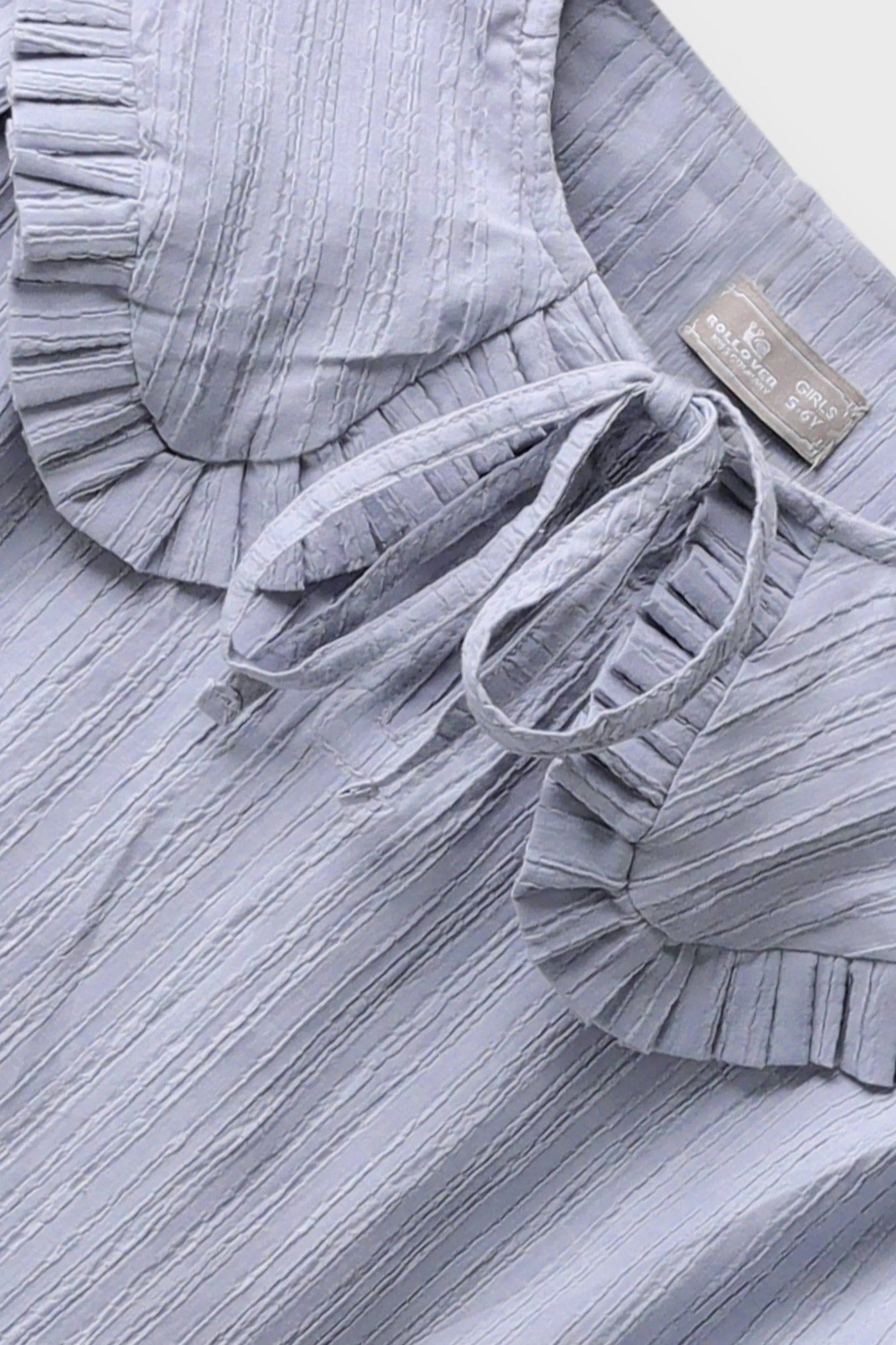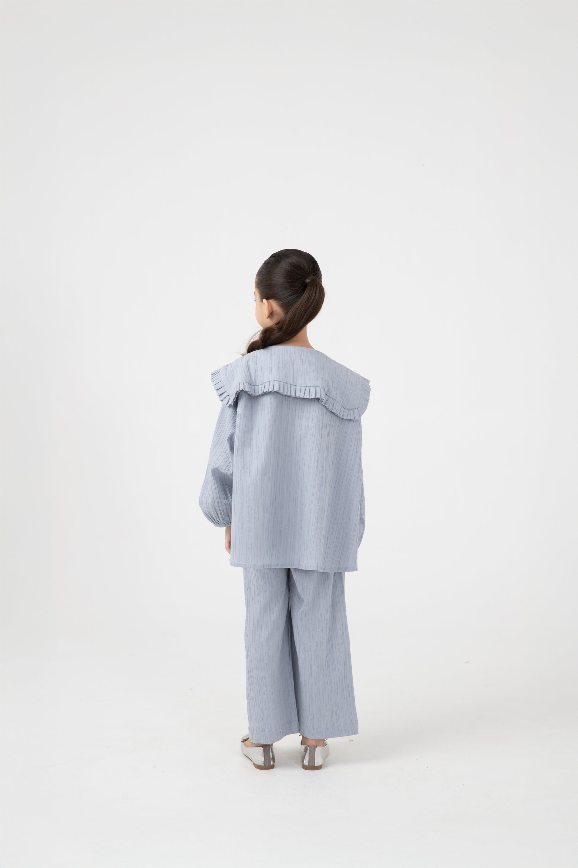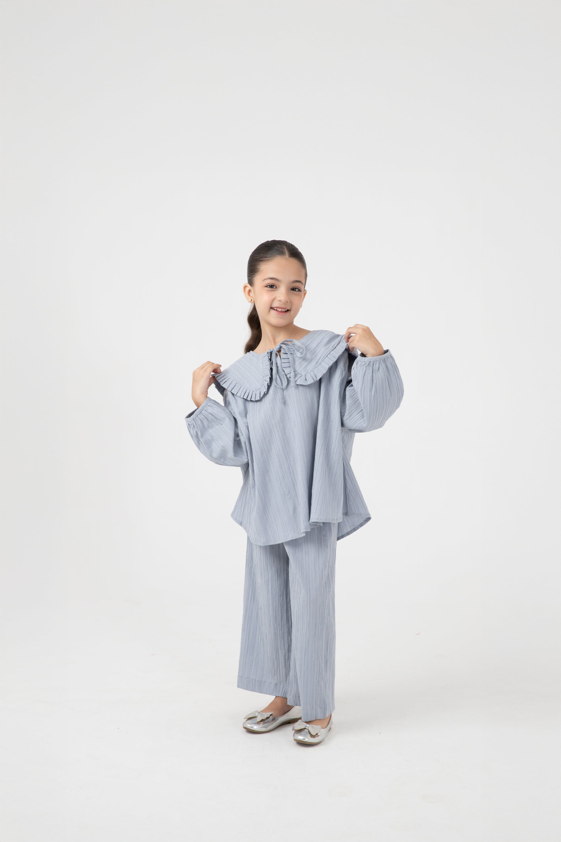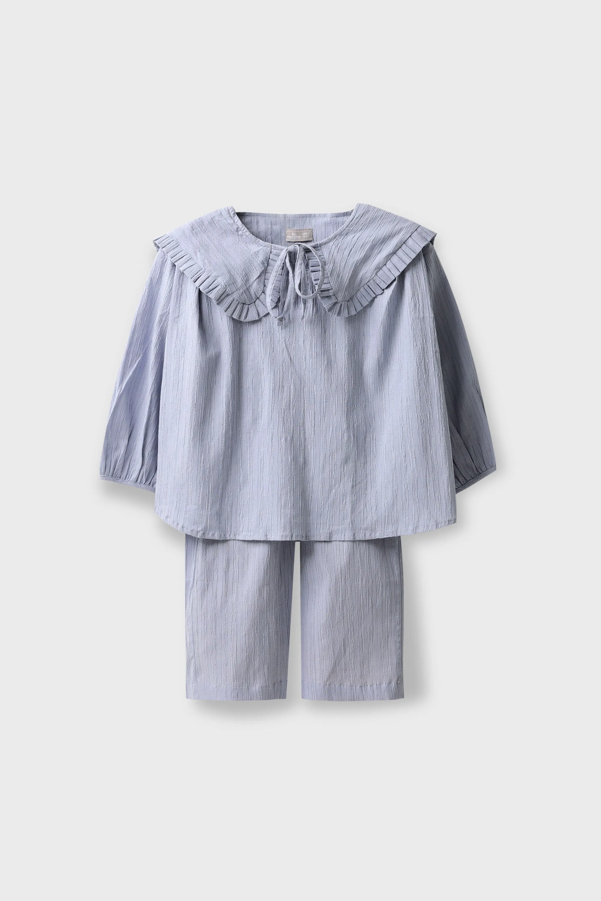 Crafted from lightweight cotton, this grey co-ord set includes a textured top with pleated neck trim and puffed sleeves. The matching pants boast a comfortable wide-leg silhouette and an easy pull-on waist. An elegant choice for casual gatherings and sunny outings.