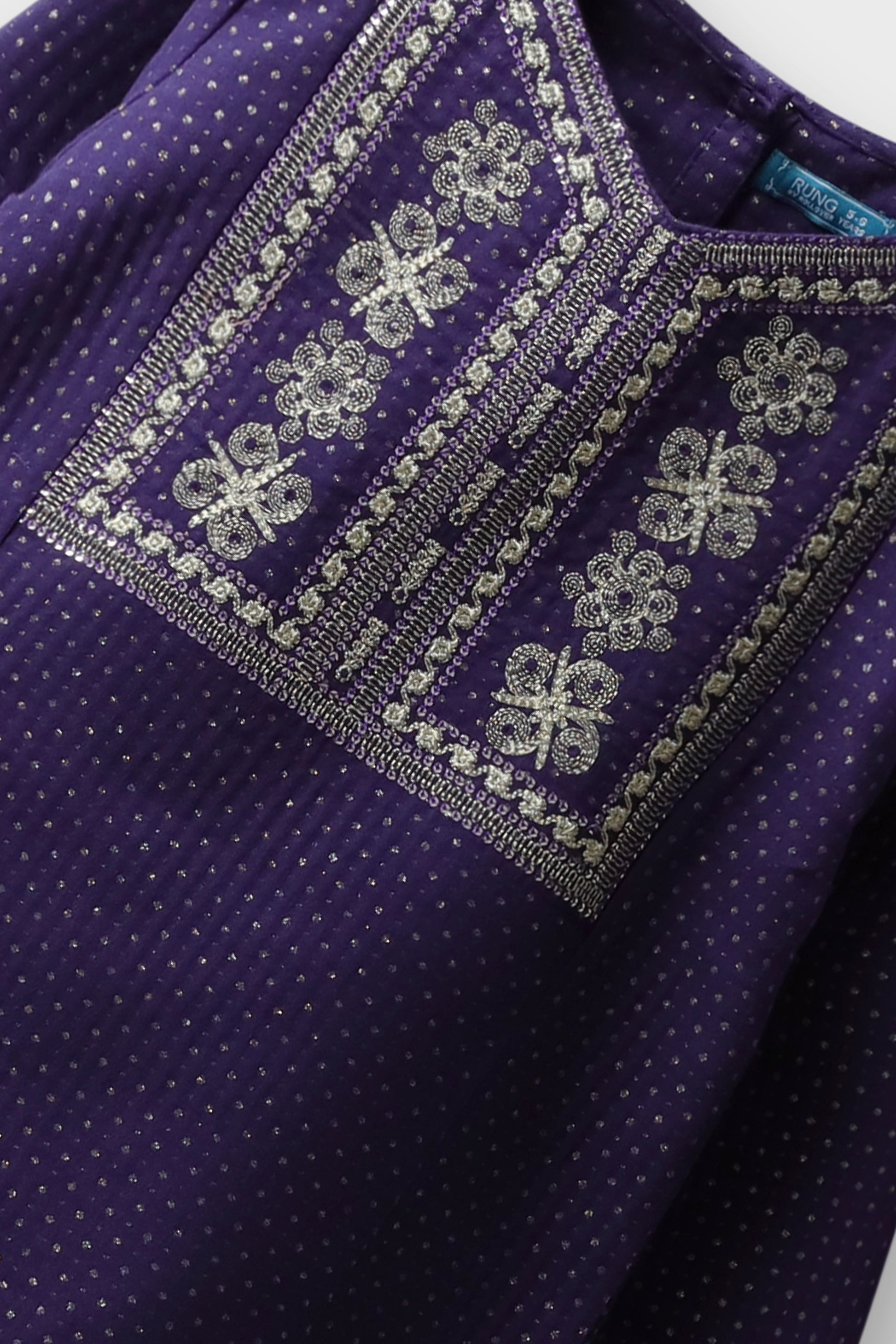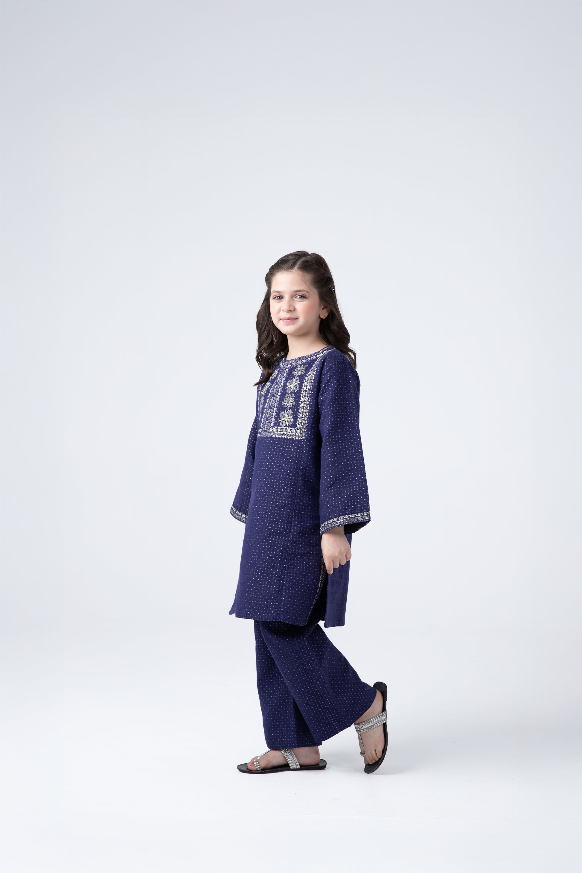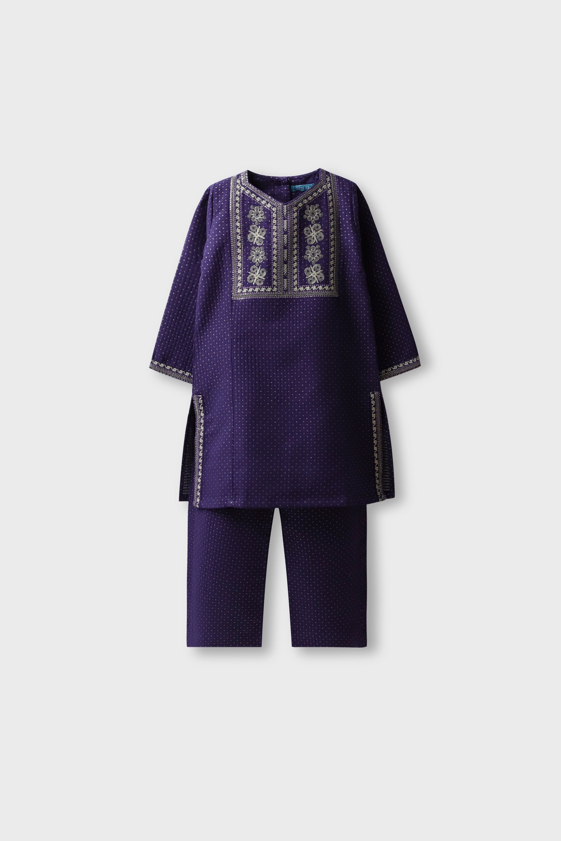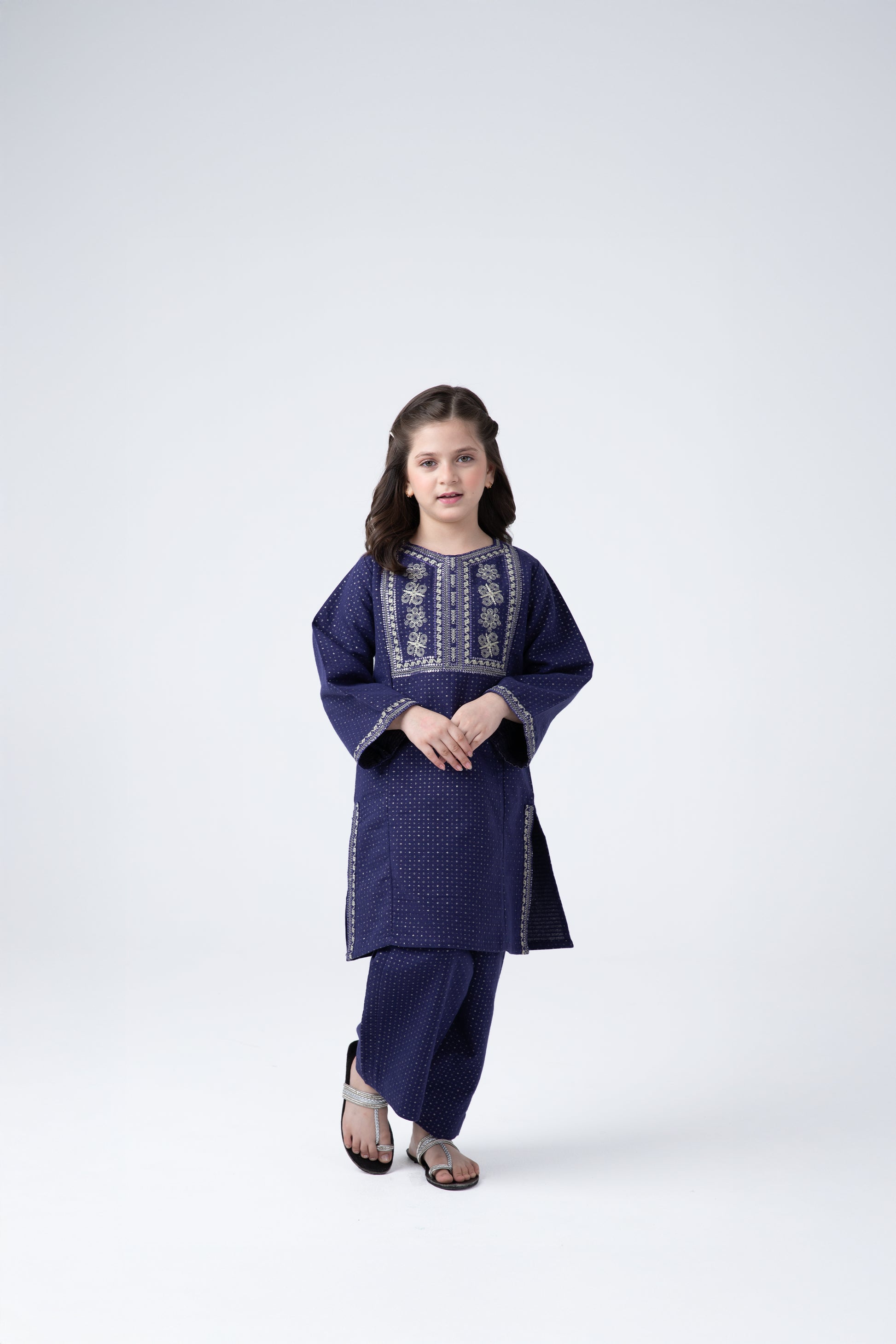 Shine bright in this royal blue jacquard kurta and shalwar duo. With gold-tinged embroidery around the neckline and sleeves, it’s a perfect pick for family occasions, school events, or weddings. Crafted from breathable cotton for all-day comfort with a luxe traditional look.