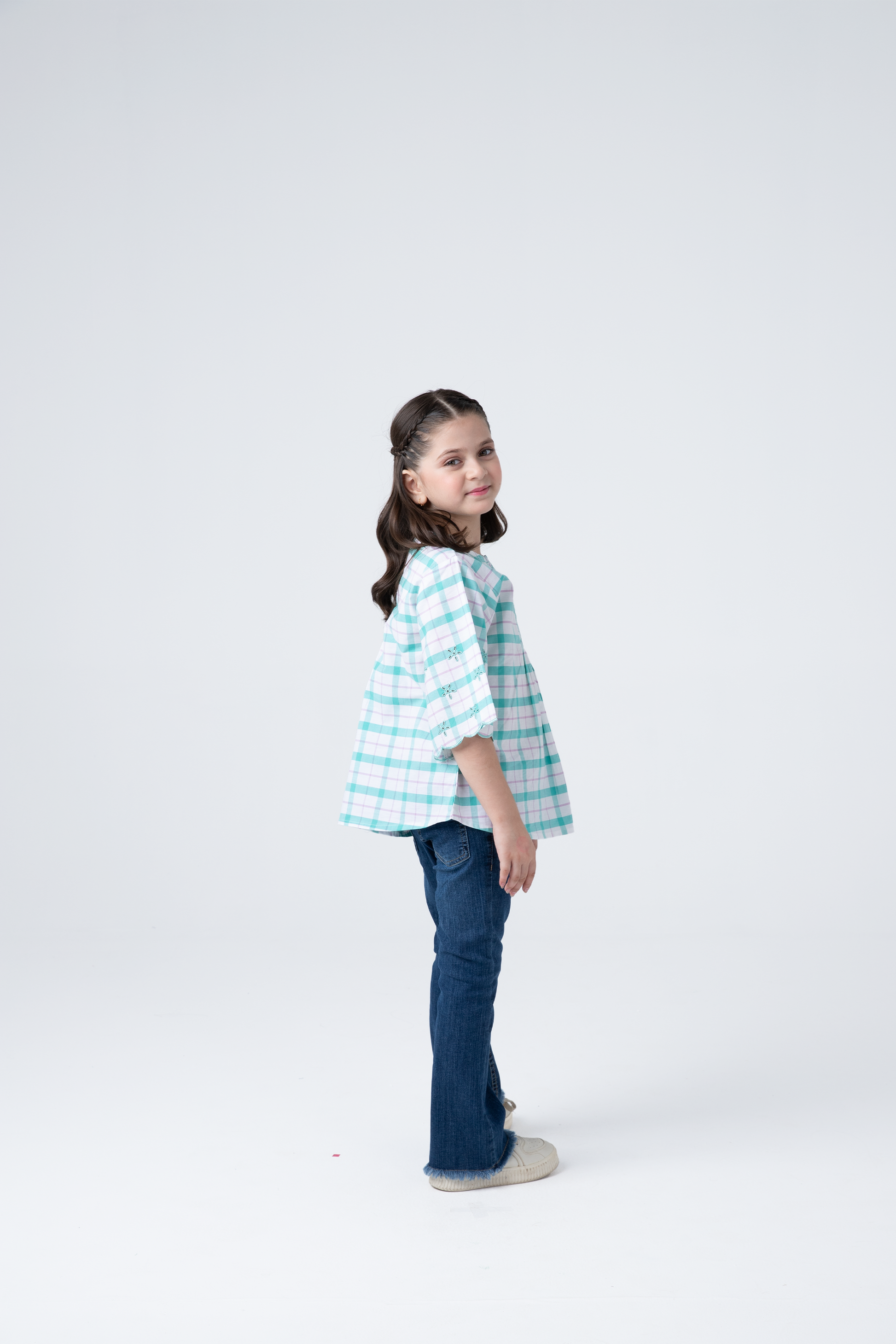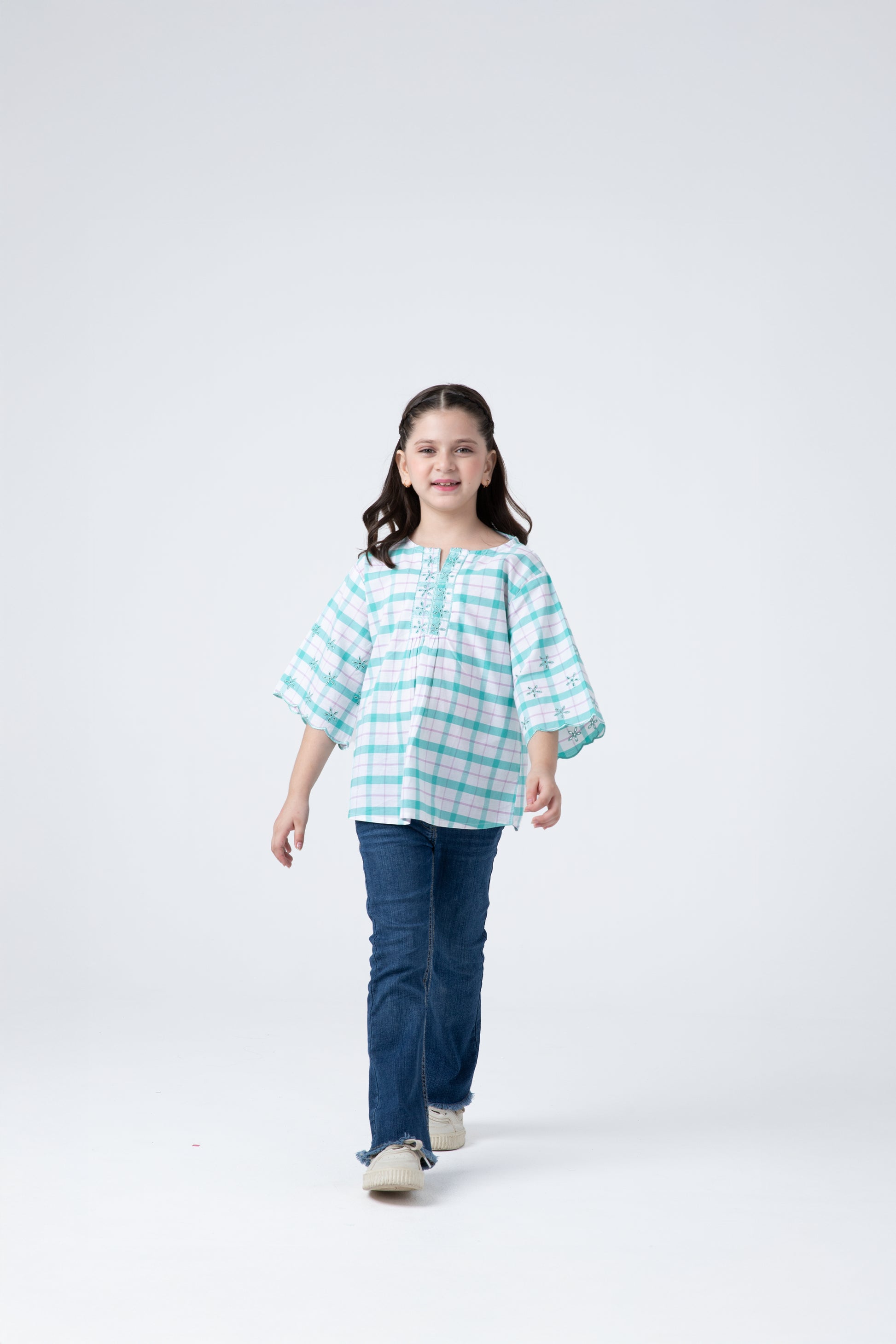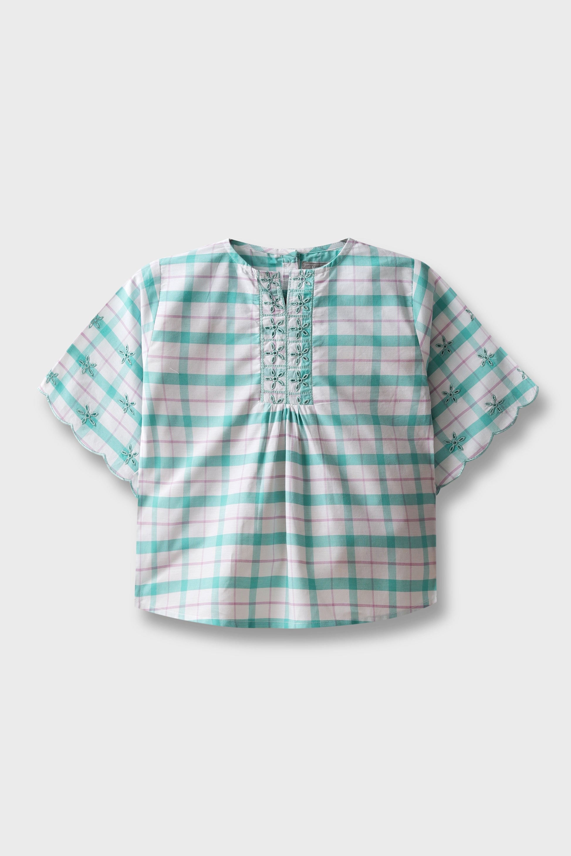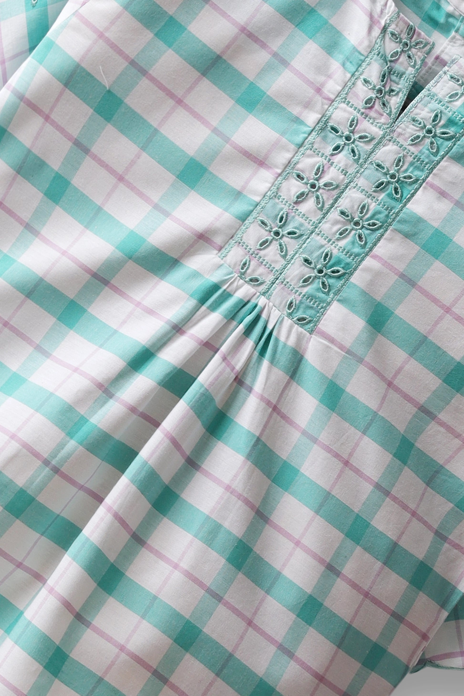 Designed in crisp white cotton with fresh green and lilac checks, this top features floral embroidery along the bell sleeves and neckline. Soft, breezy, and full of charm, it offers comfort and grace in equal measure—ideal for casual days or festive dressing with a playful twist.