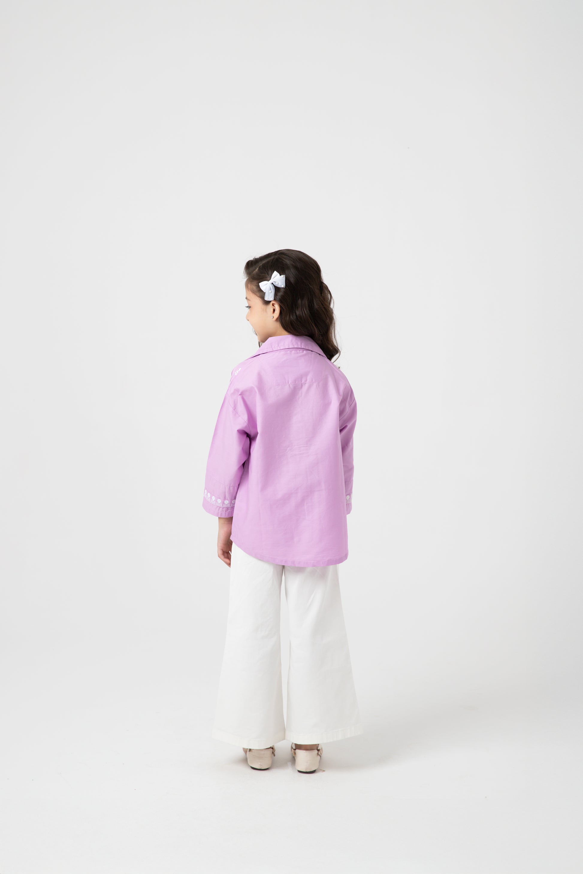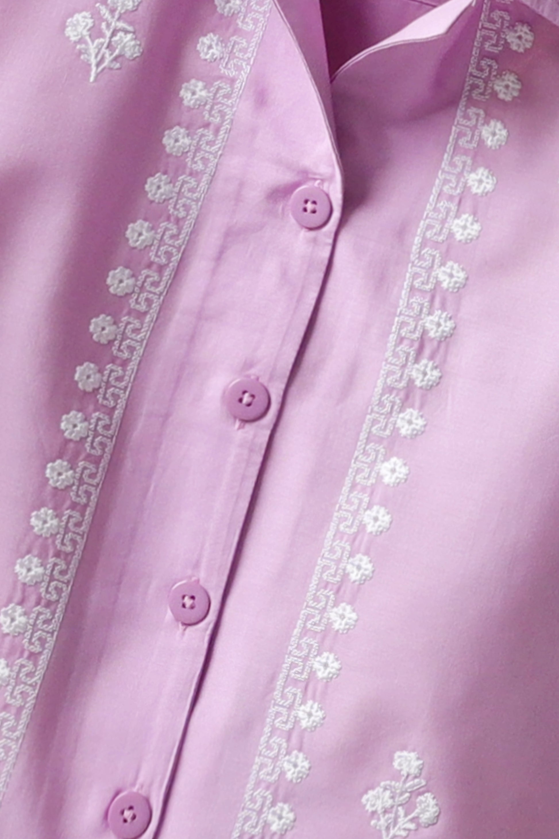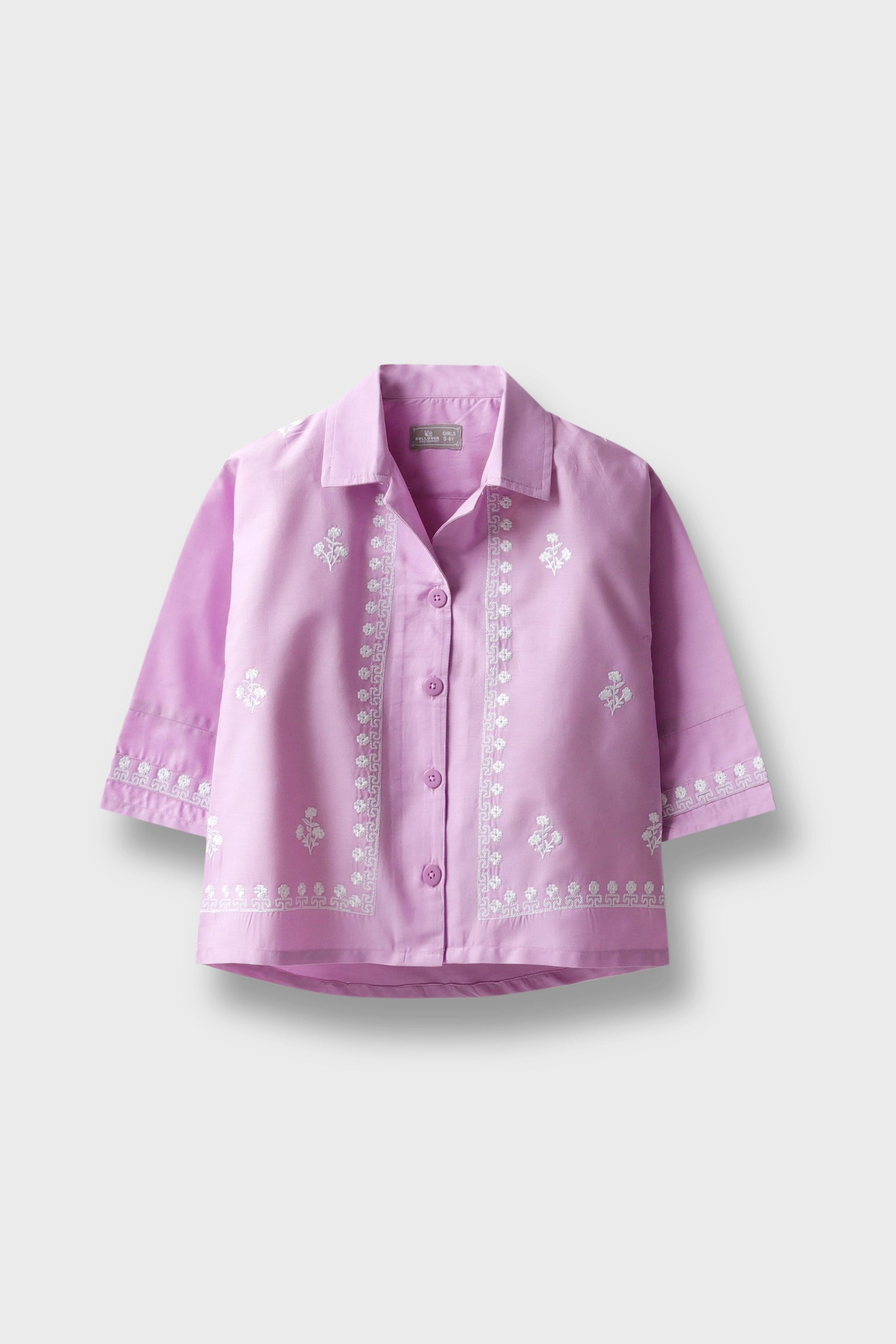 Made from soft cotton, this purple top features fine white embroidery of blooming vines and floral motifs. With a button-down front, collar neck, and neatly finished edges with its high-low hem, it balances comfort and charm. A timeless style for young girls that blends elegance with breathable, all-day wearability.