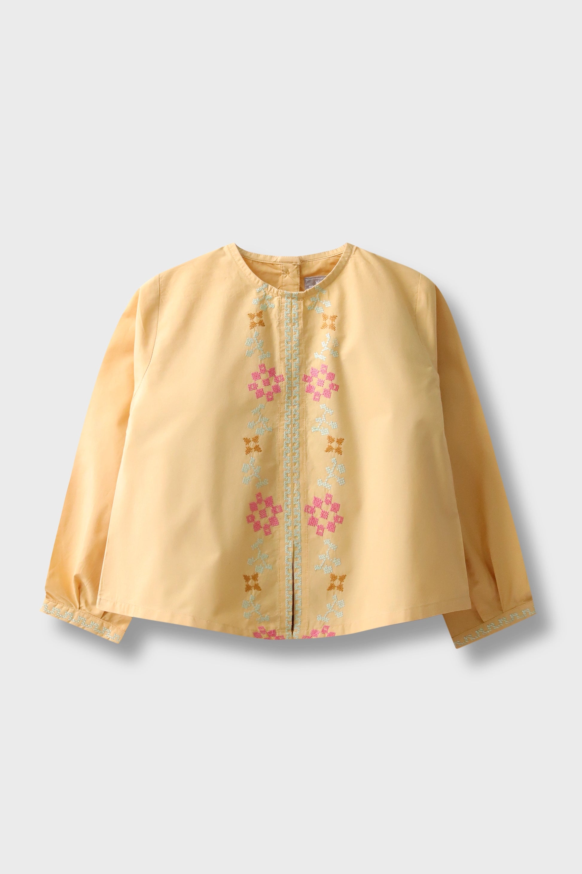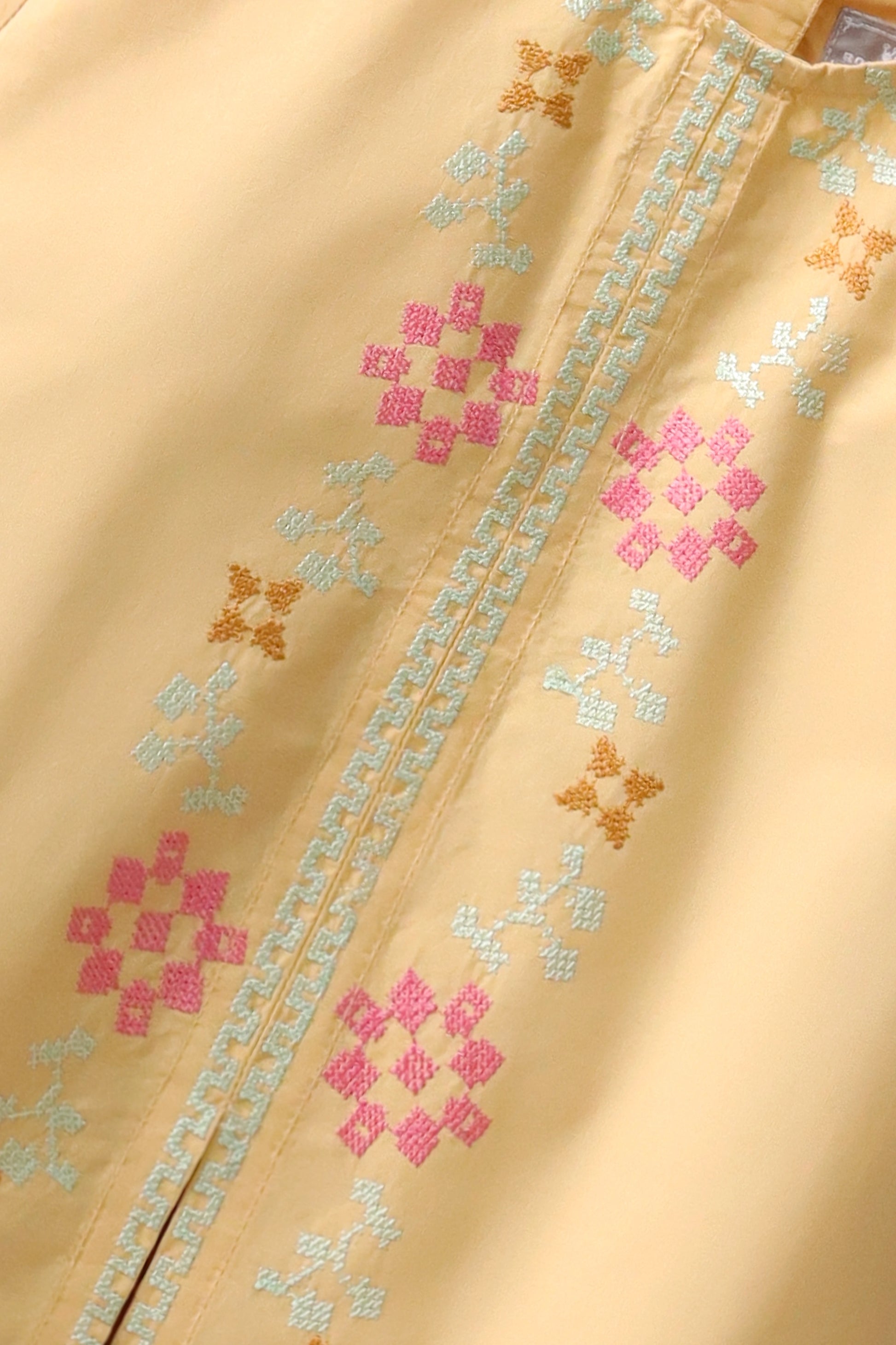 This beige cotton top features floral-inspired embroidery in shades of pink, blue, and brown down the front and sleeves. The short length and relaxed fit make it ideal for summer comfort. A charming pick for family events or everyday elegance with a traditional twist.