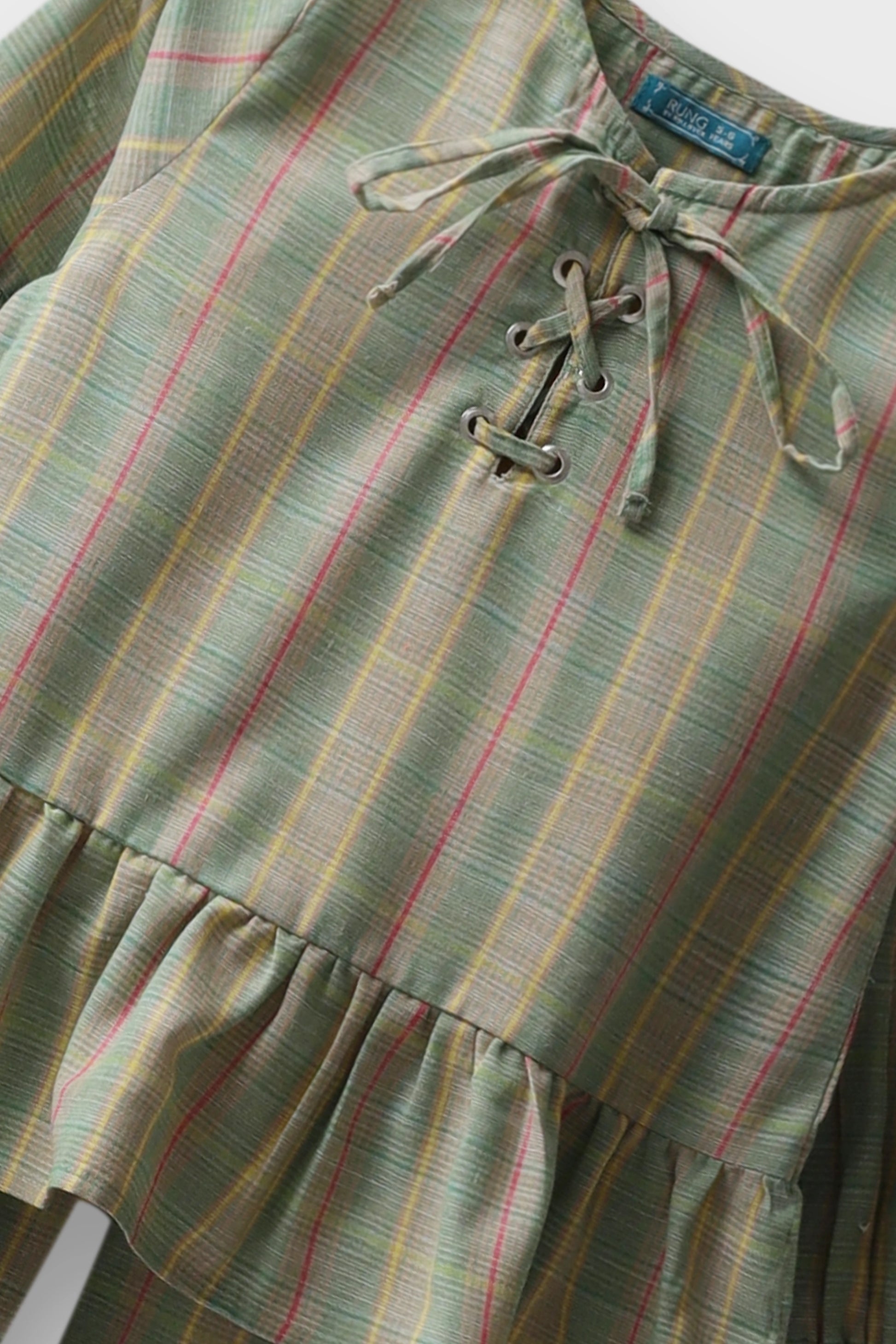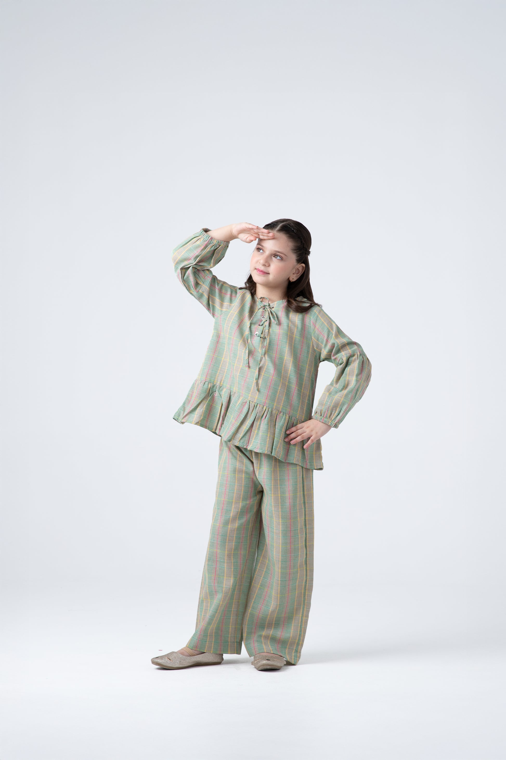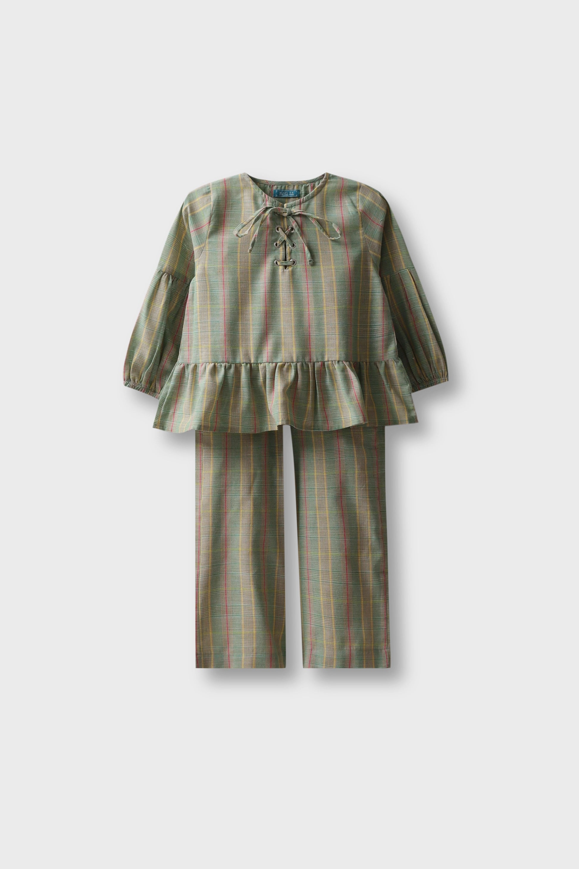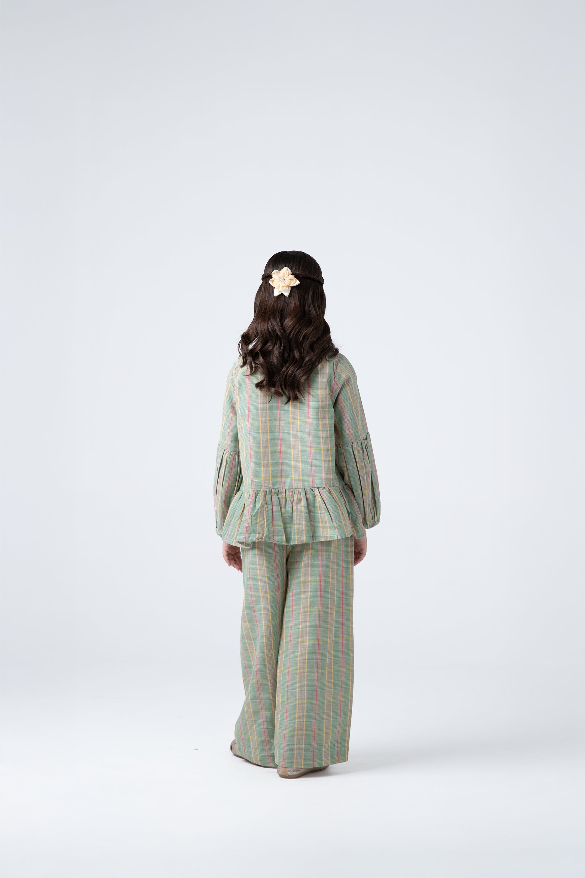 This cotton chambray co-ord set features a gathered peplum top with puff sleeves and matching wide-leg trousers. The soft green base with pink and yellow plaid adds a refreshing touch. Designed for comfort and charm, it’s ideal for picnics, playdates, or casual festive moments.
