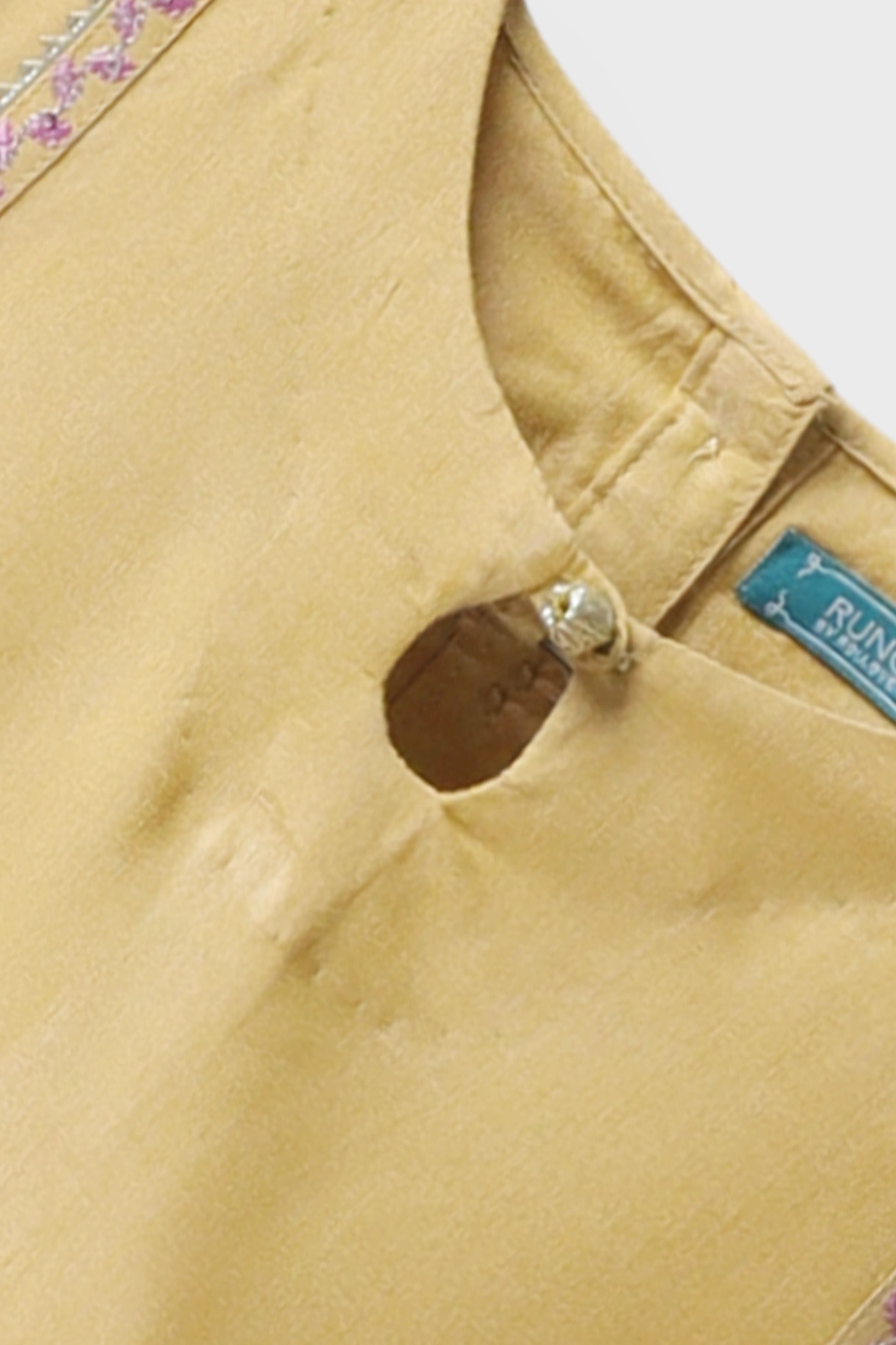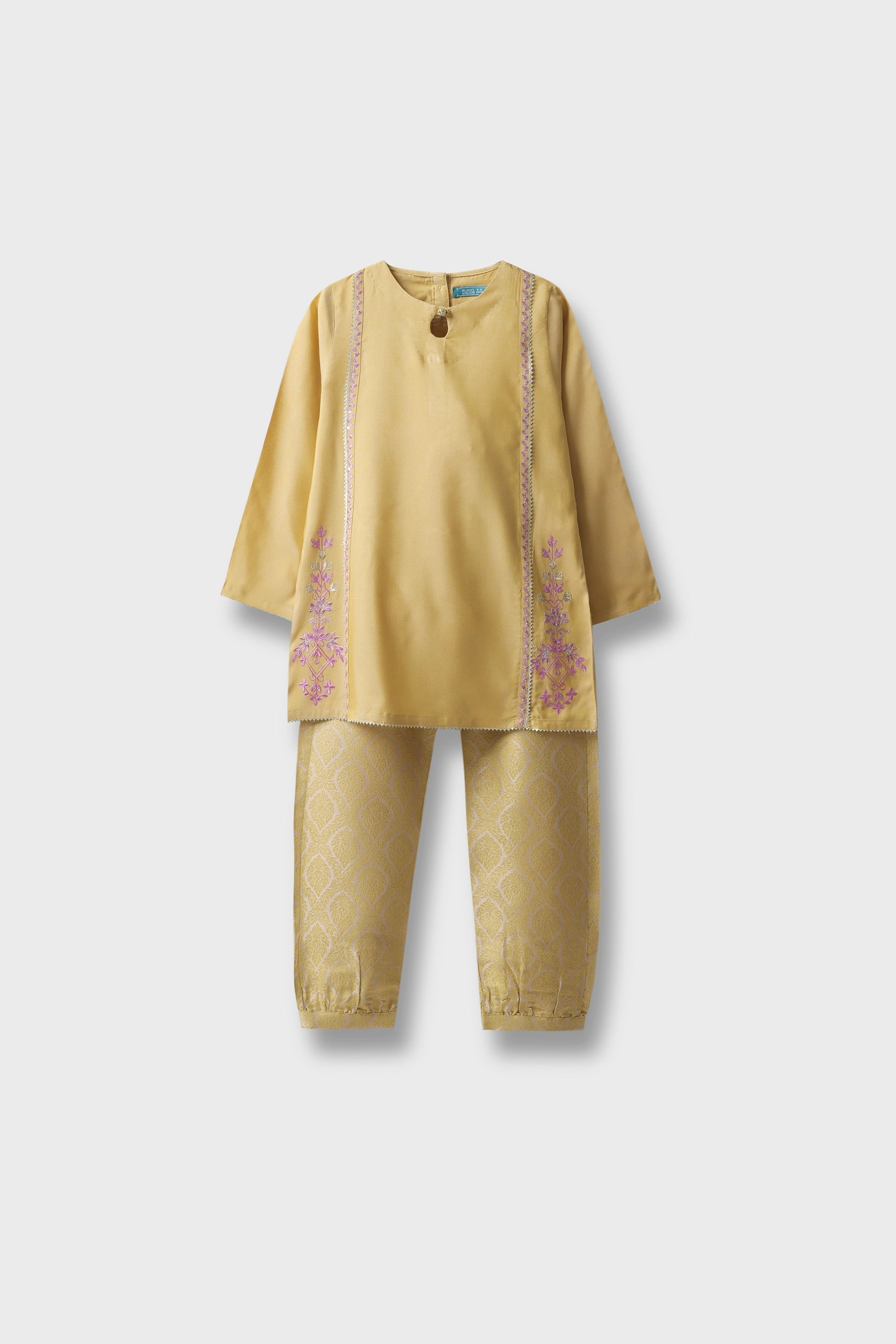 Inspired by traditional finesse, this 2-piece dress in cotton silk and jamawar stands out in a vibrant golden shade. Floral embroidery and refined cuts elevate its look, making it ideal for weddings and formal events. A splendid addition to her wardrobe that celebrates heritage with a modern sparkle.