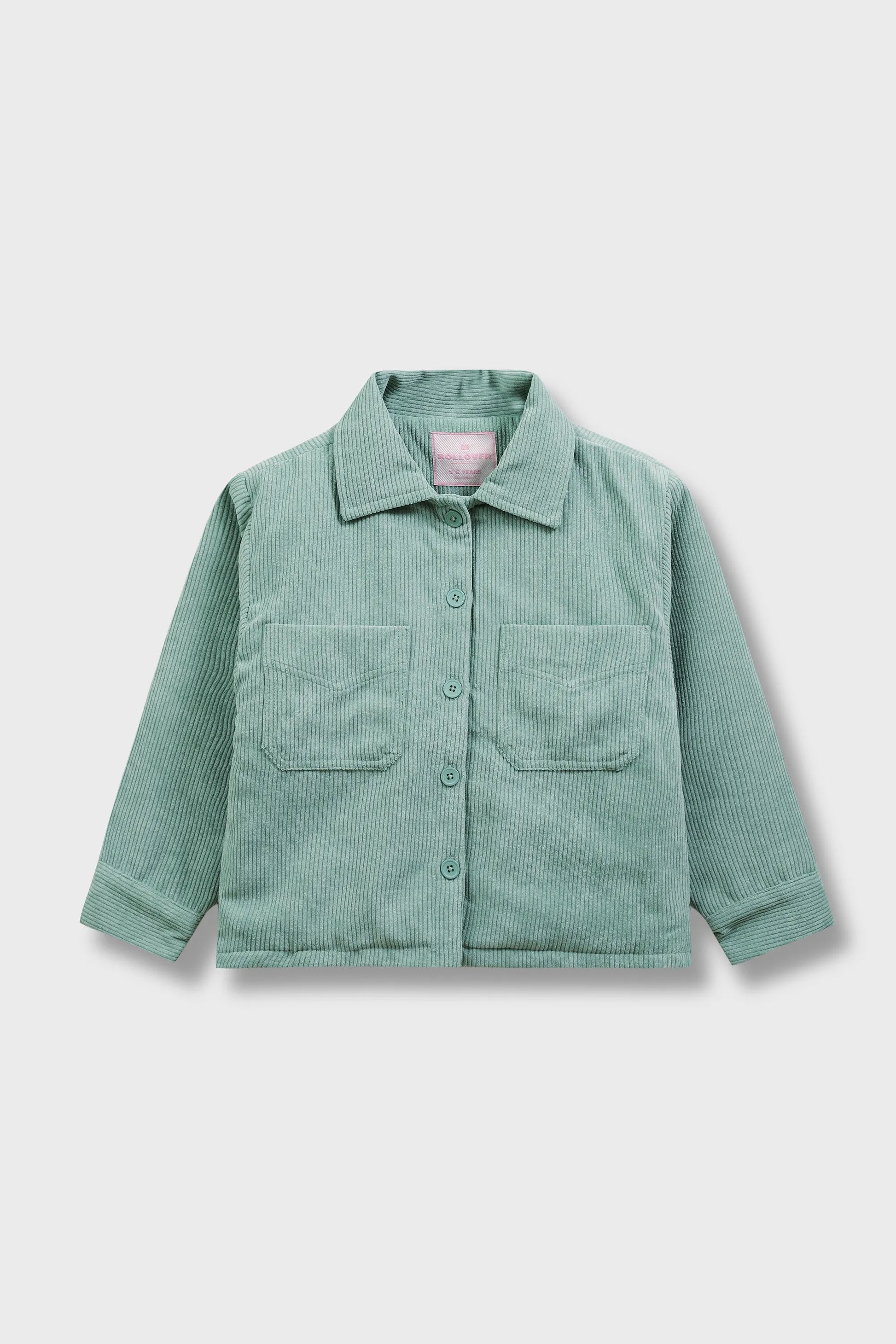 Soft corduroy meets fresh mint vibes in this playful piece. Featuring a classic collar, folded placket with mint buttons, and sharp-edged patch pockets with V-shaped topstitching, it's both crisp and creative. Finished with buttoned cuffs and side slits for comfort, this jacket is made for bright days and cool moods.