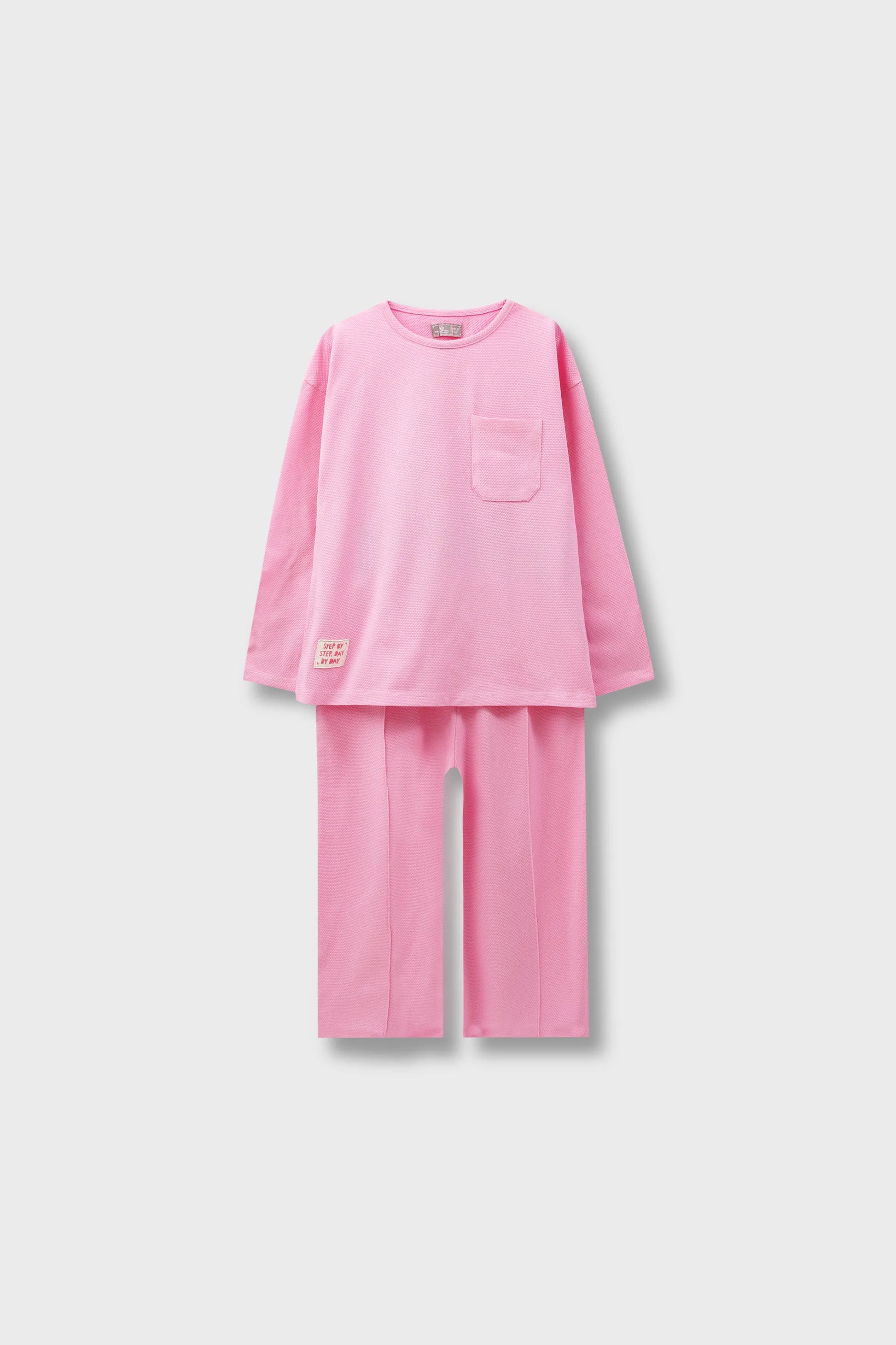 Let her lounge in style with this ultra-soft pink co-ord set. The pique texture offers breathability, while the relaxed silhouette ensures a comfy fit. The adorable “Step by Step” message stitched on the hem inspires positivity, making it an uplifting choice for everyday wear.