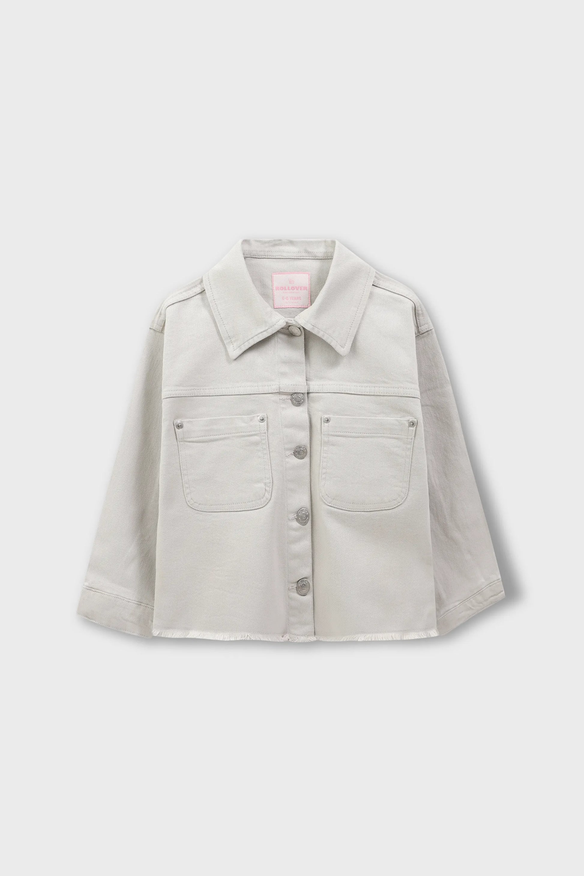 Crafted from durable twill in a soft light beige tone, this jacket offers a polished yet playful look. Featuring metal buttons, flap chest pockets, and a raw fringed hem, it's the perfect outer layer for everyday wear — comfortable, versatile, and designed to move with her through every season.