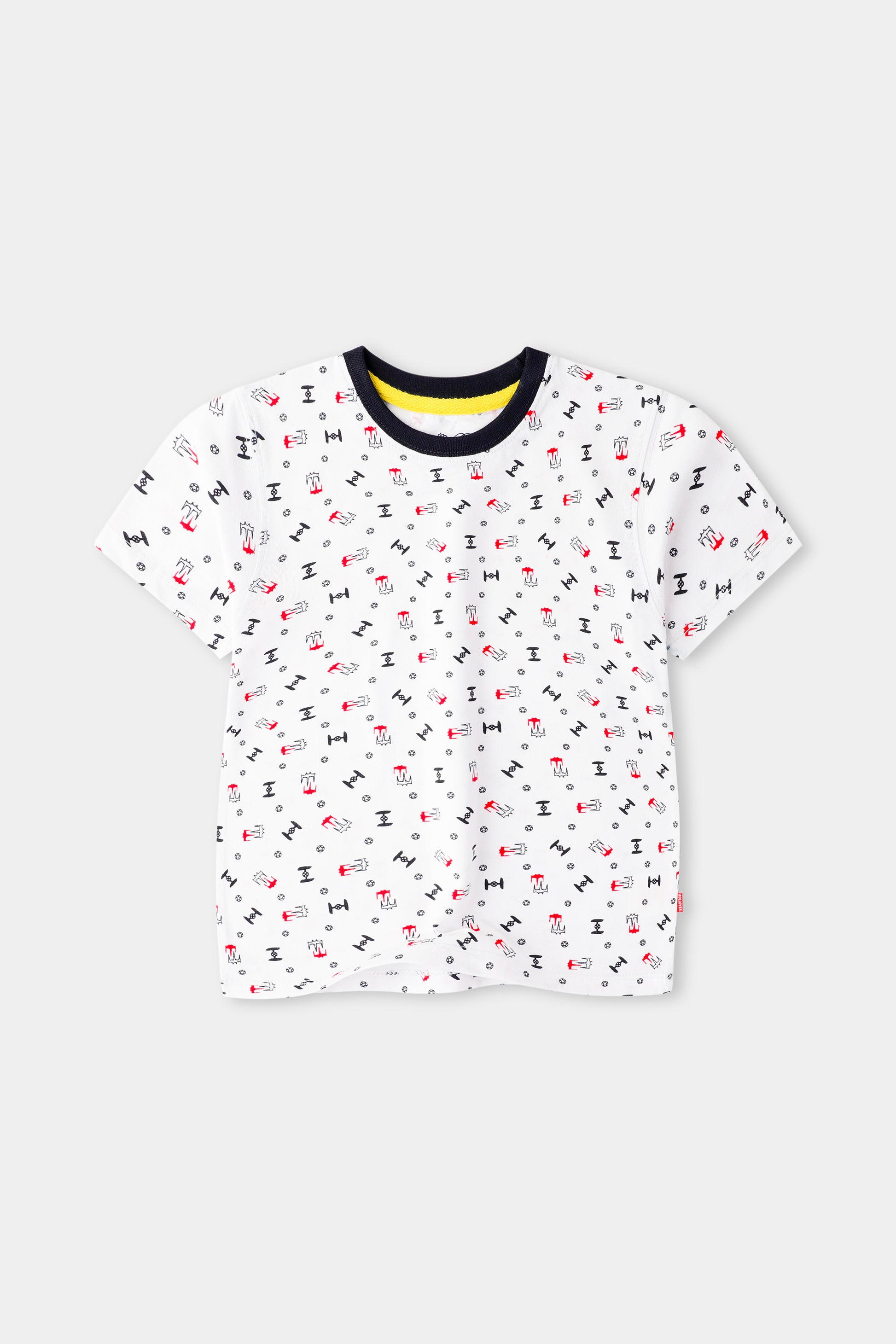 Fuel his energy with this sporty white jersey t-shirt covered in playful mini prints, jerseys, dumbbells, and soccer balls in red, black, and navy. The contrast ribbed neckline adds a bold pop, while the soft cotton knit ensures all-day comfort. Perfect for active days and sporty style lovers.