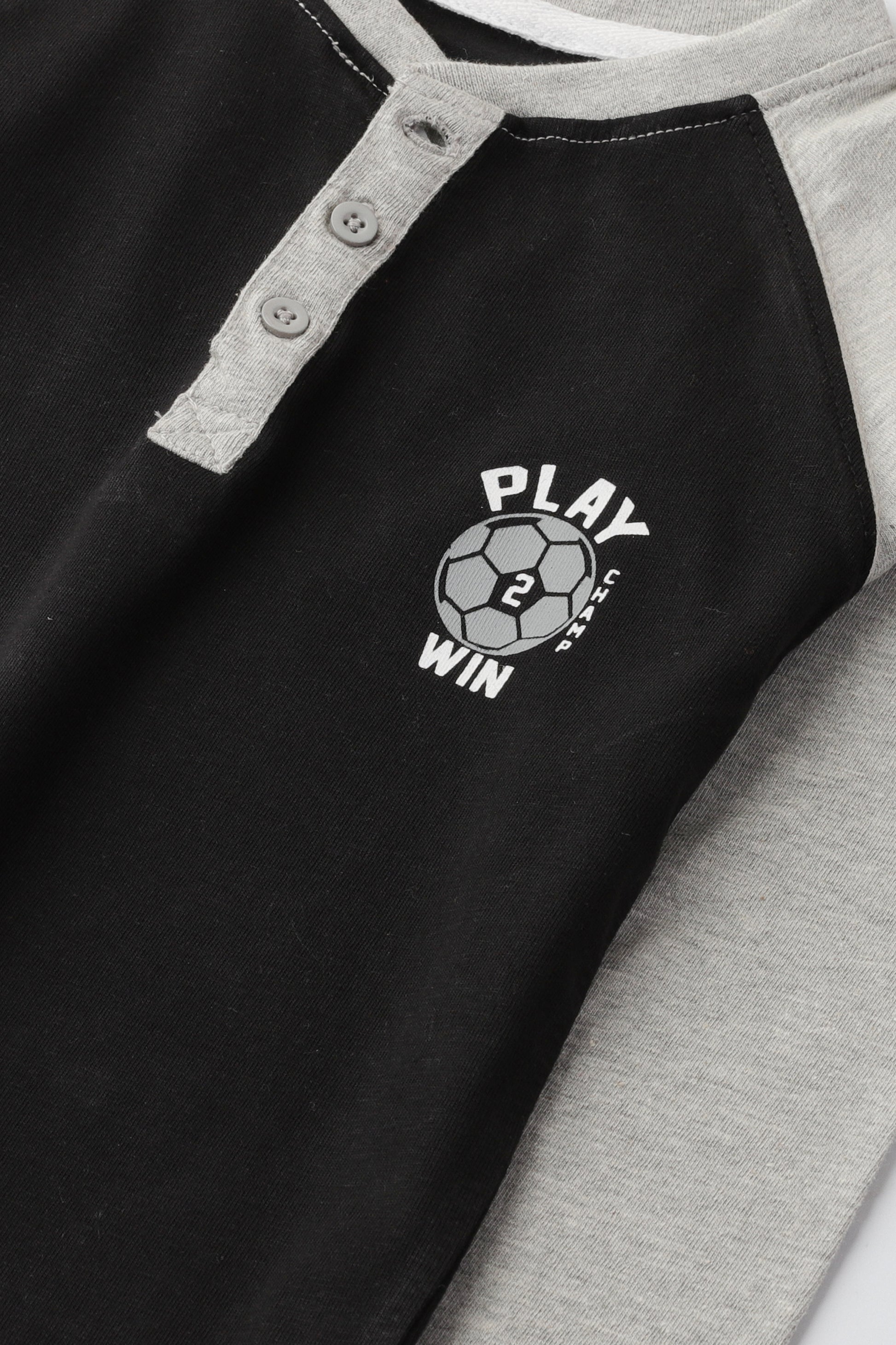 Unleash his inner champion with the Black Play Raglan T-shirt . Made from soft and sturdy heavy jersey fabric, this black Henley t-shirt features eye-catching graphics at the chest. The raglan sleeves offer a relaxed yet athletic fit, while the Henley neckline gives it a classic touch. Ideal for boys who want to show off their winning spirit.