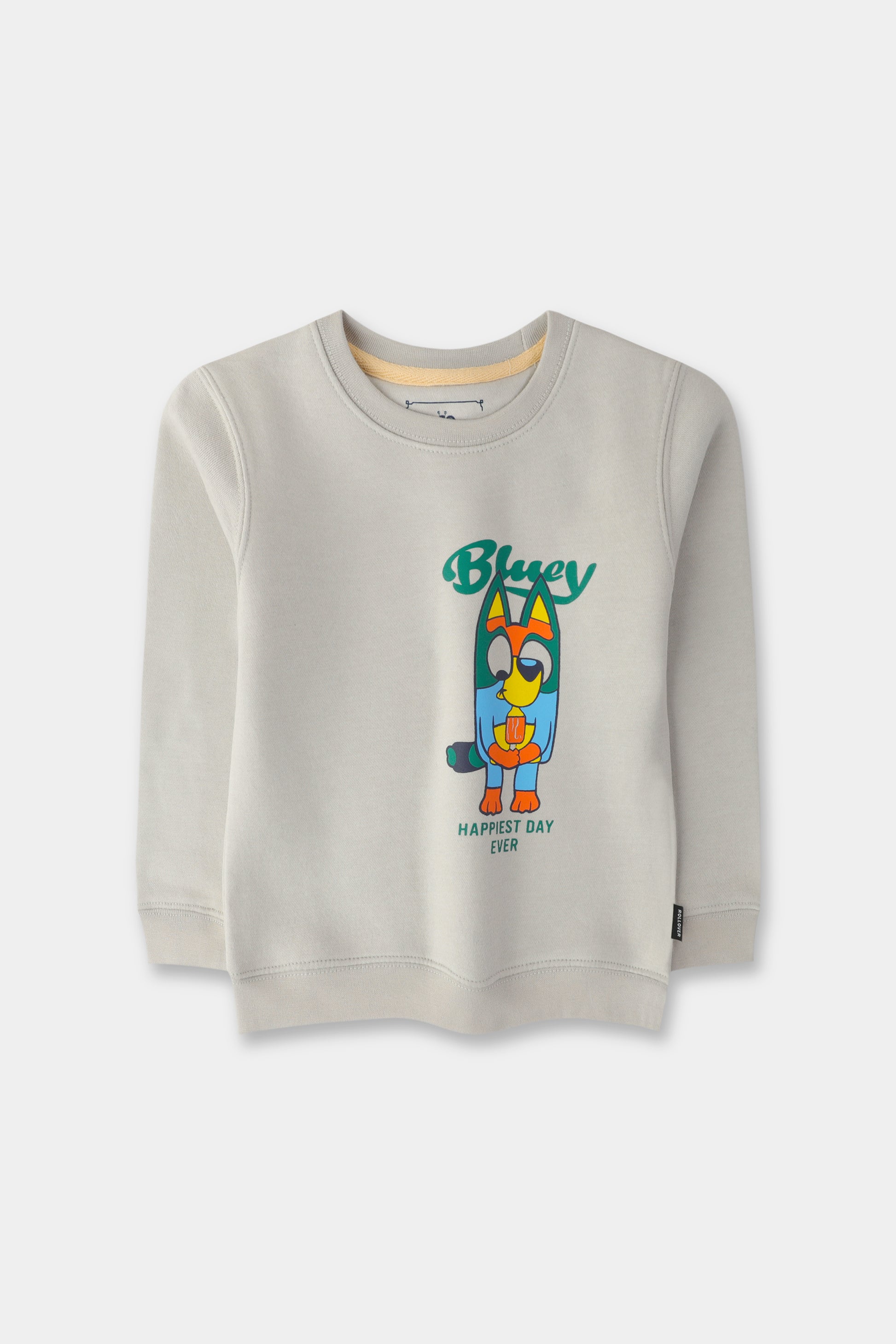 This steel grey fleece sweatshirt features fun Bluey graphics on the front, making it a favorite for fans of the beloved character. Designed for comfort and warmth, it comes with matching ribbed cuffs and hem for a snug fit. Perfect for layering during cooler days, this sweatshirt blends style and coziness, ideal for casual outings or staying cozy at home.