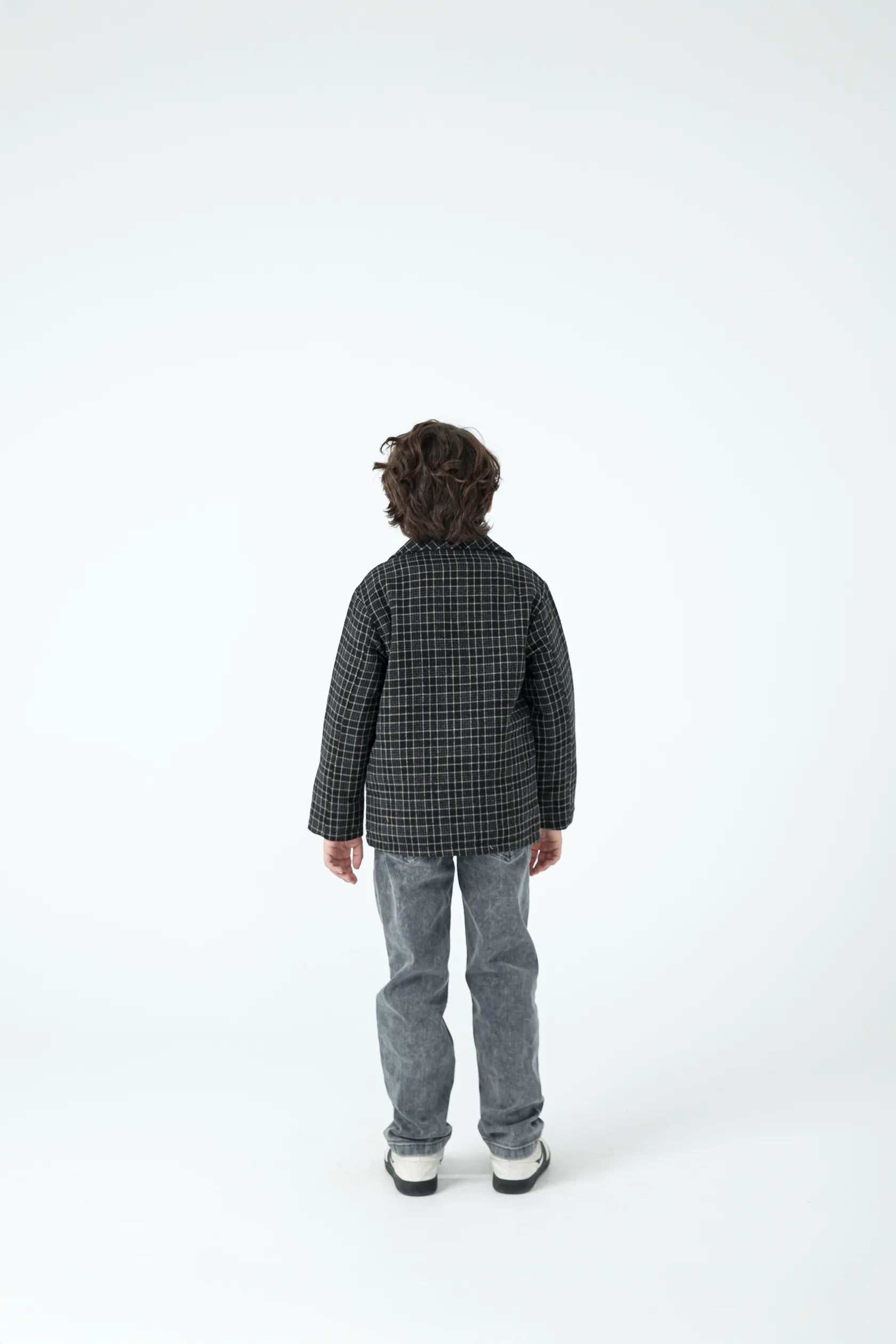 This black checkered boys' jacket is crafted from premium felt fabric for a warm and stylish look. It boasts two functional flapped pockets, a rounded hem, and a smart front button closure. The back sleeve panel detail enhances the fit, making it a versatile choice for both formal and semi-formal occasions.