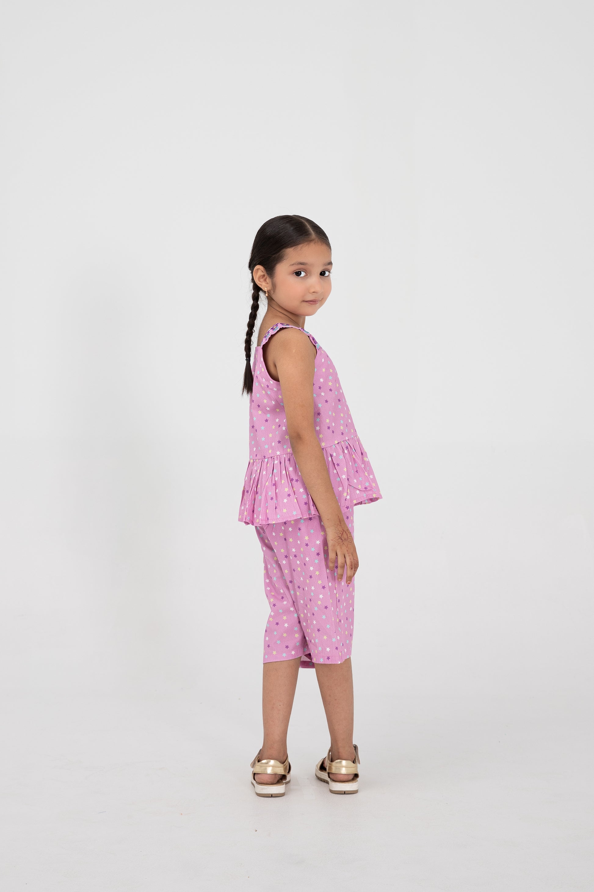 Keep it playful and stylish with this Starry Purple Cotton Co-ord Set! Designed with embroidered straps, a square neckline, and delicate frill gathers, this breezy cotton set is paired with matching knee-length shorts for a fun and fashionable vibe. Perfect for sunny days and happy moments!