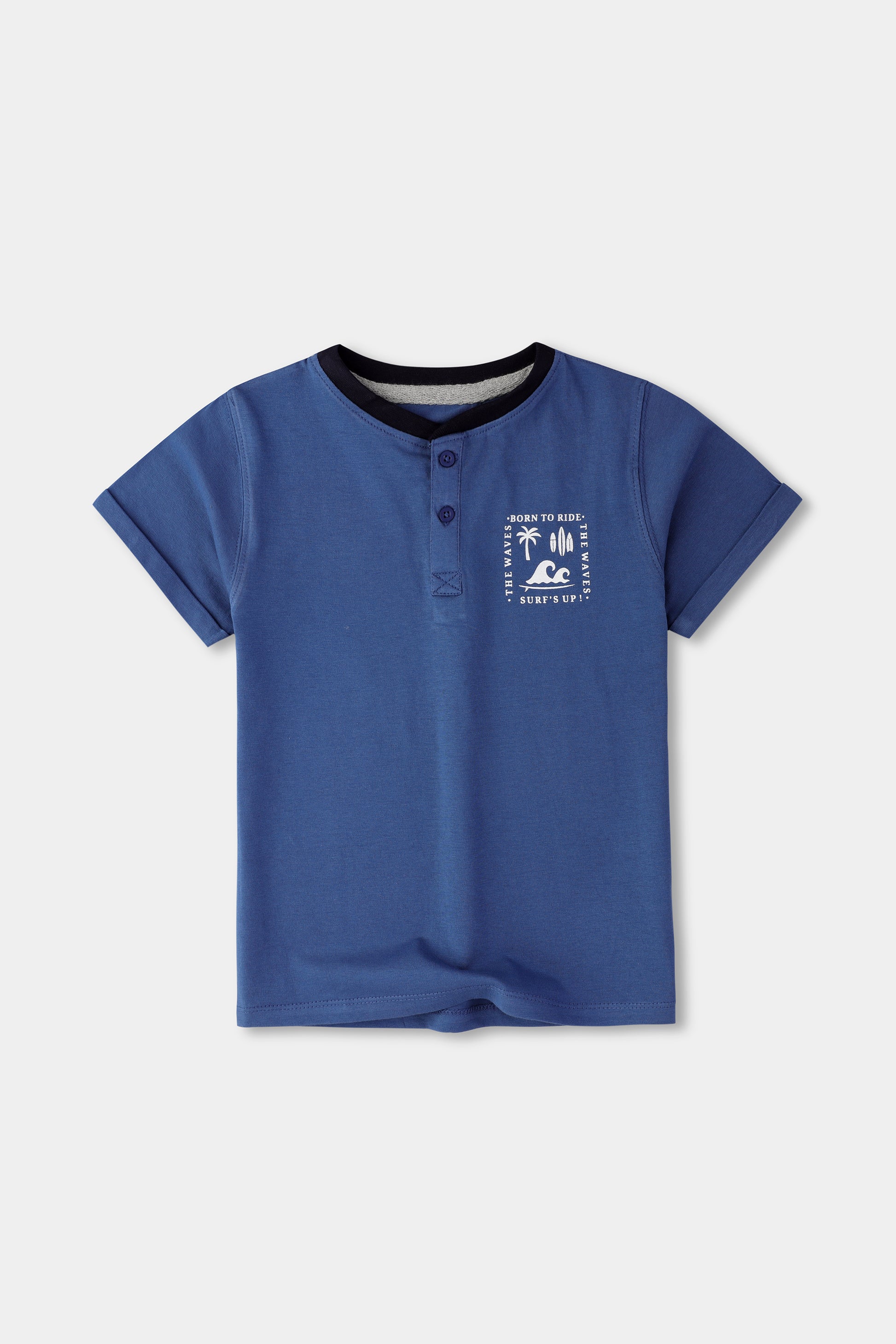 Let his style catch the wave in the Surf’s Up Tee, a comfy cotton jersey shirt in rich indigo blue. Designed with a fun “Born to Ride” surf print, it brings a splash of seaside energy to his wardrobe. Ideal for active boys who love sun, sand, and sporty vibes.