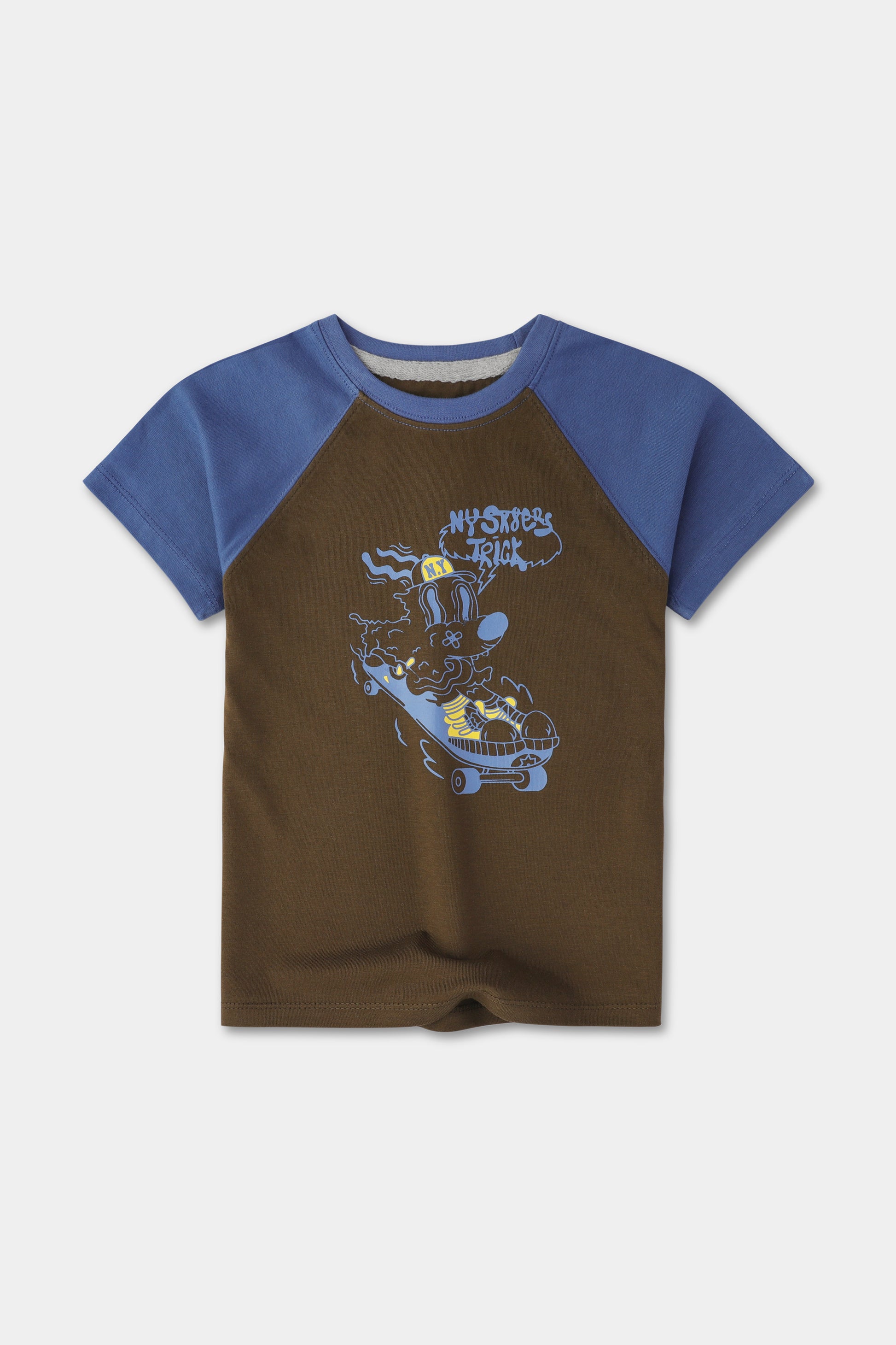 Amp up your little one's street style with this trendy raglan T-shirt. Crafted from soft jersey fabric, it features a bold skater-inspired graphic for a cool urban look. The contrasting sleeves add a sporty touch, making it perfect for active days, casual outings, or just chilling in comfort.