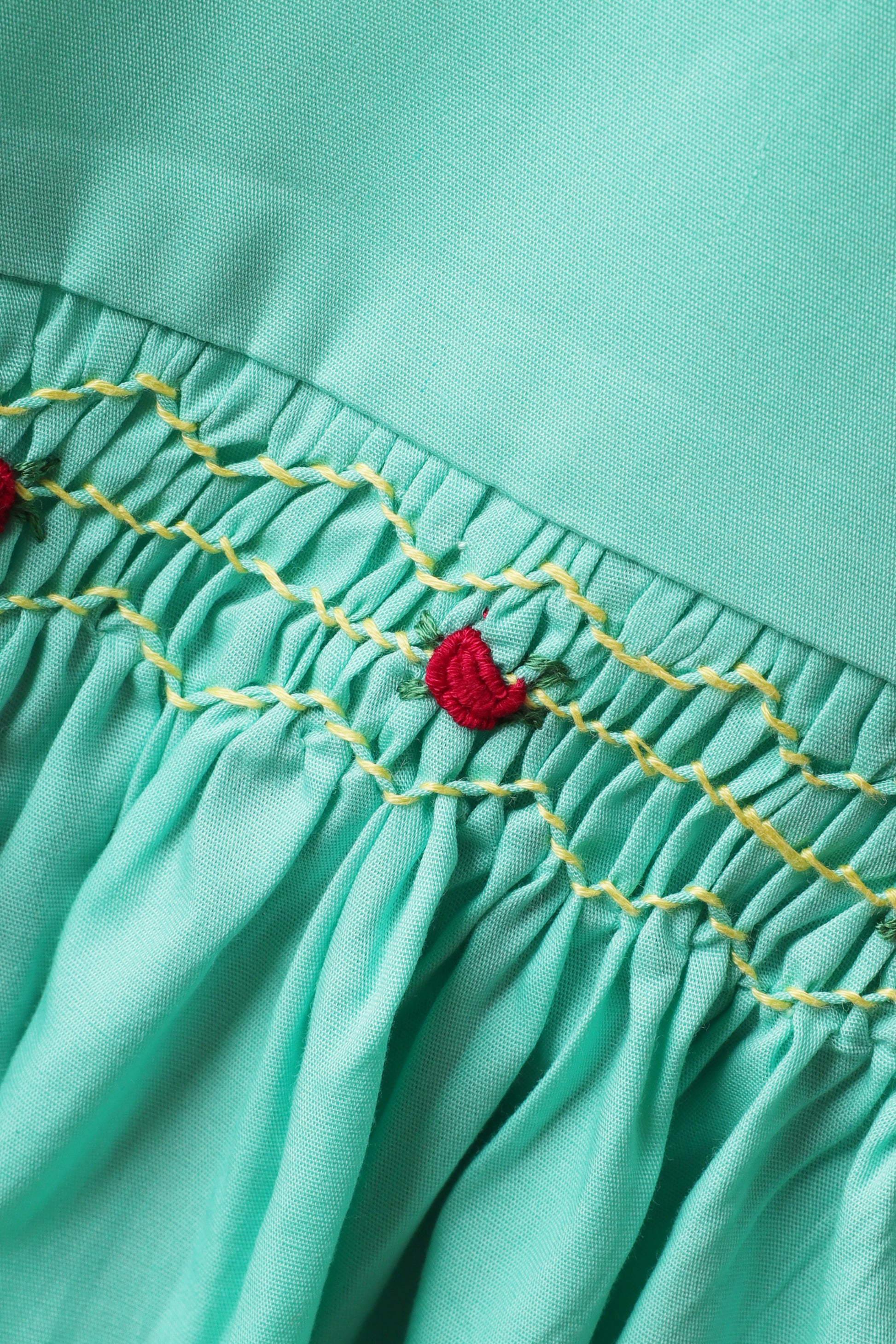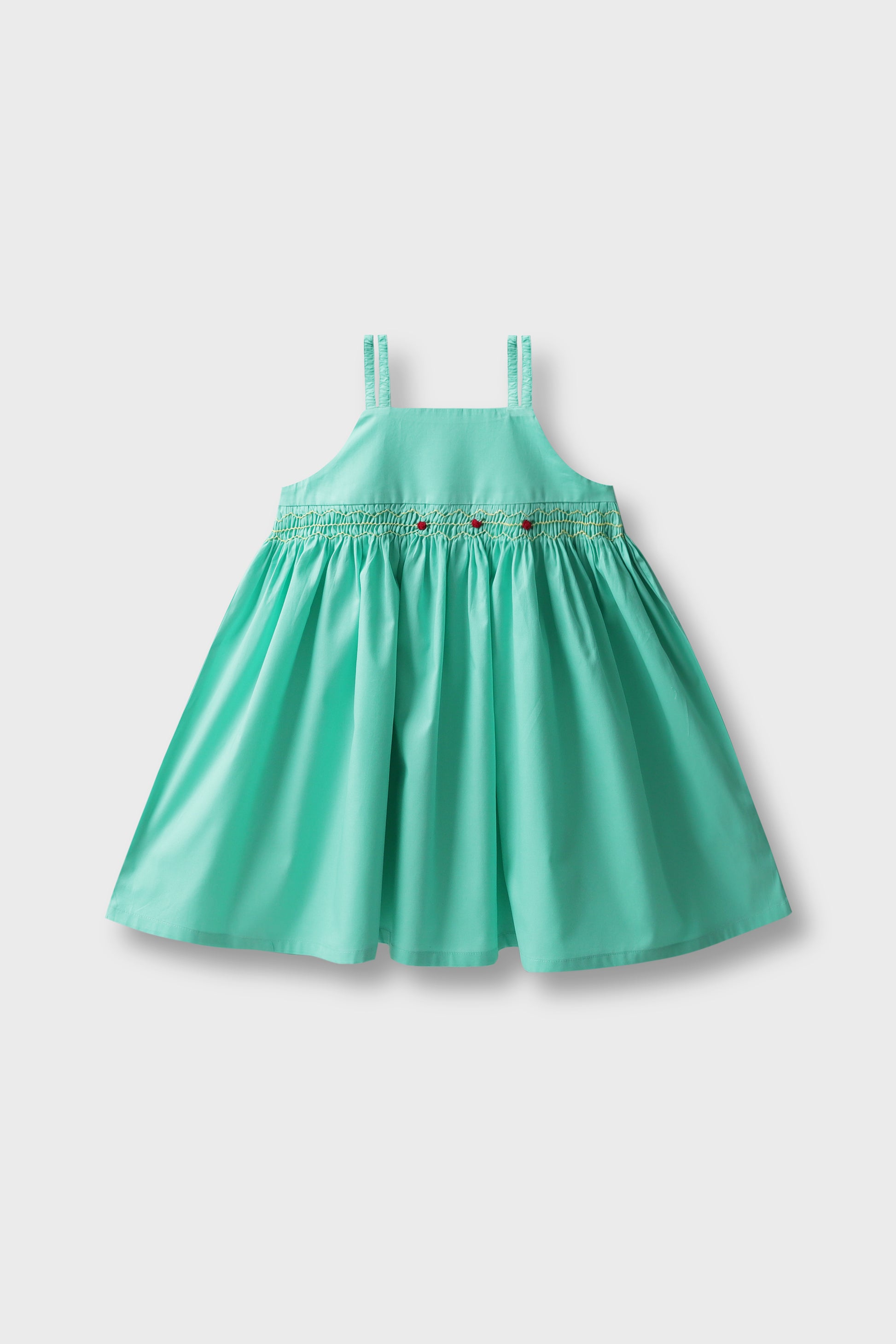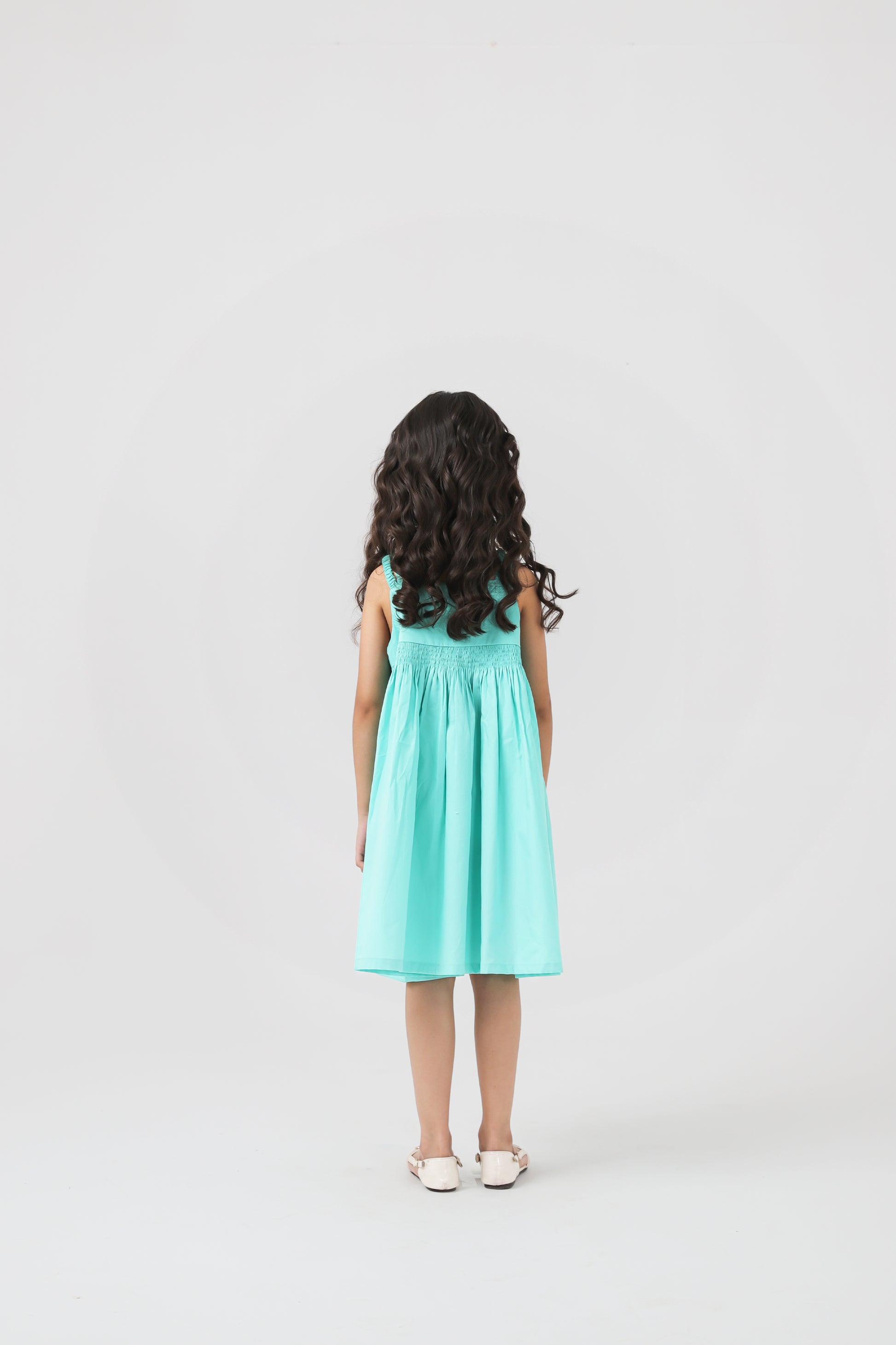 This girls sea green cotton dress features a gathered waist with delicate hand-smocking and subtle embroidered accents. Designed with shoulder straps and a flared silhouette, it offers both comfort and charm. Perfect for sunny days, festive gatherings, and casual outings with a cheerful look.