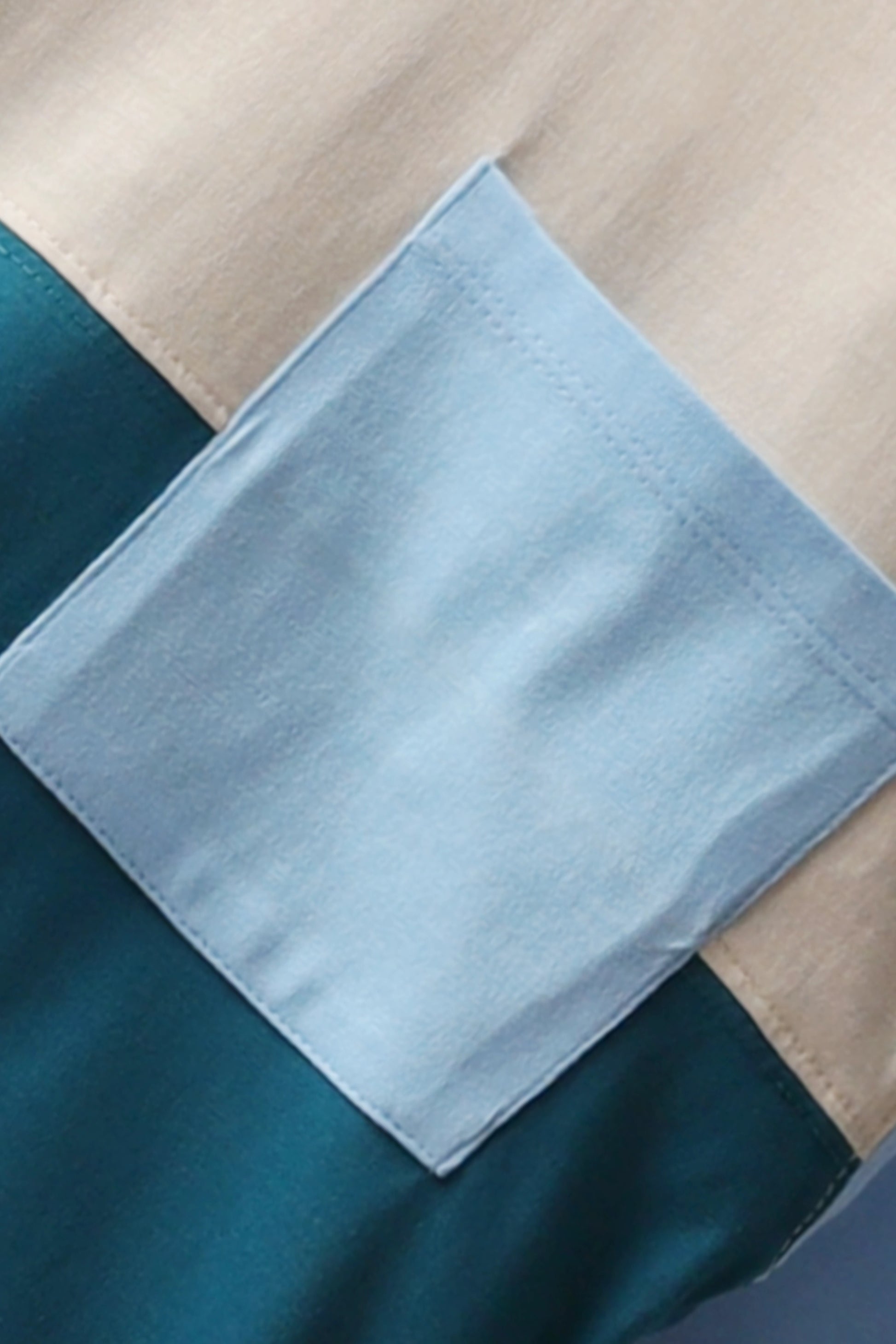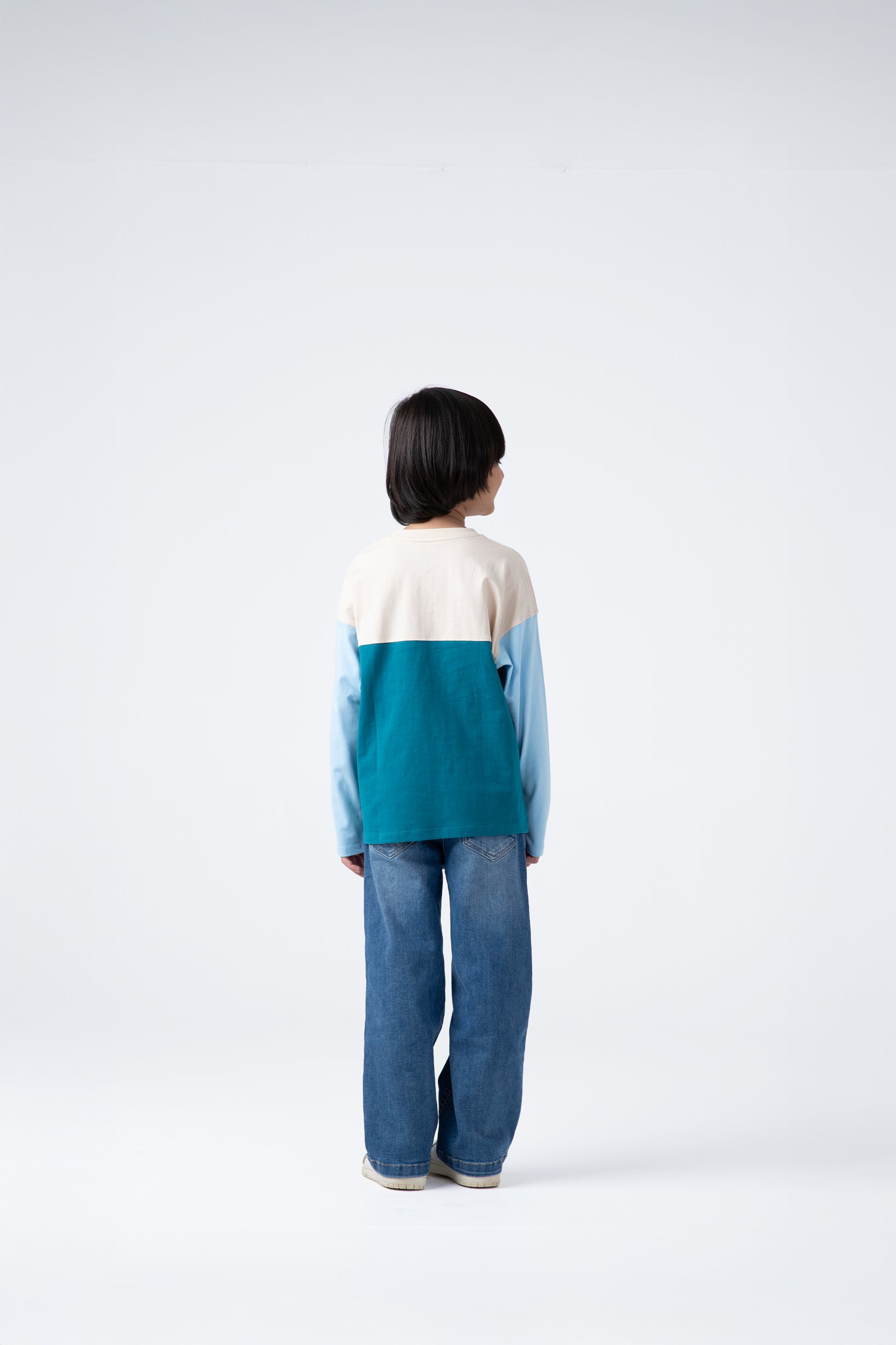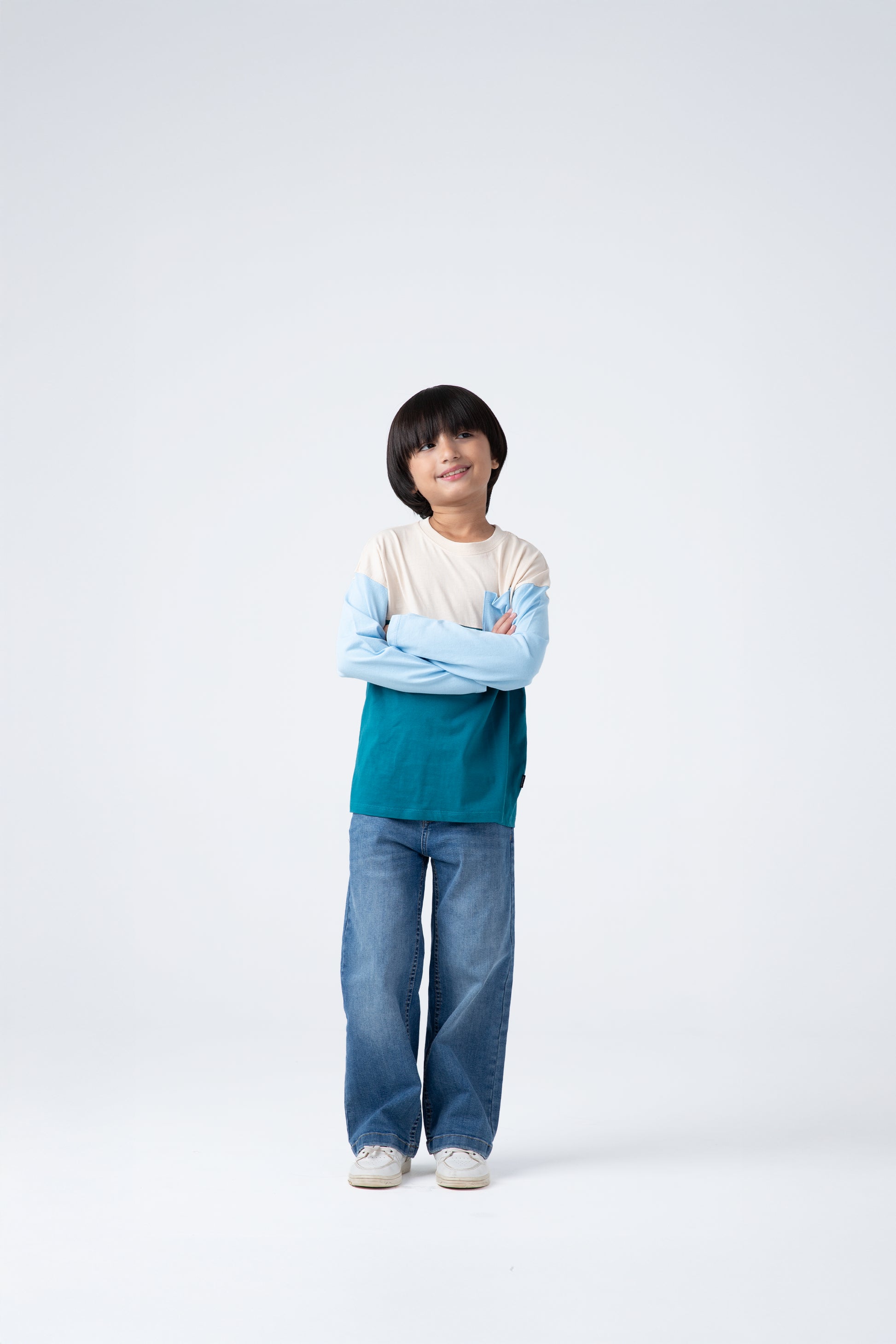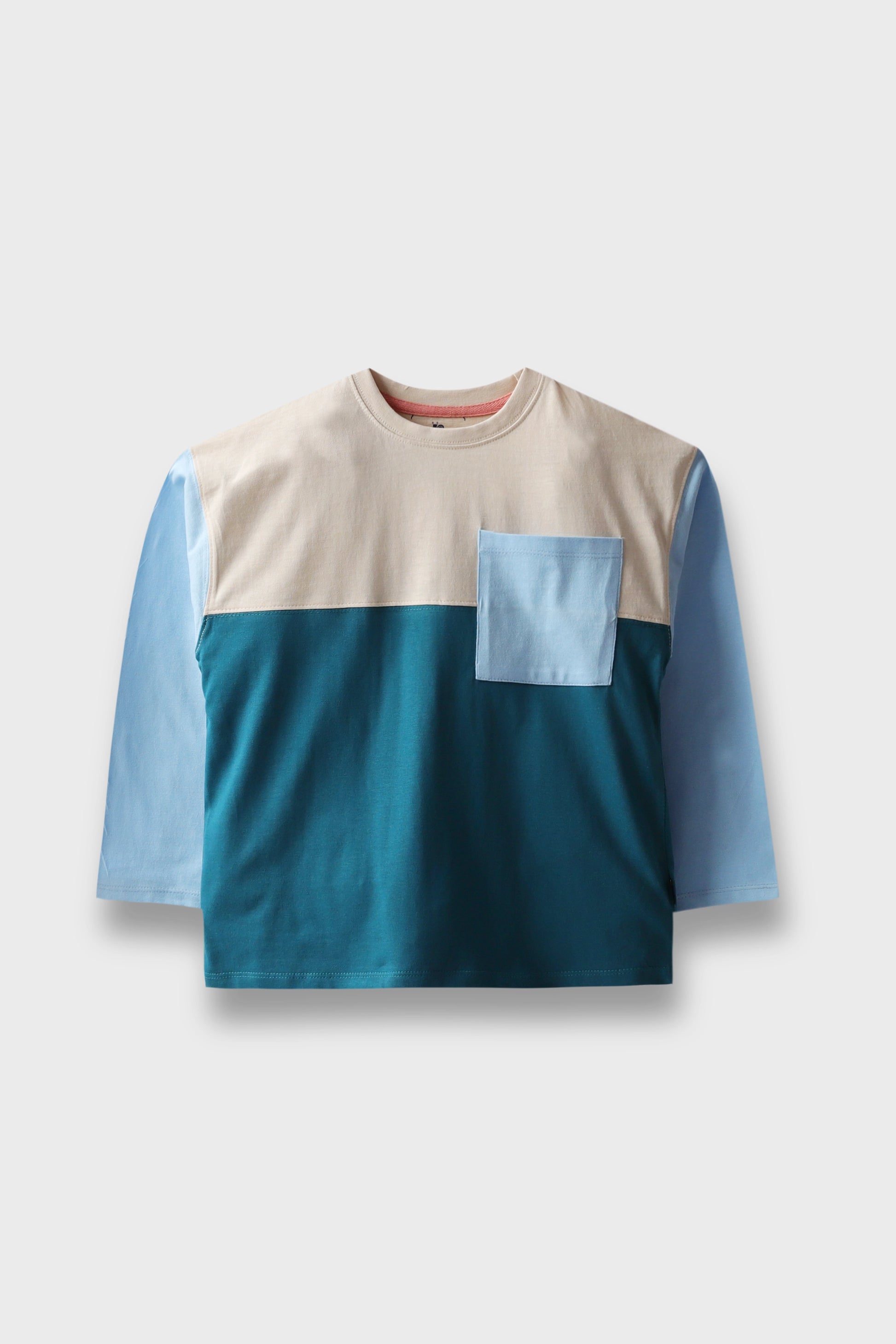 This tri-tone drop shoulder T-shirt combines teal, sky blue, and skin shades in a bold colorblock design. Made from soft heavy jersey, it features a roomy chest pocket and relaxed fit for comfort and style. Perfect for casual days where movement meets standout style.