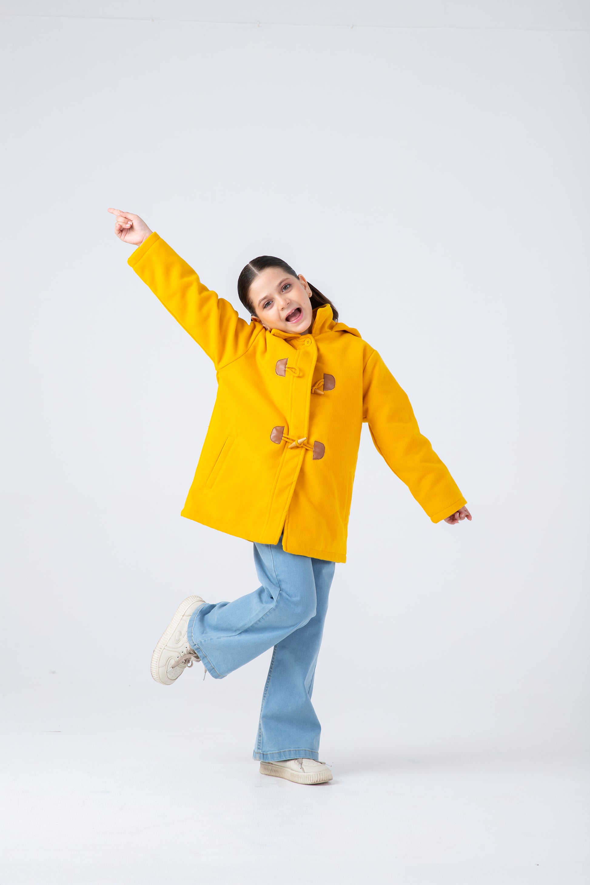 Let her shine on chilly days with this mustard felt coat, featuring a cozy hood and wooden toggle buttons. Its thick felt fabric offers warmth without bulk, while the bright color brings a cheerful vibe. Ideal for layering on brisk mornings, winter strolls, or school commutes.